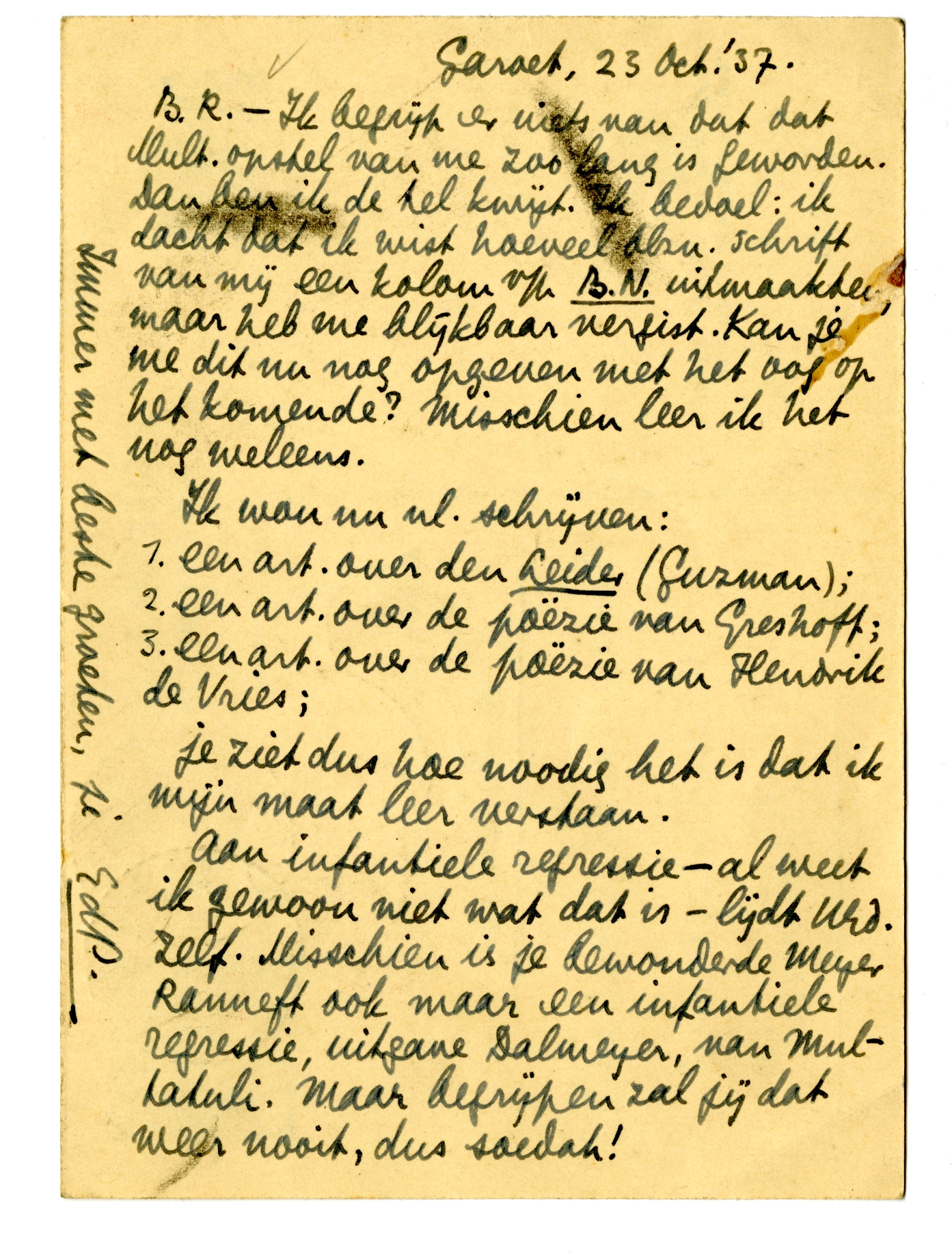 B.R. - Ik begrijp er niets van dat dat Mult. opstel4971 van me zoo lang is geworden. Dan ben ik de tel kwijt. Ik bedoel: ik dacht dat ik wist hoeveel blzn. schrift van mij een kolom v/h B.N. uitmaakten, maar heb me blijkbaar vergist. Kan je me dit nu nog opgeven met het oog op het komende? Misschien leer ik het nog wel eens.