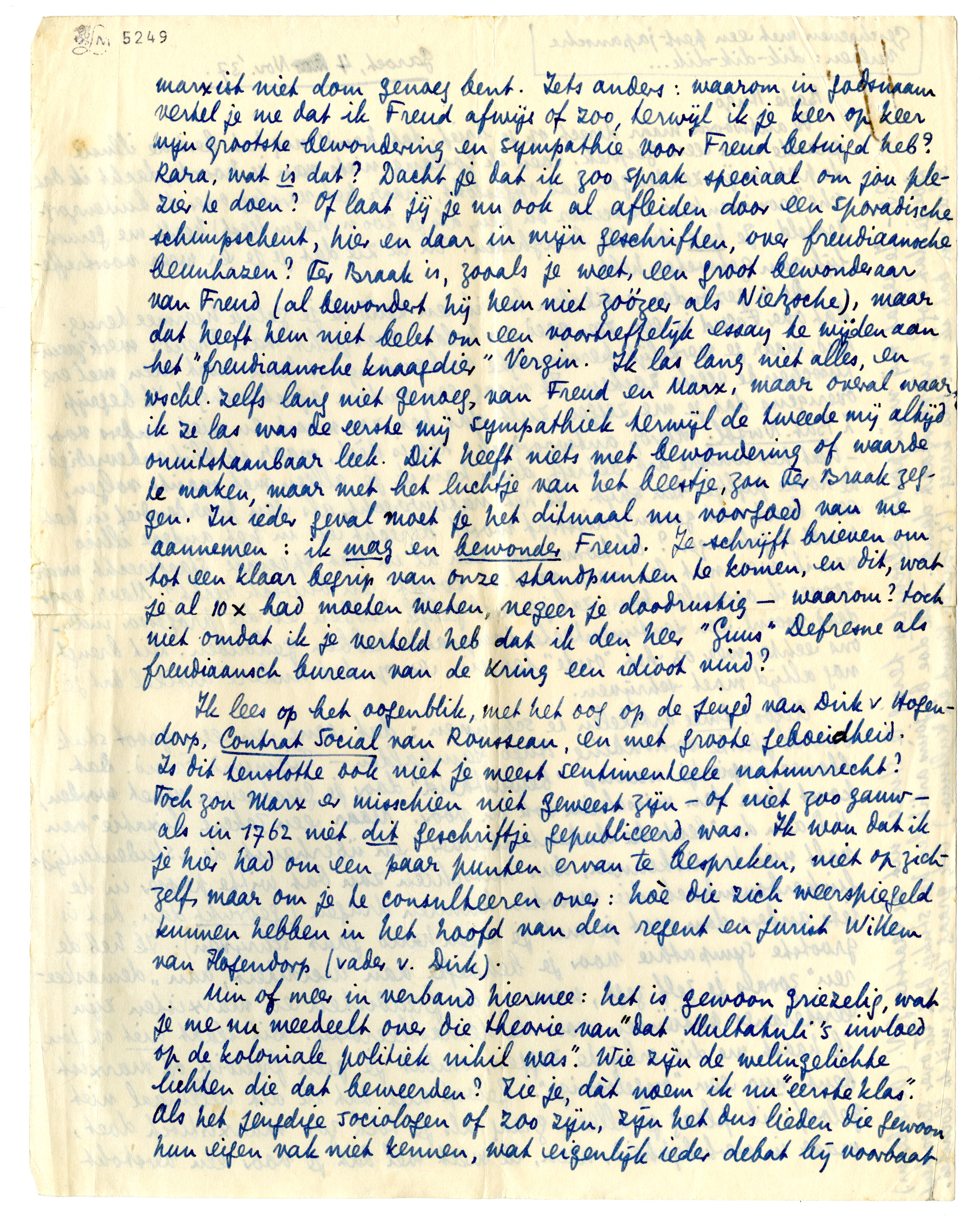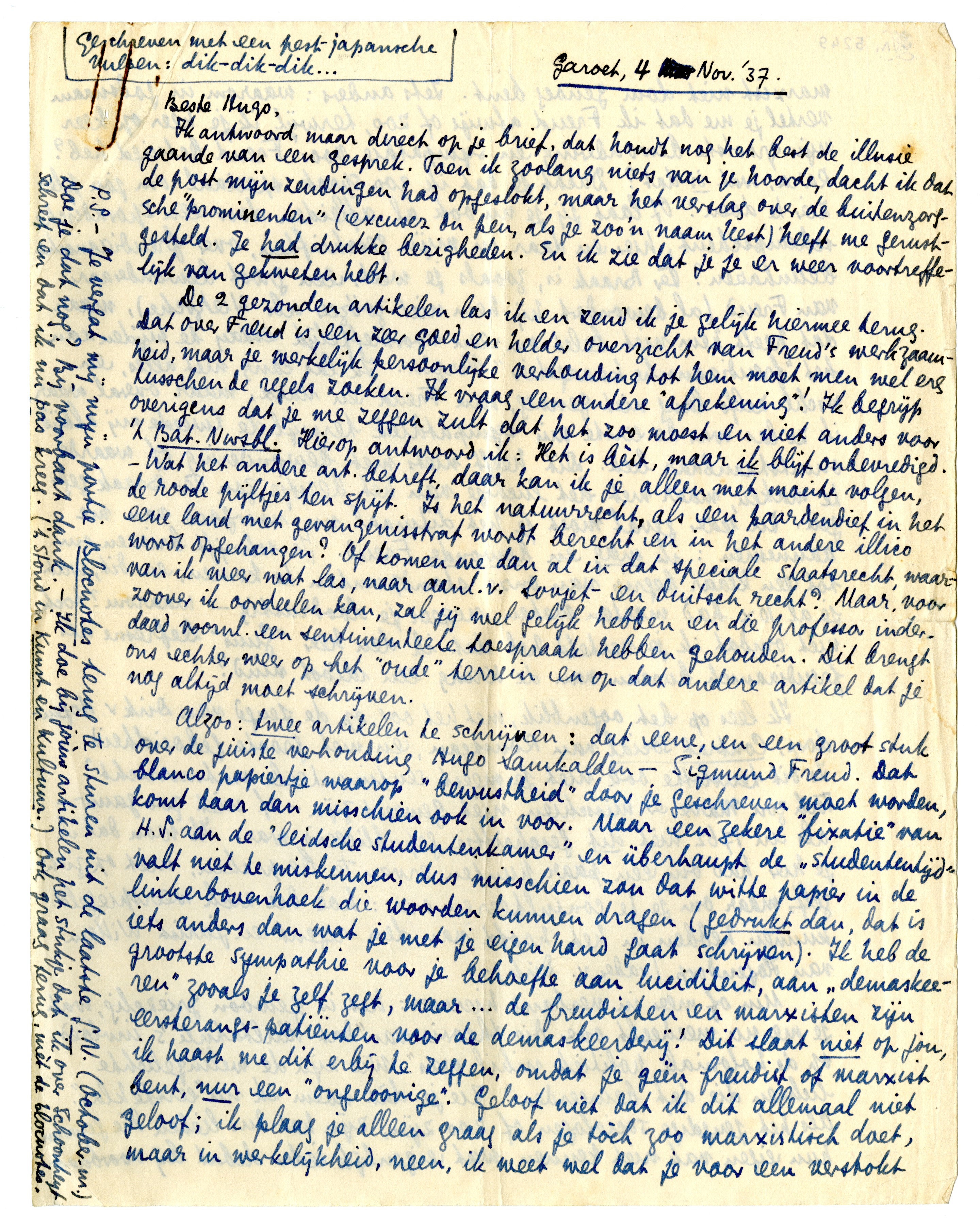 Alzoo: twee artikelen te schrijven: dat eene, en een groot stuk over dejuiste verhouding Hugo Samkalden - Sigmund Freud.5001 Dat blanco papiertje waarop ‘bewustheid’ door je geschreven moet worden, komt daar dan misschien ook in voor. Maar een zekere ‘fixatie’ van H.S. aan de ‘leidsche studentenkamer’ en überhaupt de ‘studententijd’ valt niet te miskennen, dus misschien zou dat witte papier in de linkerbovenhoek die woorden kunnen dragen (gedrukt dan, dat is iets anders dan wat je met je eigen hand gaat schrijven). Ik heb de grootste sympathie voor je behoefte aan luciditeit, aan ‘demaskeeren’ zooals je zelf zegt, maar... de freudisten en marxisten zijn eersterangs-patiënten voor de desmaskeerderij! Dit slaat niet op jou, ik haast me dit erbij te zeggen, omdat je géén freudist of marxist bent, nur een ‘ongeloovige’. Geloof niet dat ik dit allemaal niet geloof; ik plaag je alleen graag als je tòch zoo marxistisch doet, maar in werkelijkheid, neen, ik weet wel dat je voor een verstokt marxist niet dom genoeg bent. Iets anders: waarom in godsnaam vertel je me dat ik Freud afwijs of zoo, terwijl ik je keer op keer mijn grootste bewondering en sympathie voor Freud betuigd heb? Rara, wat is dat? Dacht je dat ik zoo sprak speciaal om jou plezier te doen? Of laat jij je nu ook al afleiden door een sporadische schimpscheut, hier en daar in mijn geschriften, over freudiaansche beunhazen? Ter Braak is, zooals je weet, een groot bewonderaar van Freud (al bewondert hij hem niet zóózeer als Nietzsche), maar dat heeft hem niet belet om een voortreffelijk essay te wijden aan het ‘freudiaansche knaagdier’ Vergin.5002 Ik las lang niet alles, en wschl. zelfs lang niet genoeg, van Freud en Marx, maar overal waar ik ze las was de eerste mij sympathiek terwijl de tweede mij altijd onuitstaanbaar leek. Dit heeft niets met bewondering of waarde te maken, maar met het luchtje van het beestje, zou ter Braak zeggen. In ieder geval moet je ditmaal nu voorgoed van me aannemen: ik mag en bewonder Freud. Je schrijft brieven om tot een klaar begrip van onze standpunten te komen, en dit, wat je al 10 × had moeten weten, negeer je doodrustig - waarom? toch niet omdat ik je verteld heb dat ik den heer ‘Guus’ Defresne als freudiaansch bureau van de Kring een idioot vind?5003