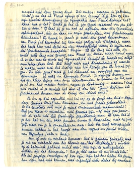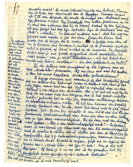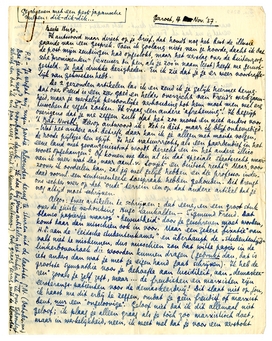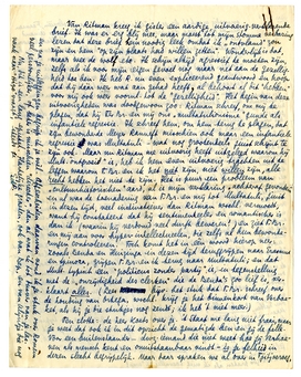 De 2 gezonden artikelen5000 las ik en zend ik je gelijk hiermee terug. Dat over Freud is een zeer goed en helder overzicht van Freud's werkzaamheid, maar je werkelijk persoonlijke verhouding tot hem moet men wel erg tusschen de regels zoeken. Ik vraag een andere ‘afrekening’! Ik begrijp overigens dat je me zeggen zult dat het zoo moest en niet anders voor 't Bat. Nwsbl. Hierop antwoord ik: Het is bèst, maar ik blijf onbevredigd. - Wat het andere art. betreft, daar kan ik je alleen met moeite volgen, de roode pijltjes ten spijt. Is het natuurrecht, als een paardendief in het eene land met gevangenisstraf wordt berecht en in het andere illico wordt opgehangen? Of komen we dan al in dat speciale staatsrecht, waarvan ik weer wat las, naar aanl.v. Sovjet- en duitsch recht? Maar, voor zoover ik oordelen kan, zal jij wel gelijk hebben en die professor inderdaad voornl. een sentimenteele toespraak hebben gehouden. Dit brengt ons echter weer op het ‘oude’ terrein en op dat andere artikel dat je nog altijd moet schrijven.
