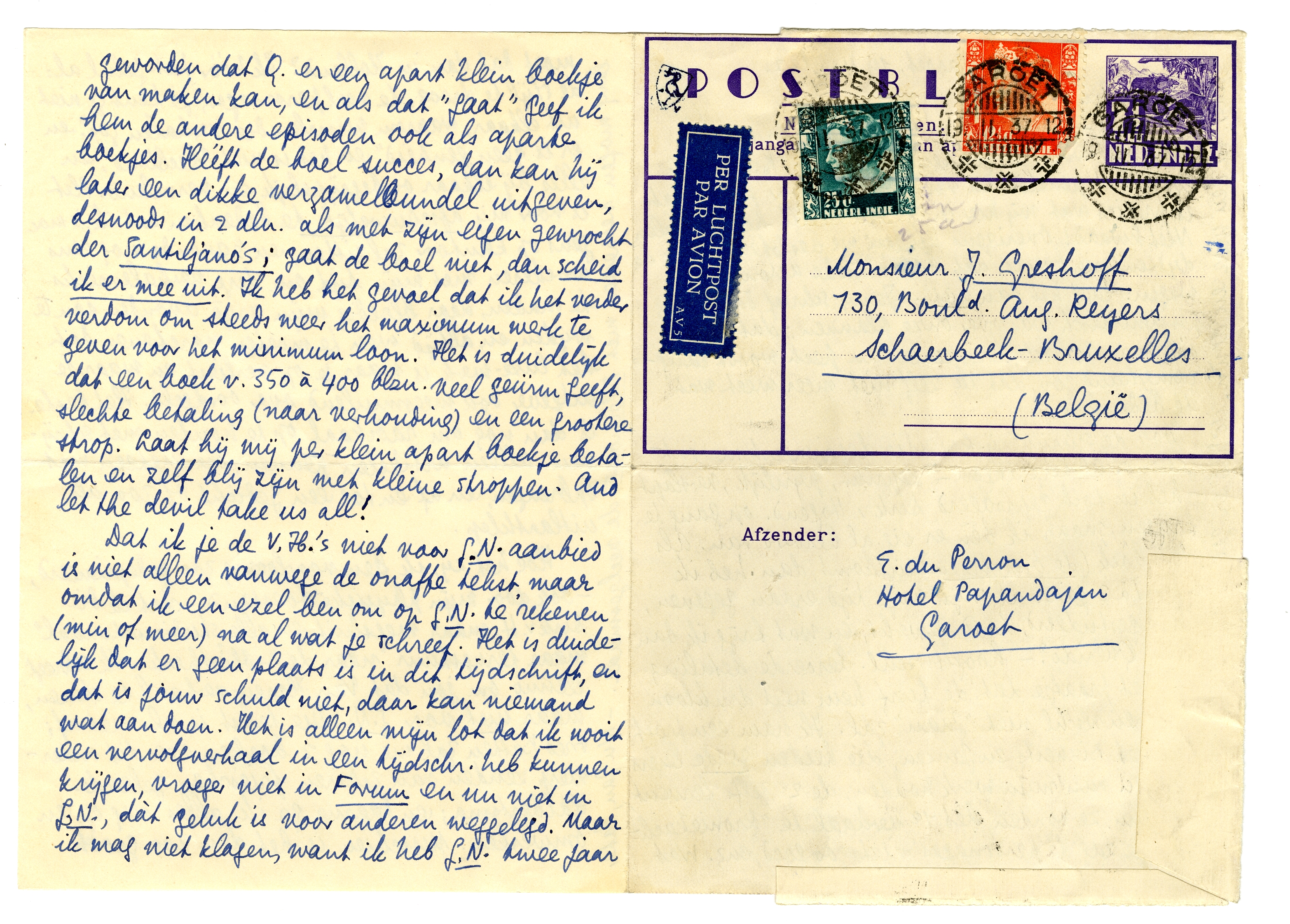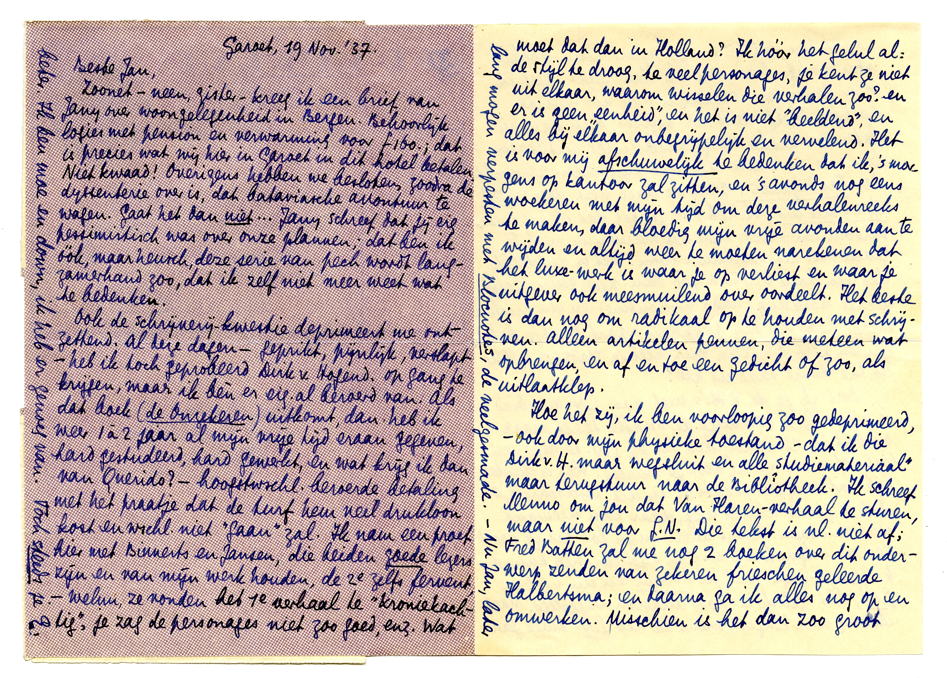 Zoonet - neen, gister - kreeg ik een brief van Jany over woongelegenheid in Bergen. Behoorlijk logies met pension en verwarming voor f 160.; dat is precies wat wij hier in Garoet in dit hotel betalen. Niet kwaad! Overigens hebben we besloten, zoodra de dyssenterie over is,5041 dat bataviasche avontuur te wagen. Gaat het dan niet... Jany schreef dat jij erg pessimistisch was over onze plannen; dat ben ik óók, maar heusch, deze serie van pech wordt langzamerhand zoo, dat ik zelf niet meer weet wat te bedenken.