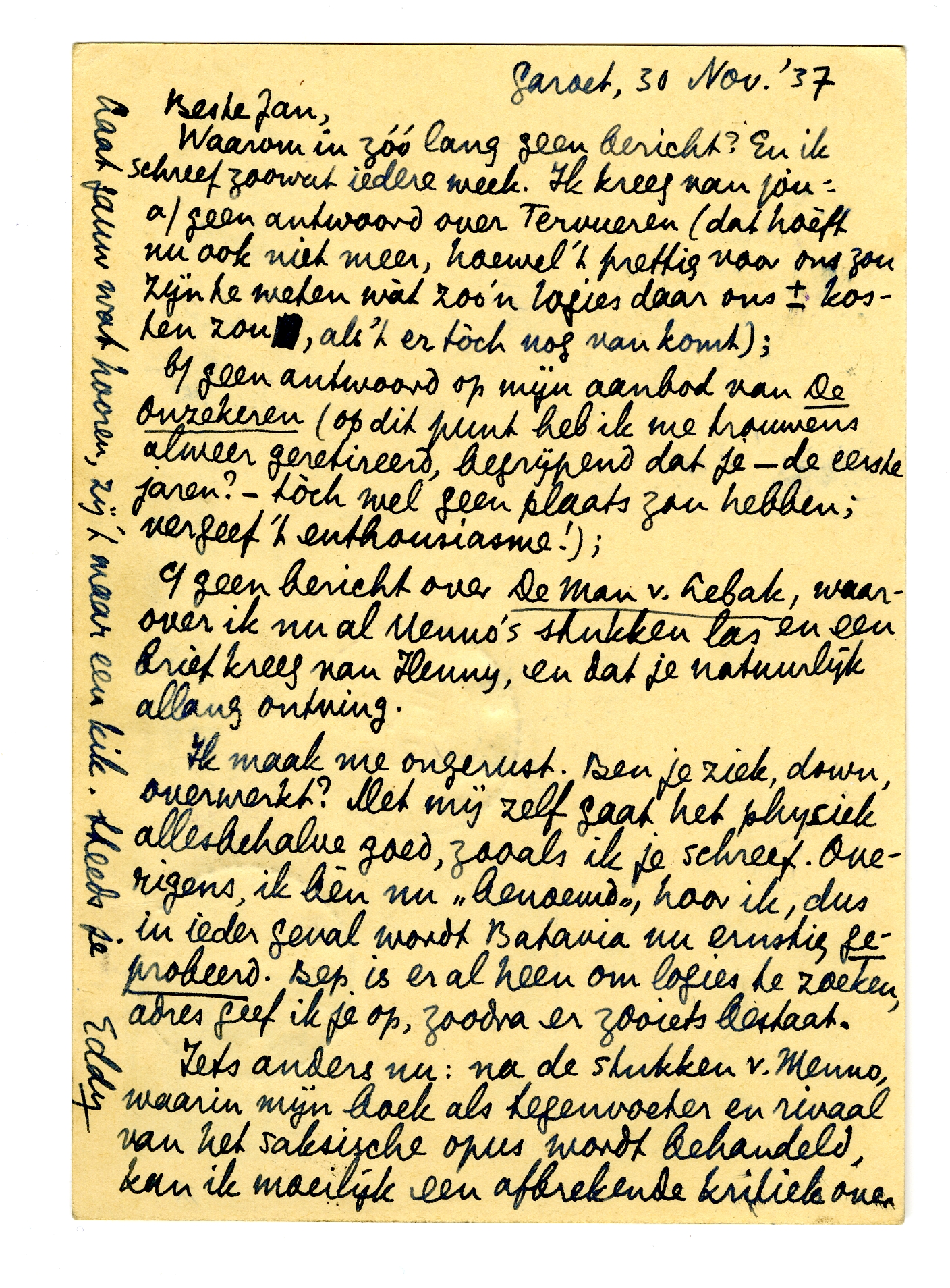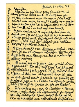Ik maak me ongerust. Ben je ziek, down, overwerkt? Met mij zelf gaat het physiek allesbehalve goed, zooals ik je schreef. Overigens, ik bèn nu ‘benoemd’, hoor ik, dus in ieder geval wordt Batavia nu ernstig geprobeerd. Bep is er al heen om logies te zoeken, adres geef ik je op, zoodra er zooiets bestaat.