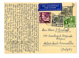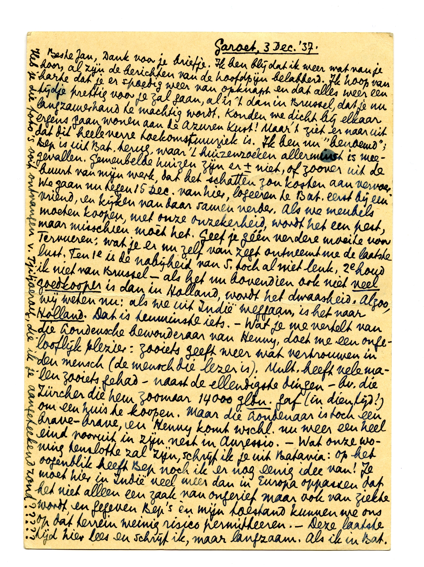 Beste Jan, Dank voor je briefje. Ik ben blij dat ik weer wat van je hoor, al zijn de berichten van de hoofdpijn belabberd. Ik hoop van harte dat je er spoedig weer van opknapt en dat alles weer een tijdje prettig voor je zal gaan, al is 't dan in Brussel, dat je nu langzamerhand te machtig wordt. Konden we dicht bij elkaar ergens gaan wonen aan de Azuren Kust! Maar 't ziet er naar uit dat dit heele verre toekomstmuziek is. Ik ben nu ‘benoemd’; Bep is uit Bat. terug, waar 't huizenzoeken allerminst is meegevallen. Gemeubelde huizen zijn er ± niet, of zoover uit de buurt van mijn werk, dat het schatten zou kosten aan vervoer. We gaan nu tegen 15 Dec. van hier, logeeren te Bat. eerst bij een vriend, en kijken vandaar samen verder. Als we meubels moeten koopen, met onze onzekerheid, wordt het een pest, maar misschien moèt het. Geef je géén verdere moeite voor Tervueren; wat je er nu zelf van zegt ontneemt me de laatste lust. Ten 1e is de nabijheid van S. toch al niet leuk, 2e houd ik niet van Brussel - als het nu bovendien ook niet veel goedkooper is dan in Holland, wordt het dwaasheid. Alzoo, wij weten nu: als we uit Indië weggaan, is het naar Holland. Dat is tenminste iets. - Wat je me vertelt van die Londensche bewonderaar van Henny,5098 doet me een ongelooflijk plezier: zooiets geeft weer wat vertrouwen in den mensch (de mensch die lezer is). Mult. heeft vele malen zooiets gehad - naast de ellendigste dingen - bv. die Zürcher die hem zoomaar 14000 gldn. gaf (in dien tijd!) om een huis te koopen. Maar die Londenaar is toch een brave-brave, en Henny komt wschl. nu weer een heel eind vooruit in zijn nest in Auressio.5099 - Wat onze woning tenslotte zal zijn, schrijf ik je uit Batavia: op het oogenblik heeft Bep noch ik er nog eenig idee van! Je moet hier in Indië veel meer dan in Europa oppassen dat het niet alleen een zaak van ongerief maar ook van ziekte wordt, en gegeven Bep's èn mijn toestand kunnen we ons op dat terrein weinig risico permitteeren. - Deze laatste tijd hier lees en schrijf ik, maar langzaam. Als ik in Bat. wat gewend zal zijn (de eerste tijd zal ik wel geheel uit mijn doen gebracht worden door werk, klimaat enz.), hoop ik mijn verhaal v. Dirk v. Hogendorp te hervatten. Ik vind 't overigens gek dat je met geen woord reageerde op al wat ik je schreef over De Onzekeren in verband met Groot-Ned. of op zichzelf beschouwd. Maar 't zij zoo. - Ik schrijf nu voorloopig niet meer, tenzij ik een brief van je krijg waarop geantwoord moet worden; anders laat ik je pas weer uit Bat. hooren hoe 't daar gaat. - Ons adres daar is: c/o Dr. L.F. Jansen, Hôtel des Galeries, Batavia C. - dat is in ieder geval veilig. - Nu, Jan, 't beste met alles, je gezondheid in de eerste plaats. Hartelijke groeten aan Aty en de jongens, ook van Bep, een hand van steeds je