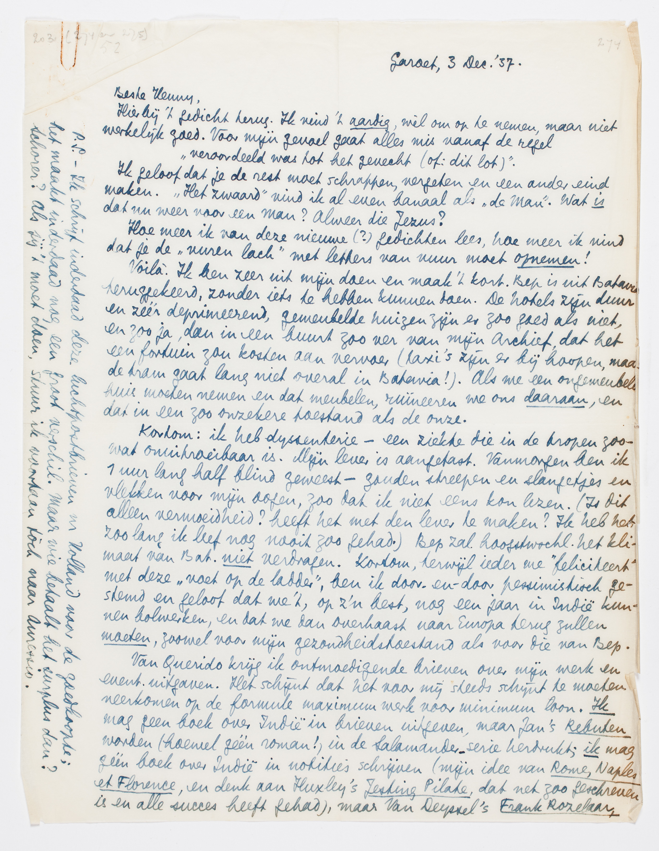Kortom: ik heb dyssenterie - een ziekte die in de tropen zoowat onuitroeibaar is. Mijn lever is aangetast. Vanmorgen ben ik 1 uur lang halfblind geweest - gouden streepen en slangetjes en vlekken voor mijn oogen, zoo dat ik niet eens kon lezen. (Is dit alleen vermoeidheid? heeft het met den lever te maken? Ik heb het zoo lang ik leef nog nooit zoo gehad.) Bep zal hoogstwschl. het klimaat van Bat. niet verdragen. Kortom, terwijl ieder me ‘feliciteert’ met deze ‘voet op de ladder’, ben ik door-en-door pessimistisch gestemd en geloof dat we 't, op z'n best, nog een jaar in Indië kunnen bolwerken, en dat we dan overhaast naar Europa terug zullen moeten, zoowel voor mijn gezondheidstoestand als voor die van Bep.