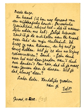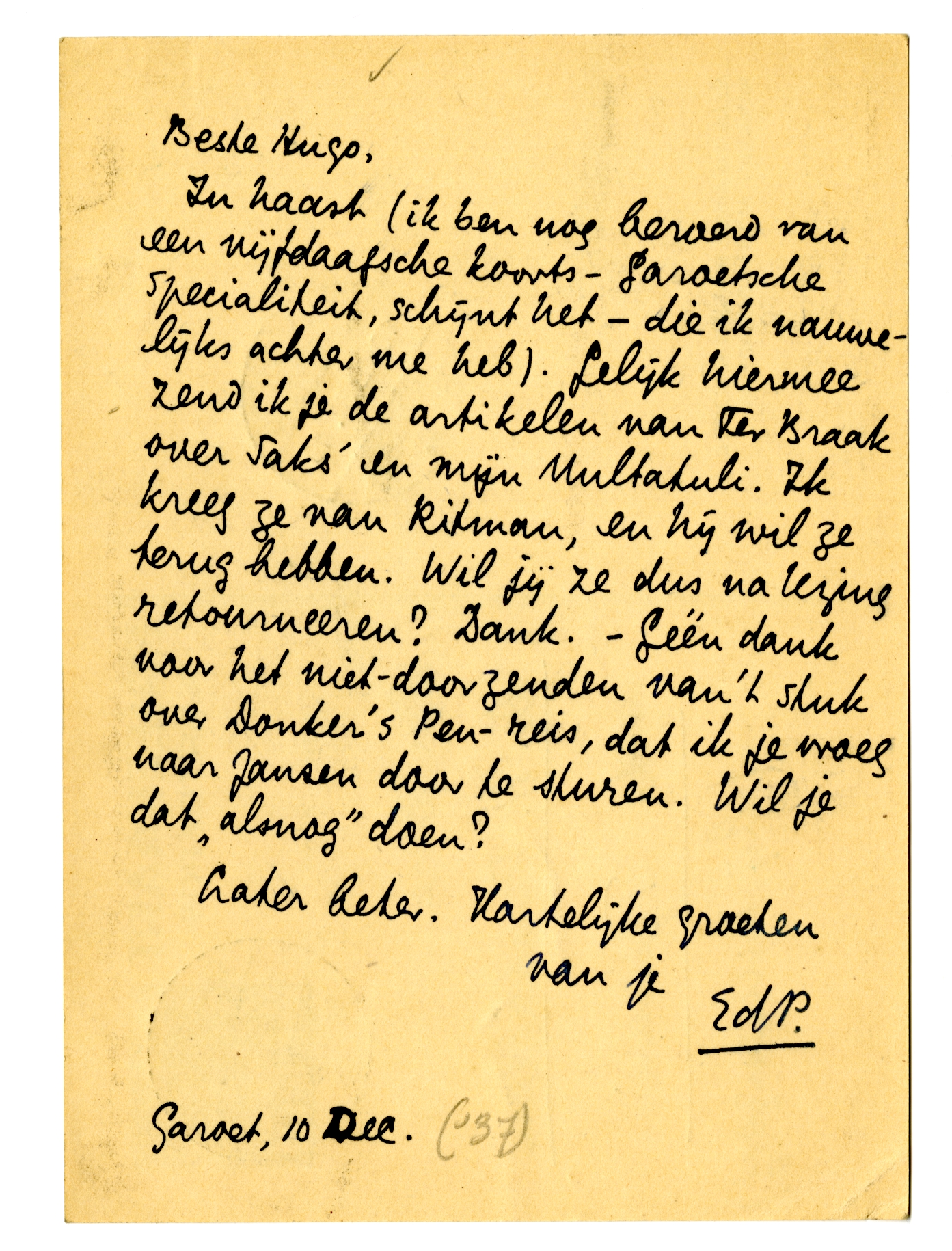 In haast (ik ben nog beroerd van een vijfdaagsche koorts - Garoetsche specialiteit, schijnt het - die ik nauwelijks achter me heb). Gelijk hiermee zend ik je de artikelen van Ter Braak over Saks' en mijn Multatuli. Ik kreeg ze van Ritman, en hij wil ze terug hebben. Wil jij ze dus na lezing retourneeren? Dank. - Géén dank voor het niet-doorzenden van 't stuk over Donker's Pen-reis, dat ik je vroeg naar Jansen door te sturen. Wil je dat ‘alsnog’ doen?