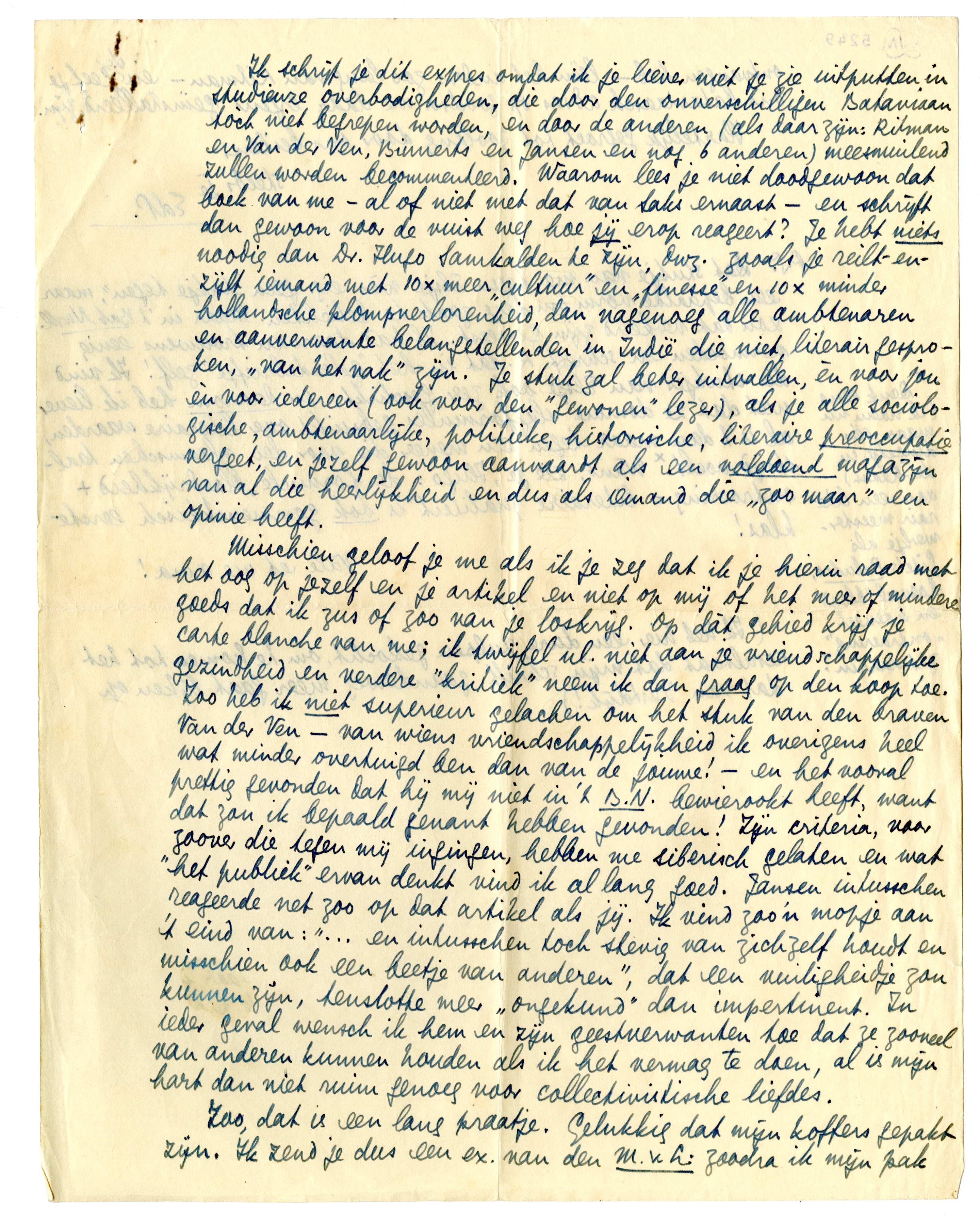 Ik schrijf je dit expres omdat ik je liever niet je zie uitputten in studieuze overbodigheden, die door den onverschilligen Bataviaan tòch niet begrepen worden, en door de anderen (als daar zijn: Ritman en van der Ven,5137 Binnerts en Jansen en nog 6 anderen) meesmuilend zullen worden becommenteerd. Waarom lees je niet doodgewoon dat boek van me - al of niet met dat van Saks ernaast - en schrijft dan gewoon voor de vuist weg hoe jij erop reageert? Je hebt niets noodig dan Dr. Hugo Samkalden te zijn, dwz. zooals je reilt-en-zijlt iemand met 10 × meer ‘cultuur’ en ‘finesse’ en 10 × minder hollandsche plompverlorenheid, dan nagenoeg alle ambtenaren en aanverwante belangstellenden in Indië die niet, literair gesproken, ‘van het vak’ zijn. Je stuk zal beter uitvallen, èn voor jou èn voor iedereen (ook voor den ‘gewonen’ lezer), als je alle sociologische, ambtenaarlijke, politieke, historische, literaire preoccupatie vergeet, en jezelf gewoon aanvaardt als een voldoend magazijn van al die heerlijkheid en dus als iemand die ‘zoo maar’ een opinie heeft.