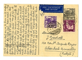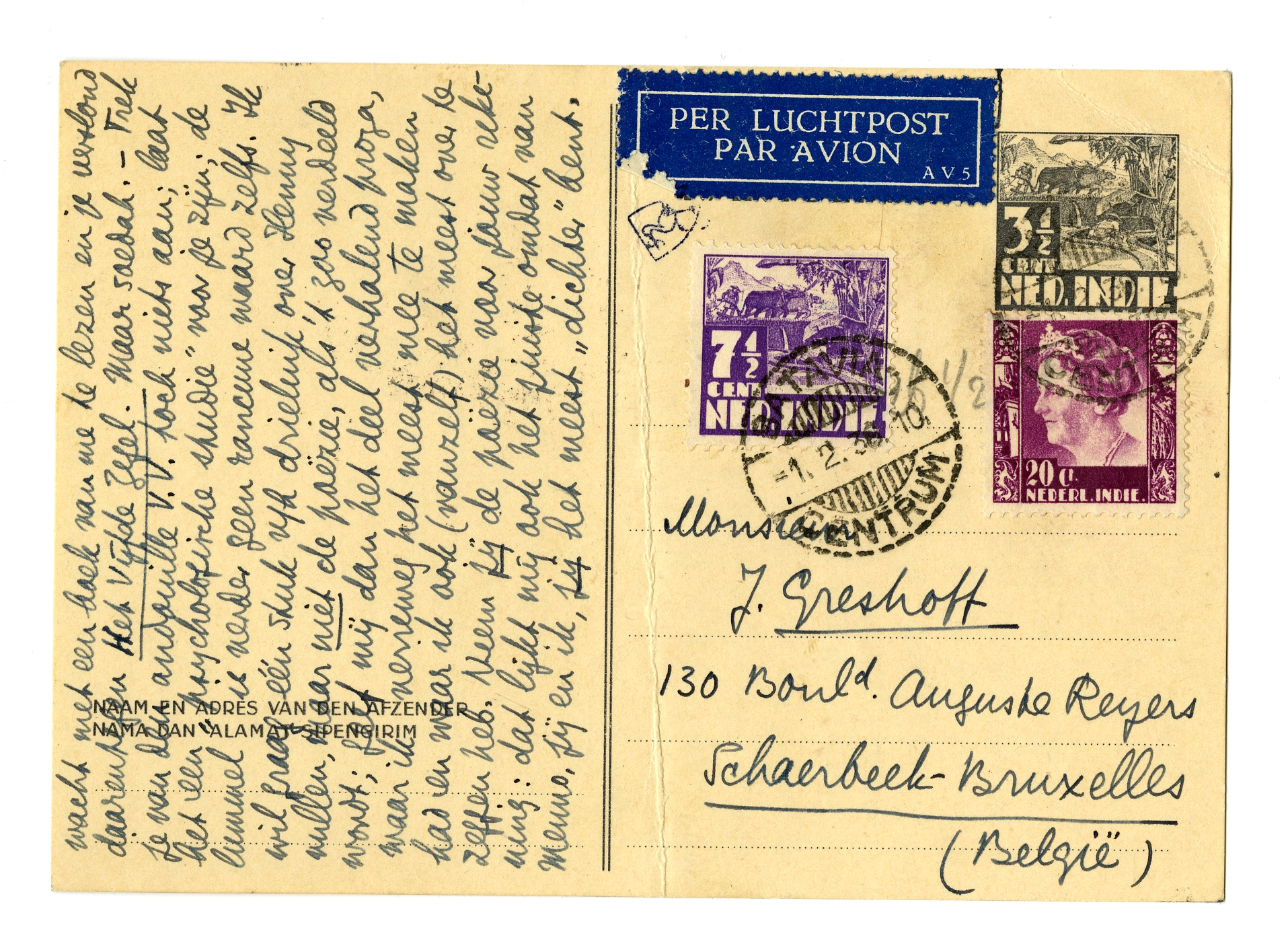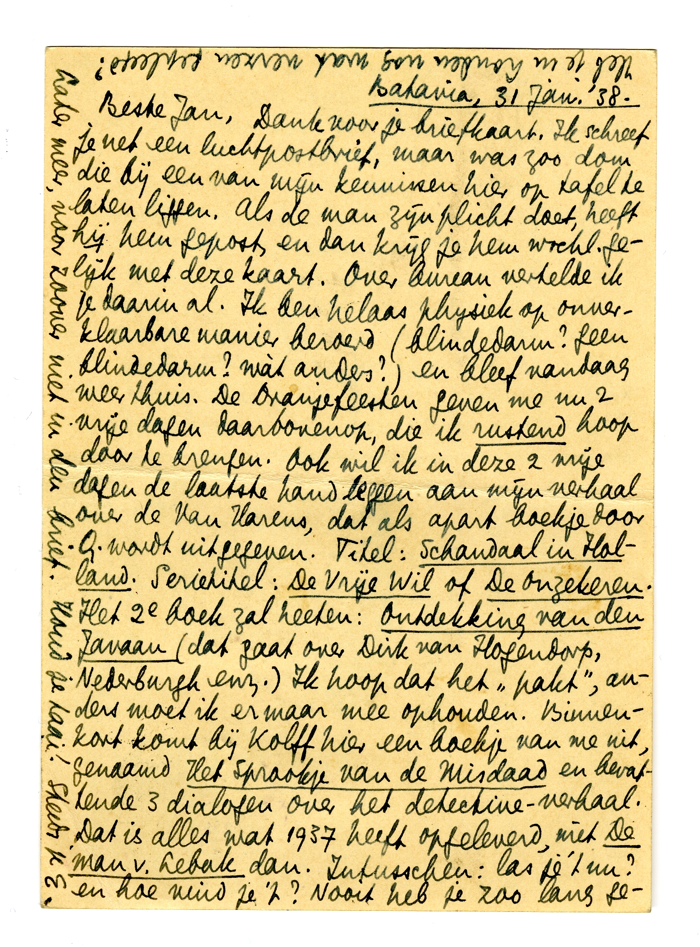 Beste Jan, Dank voor je briefkaart. Ik schreef je net een luchtpostbrief, maar was zoo dom die bij een van mijn kennissen hier op tafel te laten liggen. Als de man zijn plicht doet, heeft hij hem gepost, en dan krijg je hem wschl. gelijk met deze kaart. Over bureau vertelde ik je daarin al. Ik ben helaas physiek op onverklaarbare manier beroerd (blindedarm? geen blindedarm? wàt anders?) en bleef vandaag weer thuis. De Oranjefeesten geven me nu 2 vrije dagen daarbovenop, die ik rustend hoop door te brengen. Ook wil ik in deze 2 vrije dagen de laatste hand leggen aan mijn verhaal over de Van Harens, dat als apart boekje door Q. wordt uitgegeven. Titel: Schandaal in Holland. Serietitel: De Vrije Wil of De Onzekeren. Het 2e boek zal heeten: Ontdekking van den Javaan (dat gaat over Dirk van Hogendorp, Nederburgh enz.) Ik hoop dat het ‘pakt’, anders moet ik er maar mee ophouden. Binnenkort komt bij Kolff hier een boekje van me uit, genaamd Het Sprookje van de Misdaad en bevat-tende 3 dialogen over het detective-verhaal. Dat is alles wat 1937 heeft opgeleverd, mèt De Man v. Lebak dan. Intusschen: las je 't nu? en hoe vind je 't? Nooit heb je zoo lang gewacht met een boek van me te lezen en je verslond daarentegen Het Vijfde Zegel. Maar soedah. - Trek je van den andouille V.V. toch niets aan; laat het een ‘psychologische studie’ voor je zijn; de lummel is verder geen rancune waard zelfs.5213 Ik wil graag één stuk v/h drieluik over Henny vullen, maar niet de poëzie, als 't zoo verdeeld wordt; geef mij dan het deel verhalend proza, waar ik verreweg het meest mee te maken had en waar ik ook (vanzelf) het meest over te zeggen heb. Neem jij de poëzie voor jouw rekening: dat lijkt mij ook het juiste omdat van Menno, jij en ik, jij het meest ‘dichter’ bent. Later meer, voor zoover niet in den brief. Houd je taai! Steeds je