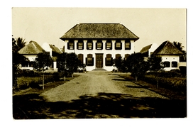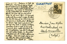 Beste Jan, Veel dank voor je brief, die me gisteravond bereikte. Ik antwoord spoedig, maar moet nu net verhuizen. Ons adres is voortaan: Molenvliet West 9a, Batavia-C. Hierbij een foto v/h Landsarchief waar ik nu werk. Het is 18e eeuwsche koloniale bouwstijl, vroeger landhuis van den G.G. Reinier de Klerk aan het ‘aangenaeme Molenvliet’. De deuren en ramen zijn rood met goud, zoodat het een lust is erheen te loopen. Paviljoen links is voor onderzoek 's avonds, pav. rechts binderij; de eig. bergplaatsen zijn die 2 vleugels die naar achter loopen en die je dus niet goed ziet, de vroegere slavenvertrekken. Wat een pest dat ze jou zoo ellendig gehuisvest hebben!