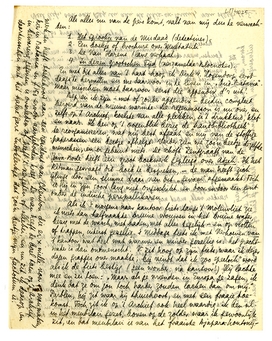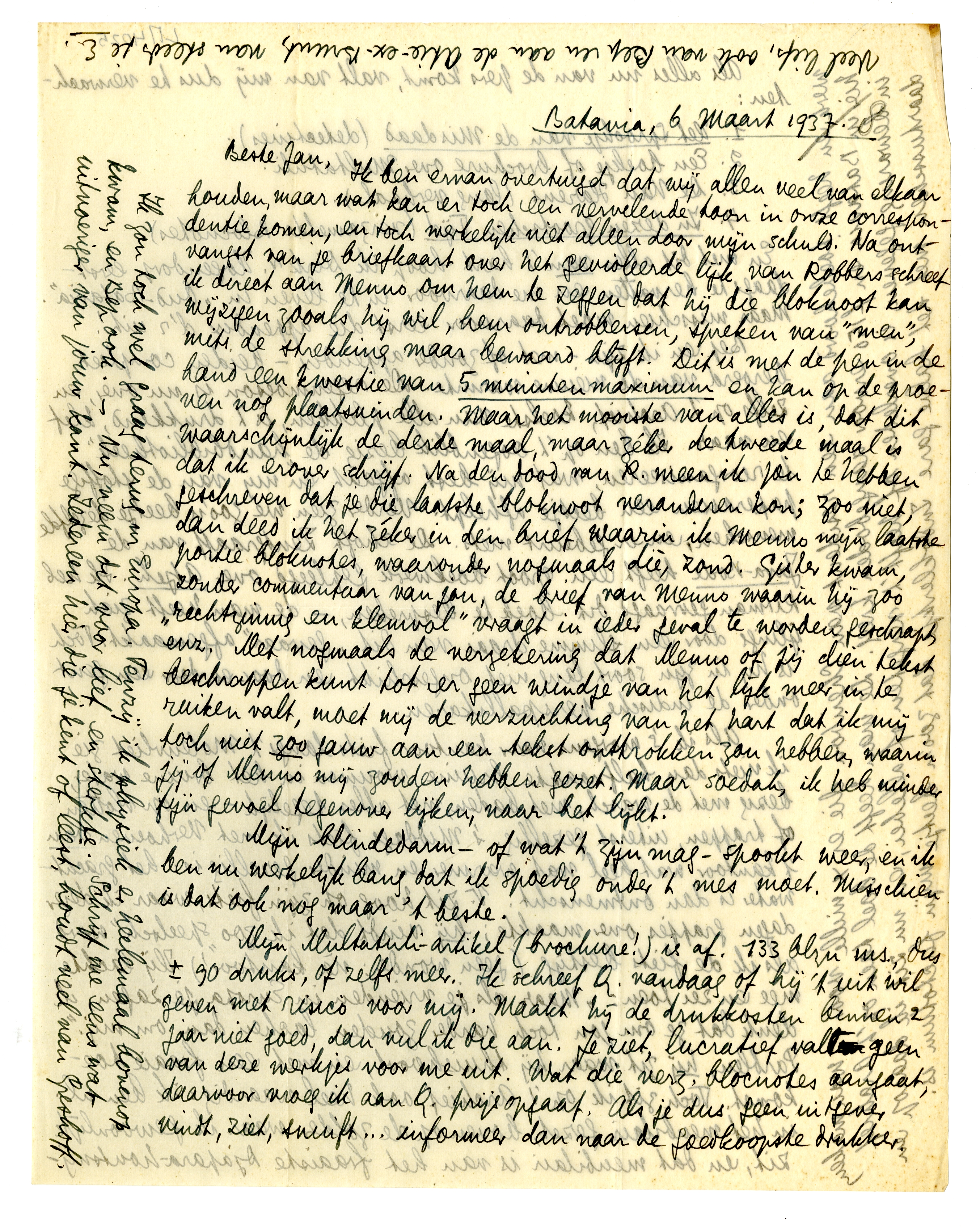 Ik ben ervan overtuigd dat wij allen veel van elkaar houden, maar wat kan er toch een vervelende toon in onze correspondentie komen, en toch werkelijk niet alleen door mijn schuld. Na ontvangst van je briefkaart over het gevioleerde lijk van Robbers schrijf ik direct aan Menno5252 om hem te zeggen dat hij die bloknoot kan wijzigen zooals hij wil, hem ontrobbersen, spreken van ‘men’, mits de strekking maar bewaard blijft. Dit is met de pen in de hand een kwestie van 5 minuten maximum en kan op de proeven nog plaatsvinden. Maar het mooiste van alles is, dat dit waarschijnlijk de derde maal, maar zéker de tweede maal is dat ik erover schrijf. Na den dood van R. meen ik jou te hebben geschreven dat je die laatste bloknoot veranderen kon; zoo niet, dan deed ik het zéker in den brief waarin ik Menno mijn laatste portie bloknotes, waaronder nogmaals diè, zond.5253 Gister kwam, zonder commentaar van jou, de brief van Menno5254 waarin hij zoo ‘rechtzinnig en klemvol’ vraagt in ieder geval te worden geschrapt enz. Met nogmaals de verzekering dat Menno of jij dien tekst beschrappen kunt tot er geen windje van het lijk meer in te ruiken valt, moet mij de verzuchting van het hart dat ik mij toch niet zoo gauw aan een tekst onttrokken zou hebben, waarin jij of Menno mij zouden hebben gezet. Maar soedah, ik heb minder fijn gevoel tegenover lijken, naar het lijkt.