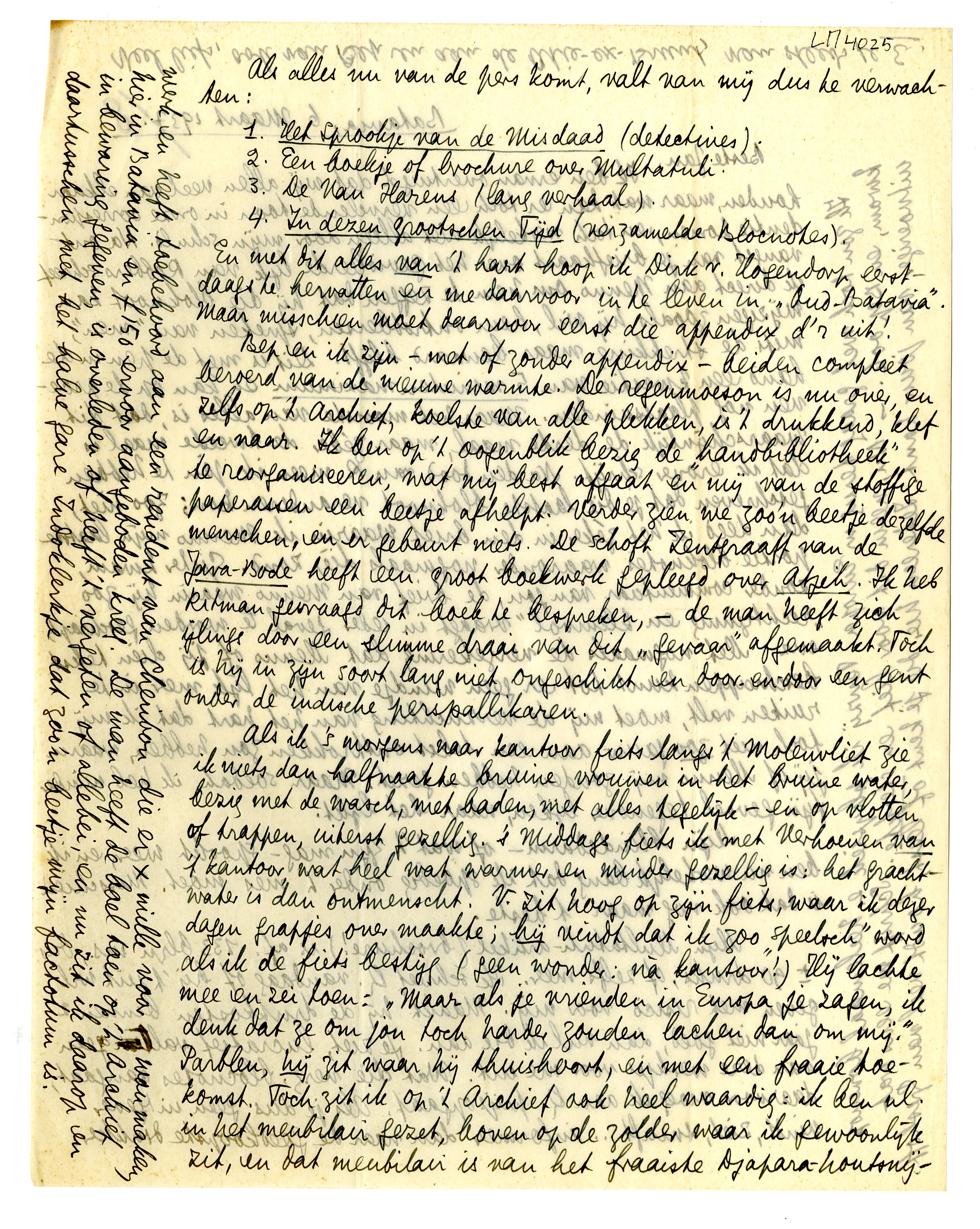 Bep en ik zijn - met of zonder appendix - beiden compleet beroerd van de nieuwe warmte. De regenmoeson is nu over, en zelfs op 't Archief, koelste van alle plekken, is 't drukkend, klef en naar. Ik ben op 't oogenblik bezig de ‘handbibliotheek’ te reorganiseeren, wat mij best afgaat en mij van de stoffige paperassen een beetje afhelpt. Verder zien we zoo'n beetje dezelfde menschen, en er gebeurt niets. De schoft Zentgraaff van de Java-Bode heeft een groot boekwerk gepleegd over Atjeh.5258 Ik heb Ritman gevraagd dit boek te bespreken, - de man heeft zich ijlings door een slimme draai van dit ‘gevaar’ afgemaakt. Toch is hij in zijn soort lang niet ongeschikt en door-en-door een gent onder de indische perspallikaren.5259