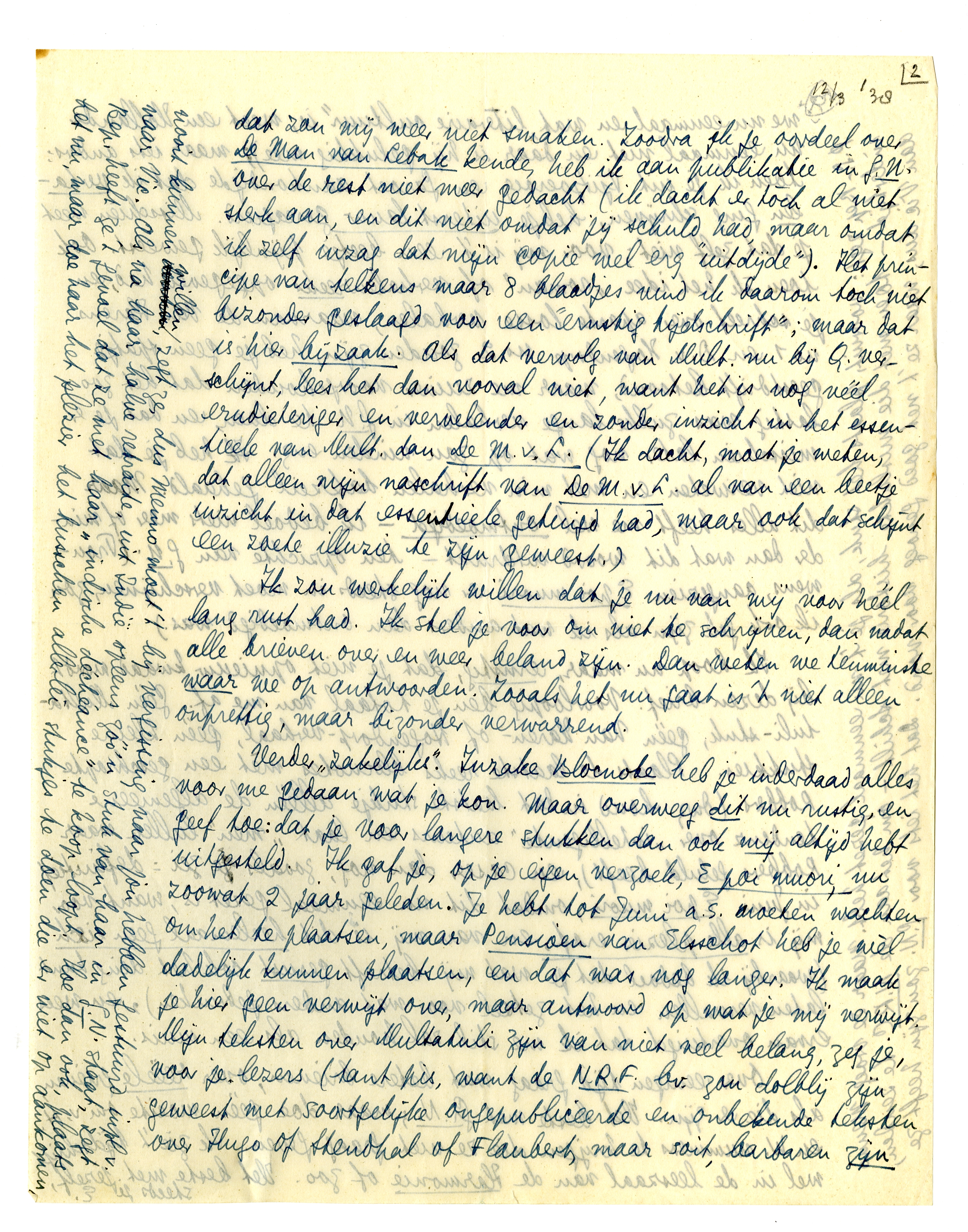 Ik hoop nu maar, ernstig, dat je niet opnieuw kwaad wordt bij dezen brief. Voorloopig ben je totaal van me af. Géén Multatulistuk, géén Van Haren- of Hogendorp-verhaal, géén kleine stukkies. Plaats de laatste reeks blocnotes mèt een geschrapte Robbers (dwz. houd in dat laatste stukje alléén de algemene tendenz over ‘intelligente’ auteurs en laat ‘men’ lullen waar Robbers geluld heeft), en caseer dan nog, zooals je zei: definitief in Juni E poi muori, omdat dit nu eenmaal gezet is, want voor mij is alle plezier eraf, en van mij is dit heelemaal geen eisch (waarbij ik bedoel dat je wat mij betreft gerust ook het ding kunt laten vervallen en het zetsel voor wat anders gebruiken), en wees ervan overtuigd dat ik me stil zal houden als een muis.
