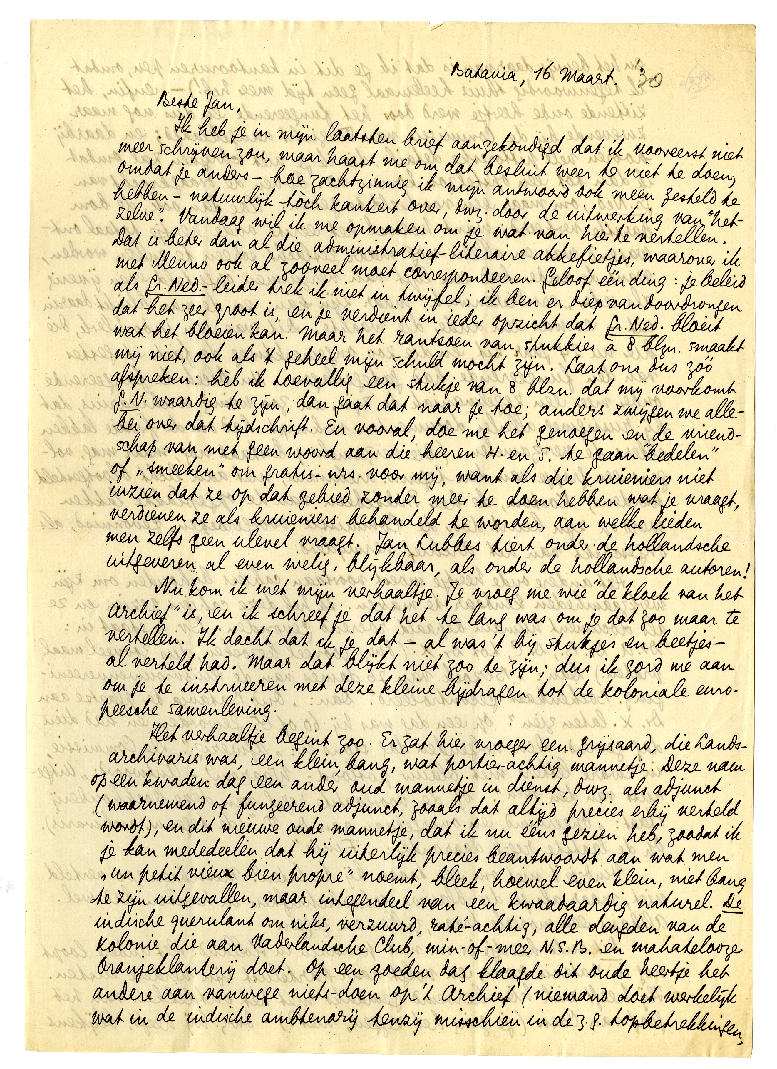 Het verhaaltje begint zoo. Er zat hier vroeger een grijsaard, die Landsarchivaris was, een klein, bang, wat portier-achtig mannetje.5273 Deze nam op een kwaden dag een ander oud mannetje in dienst, dwz. als adjunct (waarnemend of fungeerend adjunct, zooals dat altijd precies erbij verteld wordt),5274 en dit nieuwe oude mannetje, dat ik nu ééns gezien heb, zoodat ik je kan mededeelen dat hij uiterlijk precies beantwoordt aan wat men ‘un petit vieux bien propre’ noemt, bleek, hoewel even klein, niet bang te zijn uitgevallen, maar integendeel van een kwaadaardig naturel. De indische querulant om niks, verzuurd, raté-achtig, alle deugden van de kolonie die aan Vaderlandsche Club, min-of-meer N.S.B. en mahatelooze Oranjeklanterij doet. Op een goeden dag klaagde dit oude heertje het andere aan vanwege niets-doen op 't Archief (niemand doet werkelijk wat in de indische ambtenarij tenzij misschien in de z.g. topbetrekkingen, en het bewijs daarvan is dat ik je dit in kantooruren pen, omdat ik tegenwoordig thuis heelemaal geen tijd meer heb!) - enfin, het zittende oude heertje werd door het fungeerende en dus nog maar zwevende bij de Commissie van Toezicht aangeklaagd; en daarbij hooren vele pittoreske details, die ik je niet schrijven zal omdat ik dan tot een opstel zou komen vèr boven de draagkracht van Gr. Ned., om maar een voorbeeld te geven. Hoe dan ook, de bom barsttte verkeerd; want hoewel het eerste oude heertje totaal ontwapend was en alleen nog maar geslacht scheen te zullen worden, want de ander had een lijst van verzuimen opgesteld even ijverig als ieder ‘erudietenwerk’ maar zijn kan, en de man blinkt daarin uit - er was een ander die waakte. Dit was een indo-klerk,5275 die hier nu 24 jaar zit, en die zoo ongemerktweg de faits et gestes van den fungeerende had gadegeslagen. Nu bleek de fungeerende onder meer een zegelmaniak te zijn, en zoo weinig archivaris, dat hij rustigweg allerlei dokumenten verknipt had om de fraaie lakken elders te verzamelen. (Die verzameling bestaat nòg, maar mag, volgens een grapje van den tegenw. archivaris, niet aan licht blootgesteld worden.) Kortom, de heer Prikkebeen van de opgeplakte lakken werd op zijn beurt door de Commissie voorgeroepen, gevonnisd, als ongeschikt van Archief verwijderd.