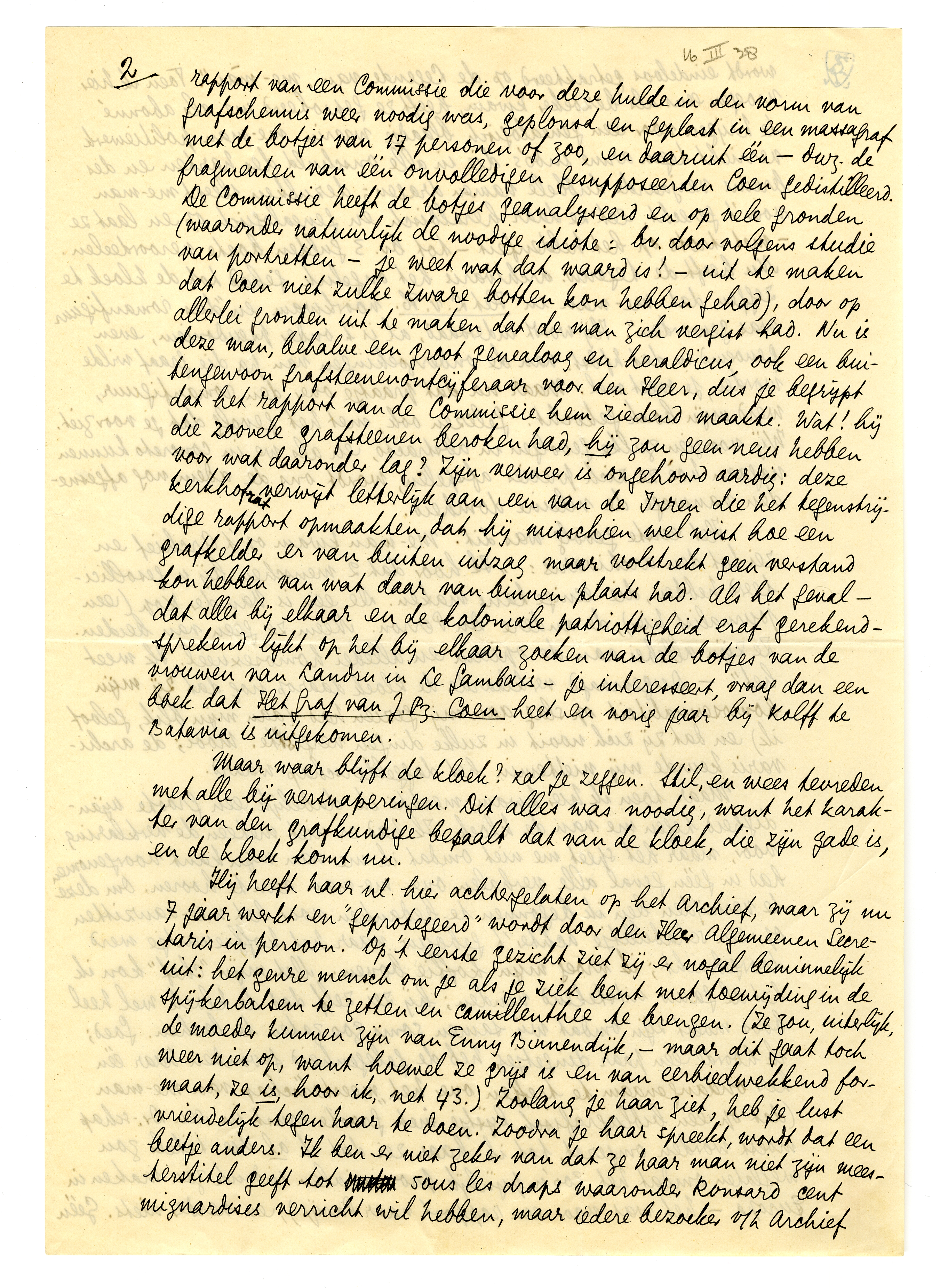 Dit oude heertje is nu met pensioen in Holland. Het andere loopt nog in Batavia rond, en volgt naar hartelust zijn verdere lusten. Hij heeft zich hier beroemd gemaakt met het ontdekken van het graf van Coen (je ging het zeggen, niet?) - dwz. hij heeft, blijkens rapport van een Commissie die voor deze hulde in de vorm van grafschennis weer noodig was, geplonsd en geplast in een massagraf met de botjes van 17 personen of zoo, en daaruit één - dwz. de fragmenten van één onvolledigen gesupposeerden Coen gedistilleerd. De Commissie heeft de botjes geanalyseerd en op vele gronden (waaronder natuurlijk de noodige idiote: bv. door volgens studie van portretten - je weet wat dat waard is! - uit te maken dat Coen niet zulke zware botten kon hebben gehad), door op allerlei gronden uit te maken dat de man zich vergist had. Nu is deze man, behalve een groot genealoog en heraldicus, ook een buitengewoon grafsteenontcijferaar voor den Heer, dus je begrijpt dat het rapport van de Commissie hem ziedend maakte. Wat! hij die zoovele grafsteenen beroken had, hij zou geen neus hebben voor wat daaronder lag? Zijn verweer is ongehoord aardig: deze kerkhofrat verwijt letterlijk aan een van de Irren die het tegenstrijdige rapport opmaakten, dat hij misschien wel wist hoe een grafkelder er van buiten uitzag maar volstrekt geen verstand kon hebben van wat daar van binnen plaats had. Als het geval - dat alles bij elkaar en de koloniale patriottigheid eraf gerekend - sprekend lijkt op het bij elkaar zoeken van de botjes van de vrouwen van Landru in Le Gambais - je interesseert, vraag dan een boek dat Het Graf van J. Pz. Coen heet en vorig jaar bij Kolff te Batavia is uitgekomen.5276