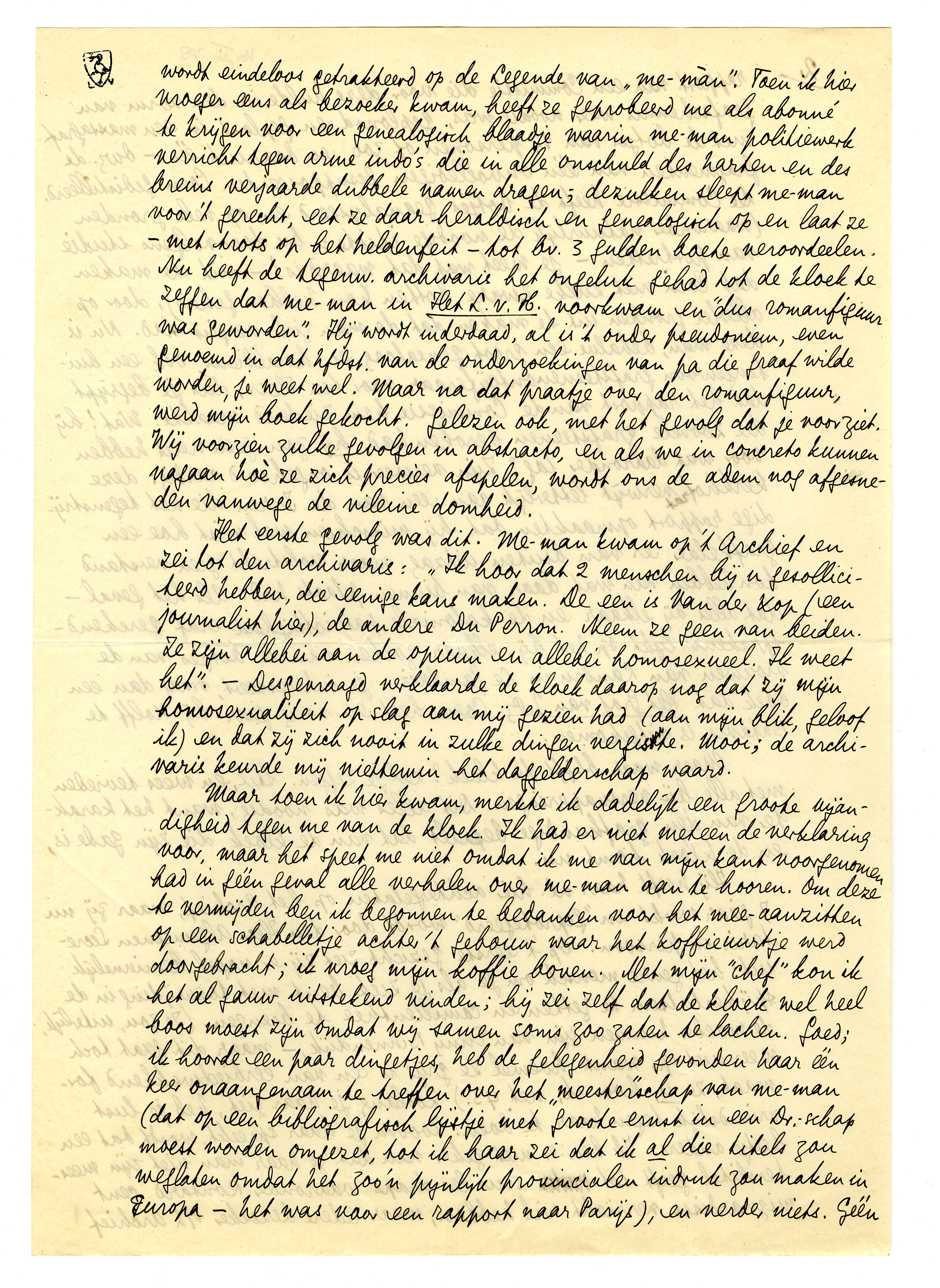 Hij heeft haar nl. hier achtergelaten op het Archief, waar zij nu 7 jaar werkt en ‘geprotegeerd’ wordt door den Heer Algemeenen Secretaris in persoon.5277 Op 't eerste gezicht ziet zij er nogal beminnelijk uit: het genre mensch om je als je ziek bent met toewijding in de spijkerbalsem te zetten en camillenthee te brengen. (Ze zou, uiterlijk, de moeder kunnen zijn van Enny Binnendijk, - maar dit gaat toch weer niet op, want hoewel ze grijs is en van eerbiedwekkend formaat, ze is, hoor ik, net 43.) Zoolang je haar ziet, heb je lust vriendelijk tegen haar te doen. Zoodra je haar spreekt, wordt dat een beetje anders. Ik ben er niet zeker van dat ze haar man niet zijn meestertitel geeft tot sous les draps waaronder Ronsard cent mignardises verricht wil hebben, maar iedere bezoeker v/h Archief wordt eindeloos getrakteerd op de Legende van ‘me-màn’. Toen ik hier vroeger eens als bezoeker kwam, heeft ze geprobeerd me als abonné te krijgen voor een genealogisch blaadje5278 waarin me-man politiewerk verricht tegen arme indo's die in alle onschuld des harten en des breins verjaarde dubbele namen dragen; dezulken sleept me-man voor 't gerecht, eet ze daar heraldisch en genealogisch op en laat ze - met trots op het heldenfeit - tot bv. 3 gulden boete veroordeelen. Nu heeft de tegenw. archivaris het ongeluk gehad tot de kloek te zeggen dat me-man in Het L.v.H. voorkwam en ‘dus romanfiguur was geworden’. Hij wordt inderdaad, al is 't onder pseudoniem, even genoemd in dat hfdst. van de onderzoekingen van pa die graaf wilde worden, je weet wel.5279 Maar na dat praatje over den romanfiguur, werd mijn boek gekocht. Gelezen ook, met het gevolg dat je voorziet. Wij voorzien zulke gevolgen in abstracto, en als we in concreto kunnen nagaan hoè ze zich precies afspelen, wordt ons de adem nog afgesneden vanwege de vileine domheid.
