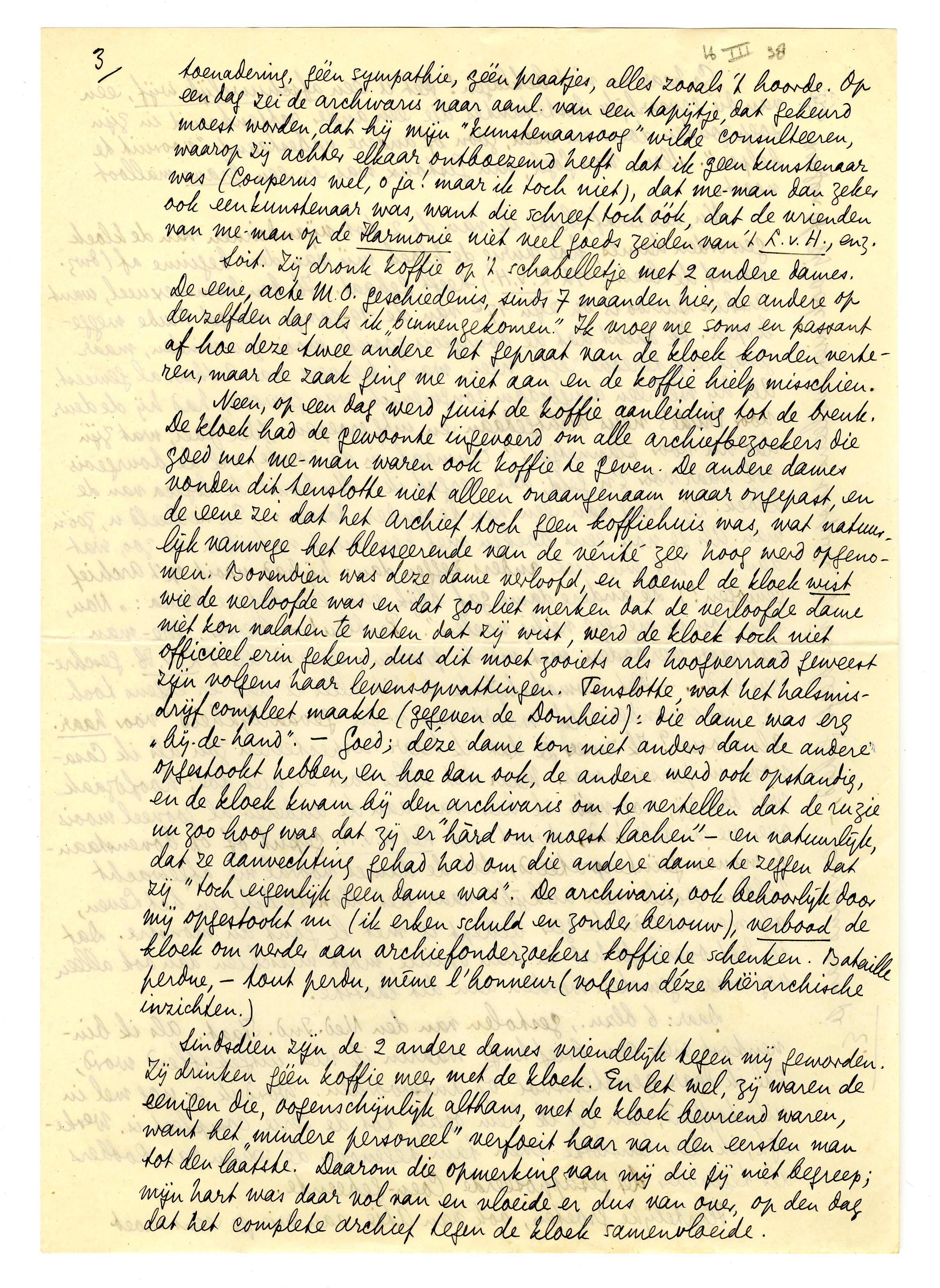 Soit. Zij dronk koffie op 't schabelletje met 2 andere dames. De eene, acte M.O. geschiedenis, sinds 7 maanden hier, de andere op denzelfden dag als ik ‘binnengekomen’.5280 Ik vroeg me soms en passant af hoe deze twee andere het gepraat van de kloek konden verteren, maar de zaak ging me niet aan en de koffie hielp misschien.