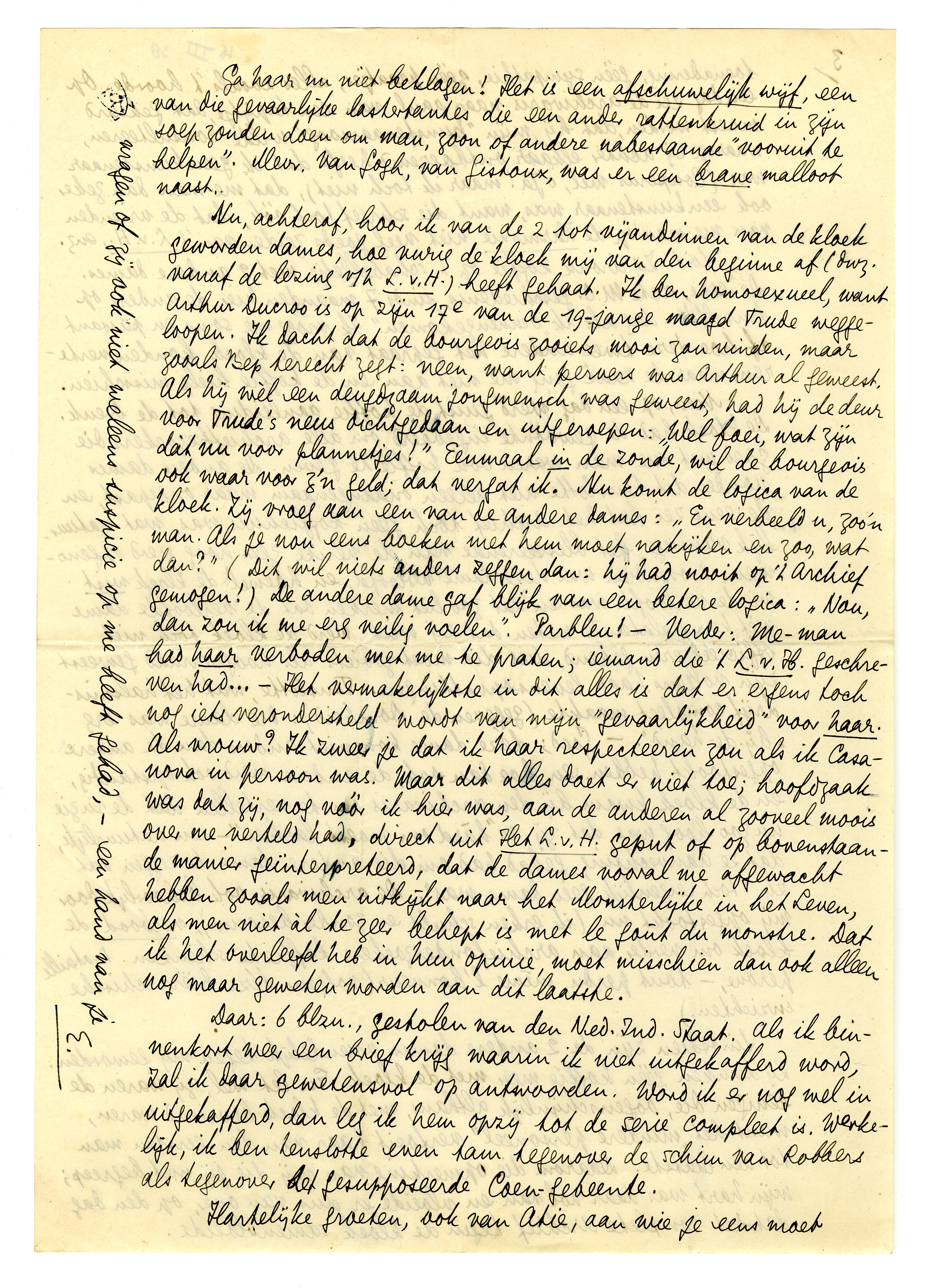 Nu, achteraf, hoor ik van de 2 tot vijandinnen van de kloek geworden dames, hoe vurig de kloek mij van den beginne af (dwz. vanaf de lezing v/h L.V.H.) heeft gehaat. Ik ben homosexueel, want Arthur Ducroo is op zijn 17e van de 19-jarige maagd Trude weggeloopen.5282 Ik dacht dat de bourgeois zooiets mooi zou vinden, maar zooals Bep terecht zegt: neen, want pervers was Arthur al geweest. Als hij wèl een deugdzaam jongmensch was geweest, had hij de deur voor Trude's neus dichtgedaan en uitgeroepen: ‘Wel foei, wat zijn dat nu weer voor plannetjes!’ Eenmaal in de zonde, wil de bourgeois ook waar voor z'n geld; dat vergat ik. Nu komt de logica van de kloek. Zij vroeg aan een van de andere dames: ‘En verbeeld u, zoo'n man. Als je nou eens boeken met hem moet nakijken en zoo, wat dan?’ (Dit wil niets anders zeggen dan: hij had nooit op 't Archief gemogen!) De andere dame gaf blijk van een betere logica: ‘Nou, dan zou ik me erg veilig voelen’. Parbleu! - Verder: Me-man had haar verboden met me te praten; iemand die 't L.v.H. geschreven had... - Het vermakelijkste in dit alles is dat er ergens toch nog iets verondersteld wordt van mijn ‘gevaarlijkheid’ voor haar. Als vrouw? Ik zweer je dat ik haar respecteeren zou als ik Casanova in persoon was. Maar dit alles doet er niet toe; hoofdzaak was dat zij, nog vóór ik hier was, aan de anderen al zooveel moois over me verteld had, direct uit Het L.v.H. geput of op bovenstaande manier geïnterpreteerd, dat de dames vooral me afgewacht hebben zooals men uitkijkt naar het Monsterlijke in het Leven, als men niet àl te zeer behept is met le goût du monstre. Dat ik het overleefd heb in hun opinie, moet misschien dan ook alleen nog maar geweten worden aan dit laatste.
