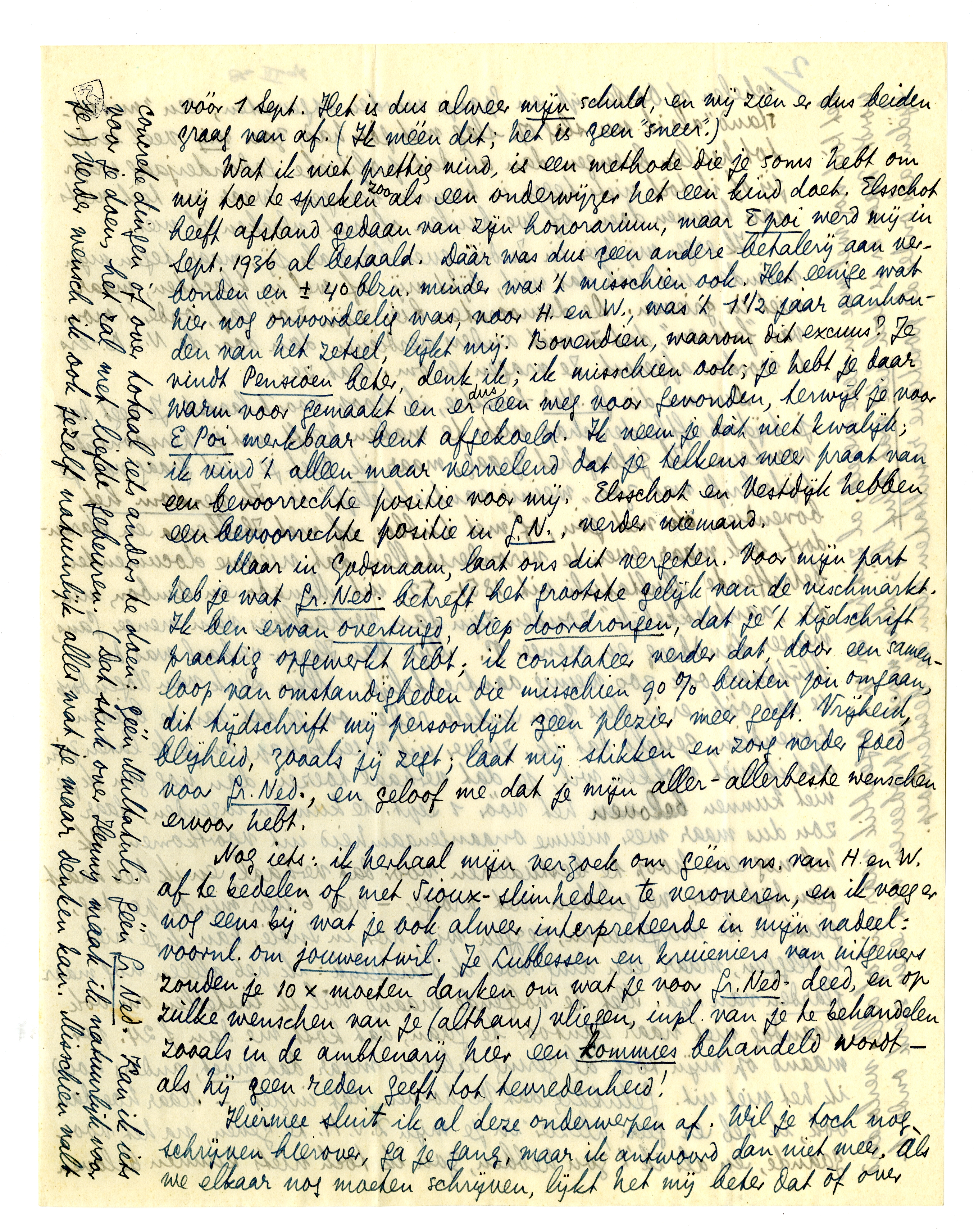 Nog iets: ik herhaal mijn verzoek om géén nrs. van H. en W. af te bedelen of met Sioux-slimheden te veroveren, en ik voeg er nog eens bij wat je ook alweer interpreteerde in mijn nadeel: voornl. om jouwentwil. Je Lubbessen en kruieniers van uitgevers zouden je 10 × moeten danken om wat je voor Gr. Ned. deed, en op zùlke wenschen van je (althans) vliegen, inpl. van je te behandelen zooals in de ambtenarij hier een kommies behandeld wordt - als hij geen reden geeft tot tevredenheid!