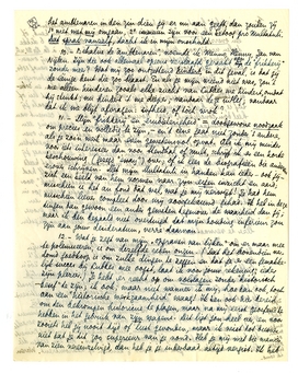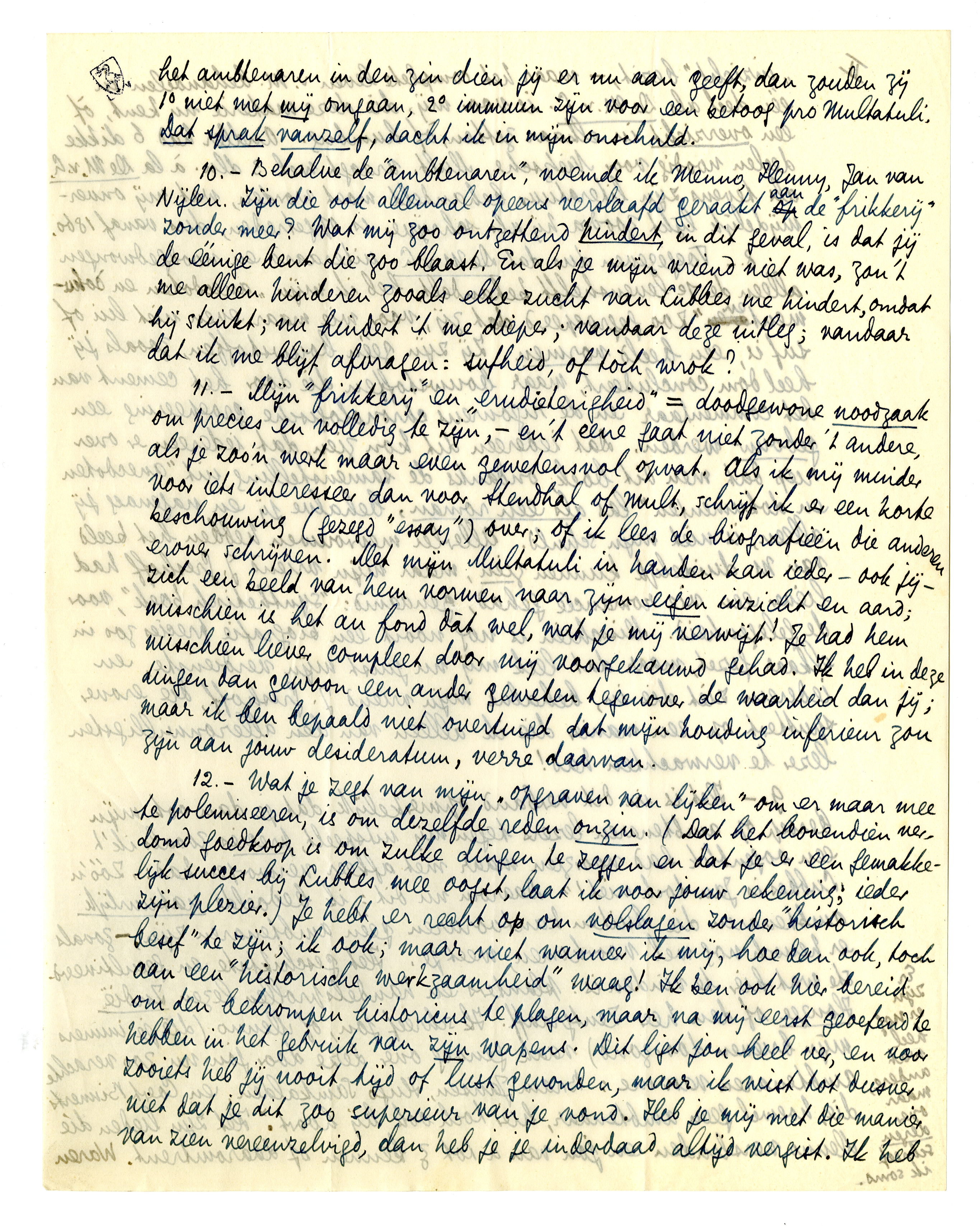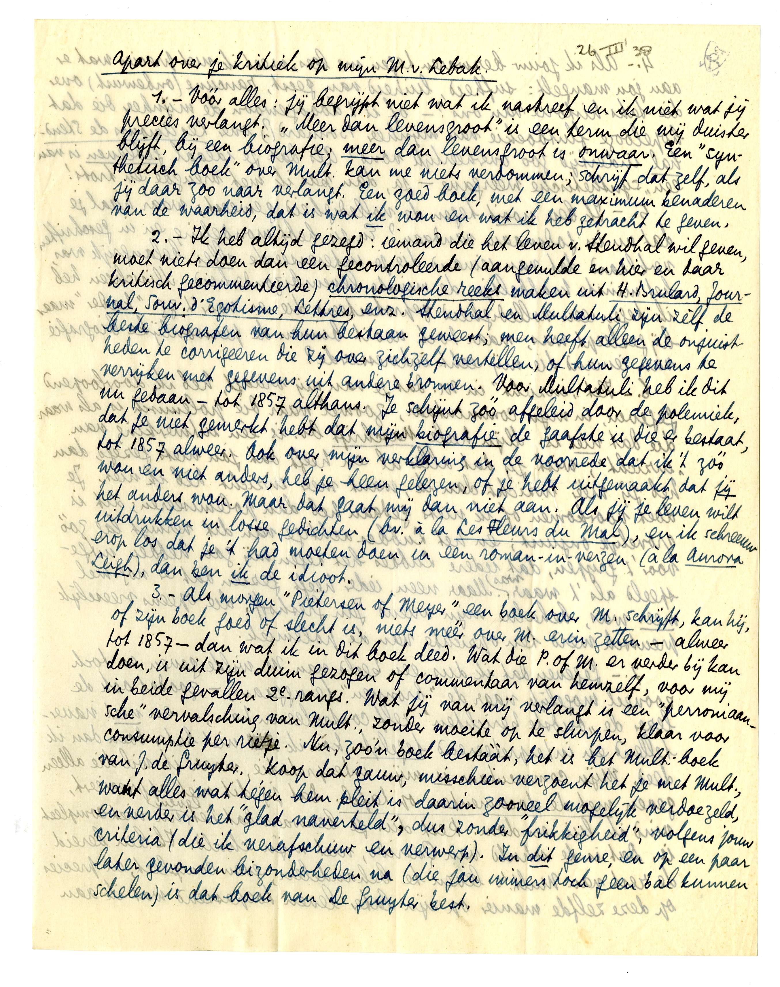 | 11. | - Mijn ‘frikkerij’ en ‘erudieterigheid’ = doodgewone noodzaak om precies en volledig te zijn, en 't eene gaat niet zonder 't andere, als je zoo'n werk maar even gewetensvol opvat. Als ik mij minder voor iets interesseer dan voor Stendhal of Mult., schrijf ik er een korte beschouwing (gezegd ‘essay’) over; of ik lees de biogra-fieën die anderen erover schrijven. Met mijn Multatuli in handen kan ieder - ook jij - zich een beeld van hem vormen naar zijn eigen inzicht en aard; misschien is het au fond dàt wel, wat je mij verwijt! Je had hem misschien liever compleet door mij voorgekauwd gehad. Ik heb in deze dingen dan gewoon een ander geweten tegenover de waarheid dan jij; maar ik ben bepaald niet overtuigd dat mijn houding inferieur zou zijn aan jouw desideratum, verre daarvan. |
