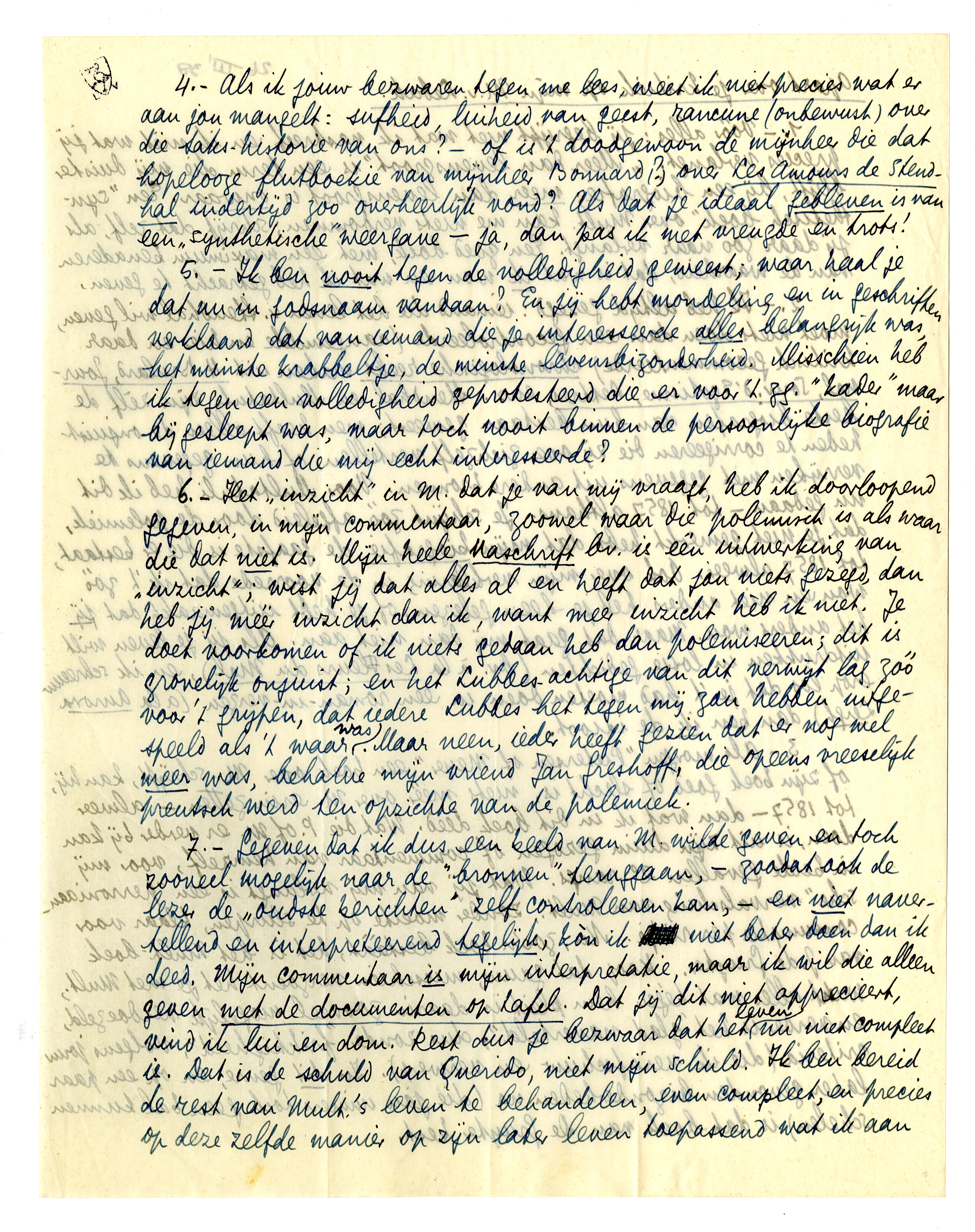 | 7. | - Gegeven dat ik dus een beeld van M. wilde geven en toch zooveel mogelijk naar de ‘bronnen’ teruggaan, - zoodat ook de lezer de ‘oudste berichten’ zelf controleeren kan, - en niet navertellend en interpreteerend tegelijk, kòn ik niet beter doen dan ik deed. Mijn commentaar is mijn interpretatie, maar ik wil die alleen geven met de documenten op tafel. Dat jij dit niet apprecieert, vind ik lui en dom. Rest dus je bezwaar dat het leven nu niet compleet is. Dat is de schuld van Querido, niet mijn schuld. Ik ben bereid de rest van Mult.'s leven te behandelen, even compleet, en precies op deze zelfde manier op zijn later leven toepassend wat ik aan ‘inzicht’ bezit, - maar het complete leven v.M. behandelen in één deel als De M.v.L. is voor mij, die deze materie nu kent, òf een overzicht in elkaar zetten, òf humbug. Andler had 6 dikke deelen noodig voor Nietzsche, Mult. vraagt wel 3 dln. à la De M.v.L. als tevens zijn literatuur behandeld moet worden, wat mij onvermijdelijk lijkt zoodra hij als schrijver is opgetreden, dus vanaf 1860. |