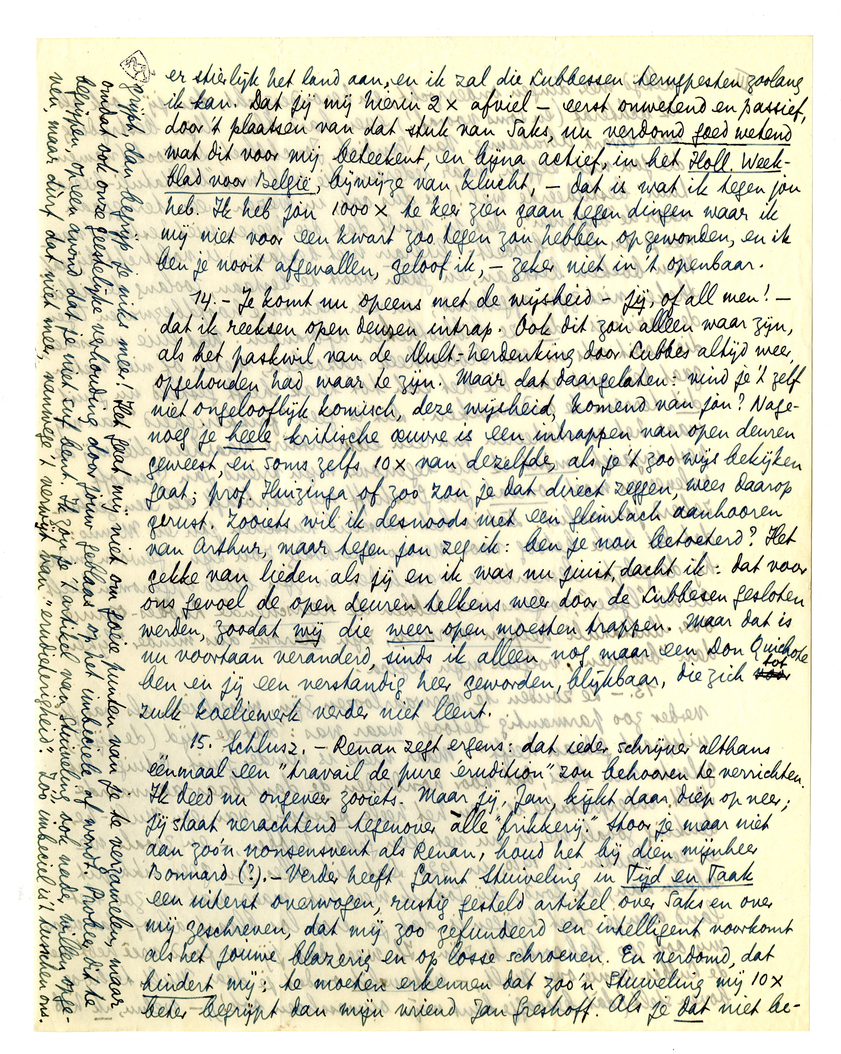 | 15. | - Schlusz. - Renan zegt ergens: dat iedere schrijver althans éénmaal een ‘travail de pure érudition’5305 zou behooren te verrichten. Ik deed nu ongeveer zooiets. Maar jij, Jan, kijkt daar diep op neer; jij staat verachtend tegenover àlle ‘frikkerij’. Stoor je maar niet aan zoo'n nonsensvent als Renan, houd het bij dien mijnheer Bonnard (?). - Verder heeft Garmt Stuiveling in Tijd en Taak een uiterst overwogen, rustig gesteld artikel over Saks en over mij geschreven,5306 dat mij zoo gefundeerd en intelligent voorkomt als het jouwe blazerig en op losse schroeven. En verdomd, dat hindert mij: te moeten erkennen dat zoo'n Stuiveling mij 10 × beter begrijpt dat mijn vriend Jan Greshoff. Als je dat niet begrijpt, dan begrijp je niks meer! Het gaat mij niet om goeie punten van je te verzamelen, maar omdat ook onze geestelijke verhouding door jouw geblaas op het imbeciele af wordt. Probeer dit te begrijpen, op een avond dat je niet suf bent. Ik zou je 't artikel van Stuiveling ook nader willen opgeven, maar dùrf dat niet meer vanwege 't verwijt van ‘erudieterigheid’. Zóó imbeciel is 't tusschen ons. |
