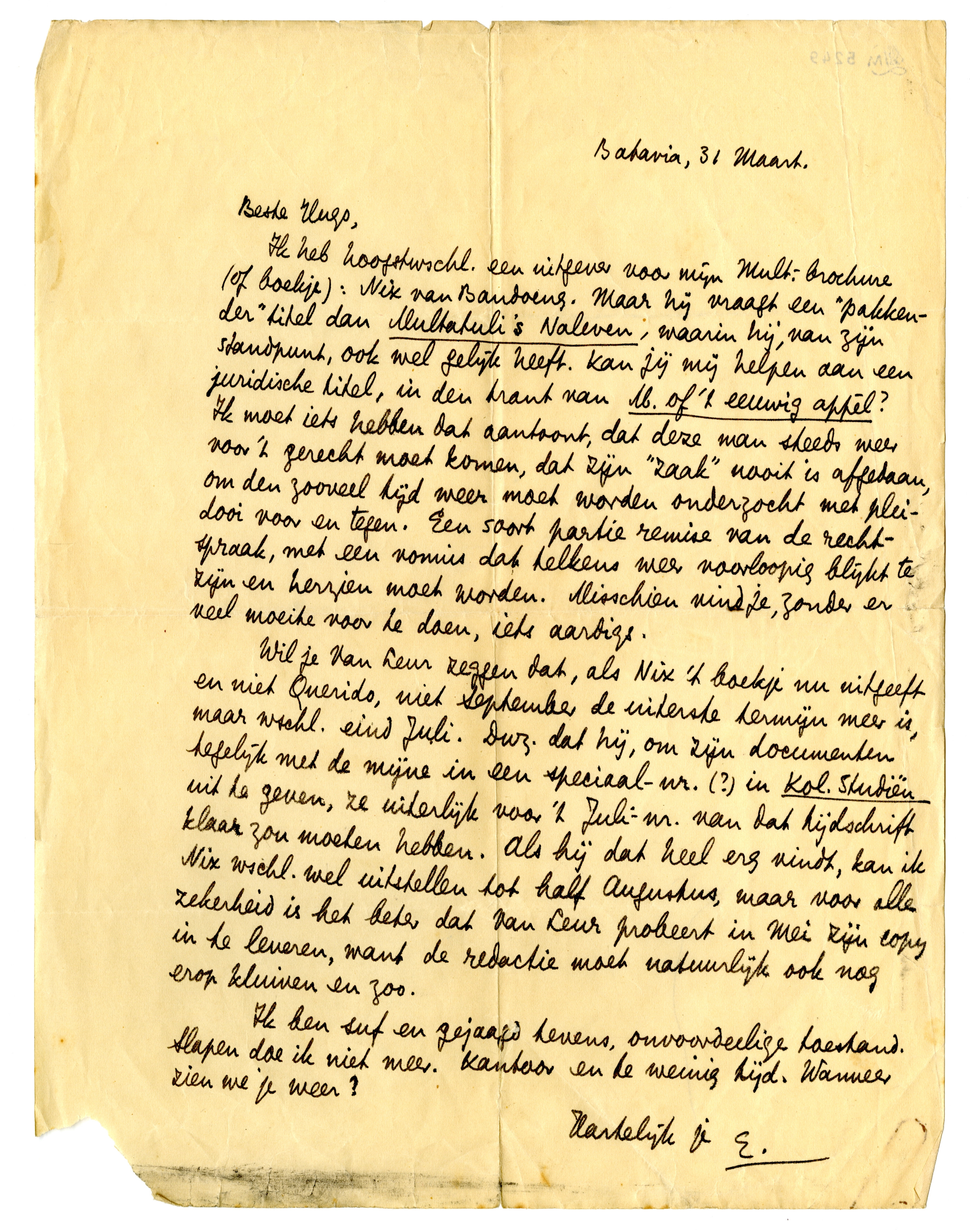 Wil je Van Leur zeggen, dat, als Nix 't boekje nu uitgeeft en niet Querido, niet September de uiterste termijn meer is, maar wschl. eind Juli. Dwz. dat hij, om zijn documenten tegelijk met de mijne in een speciaal-nr. (?) in Kol. Studiën uit te geven, ze uiterlijk voor 't Juli-nr. van dat tijdschrift klaar zou moeten hebben. Als hij dat heel erg vindt, kan ik Nix wschl. wel uitstellen tot half Augustus, maar voor alle zekerheid is het beter dat van Leur probeert in Mei zijn copy in te leveren, want de redactie moet natuurlijk ook nog erop kluiven en zoo.