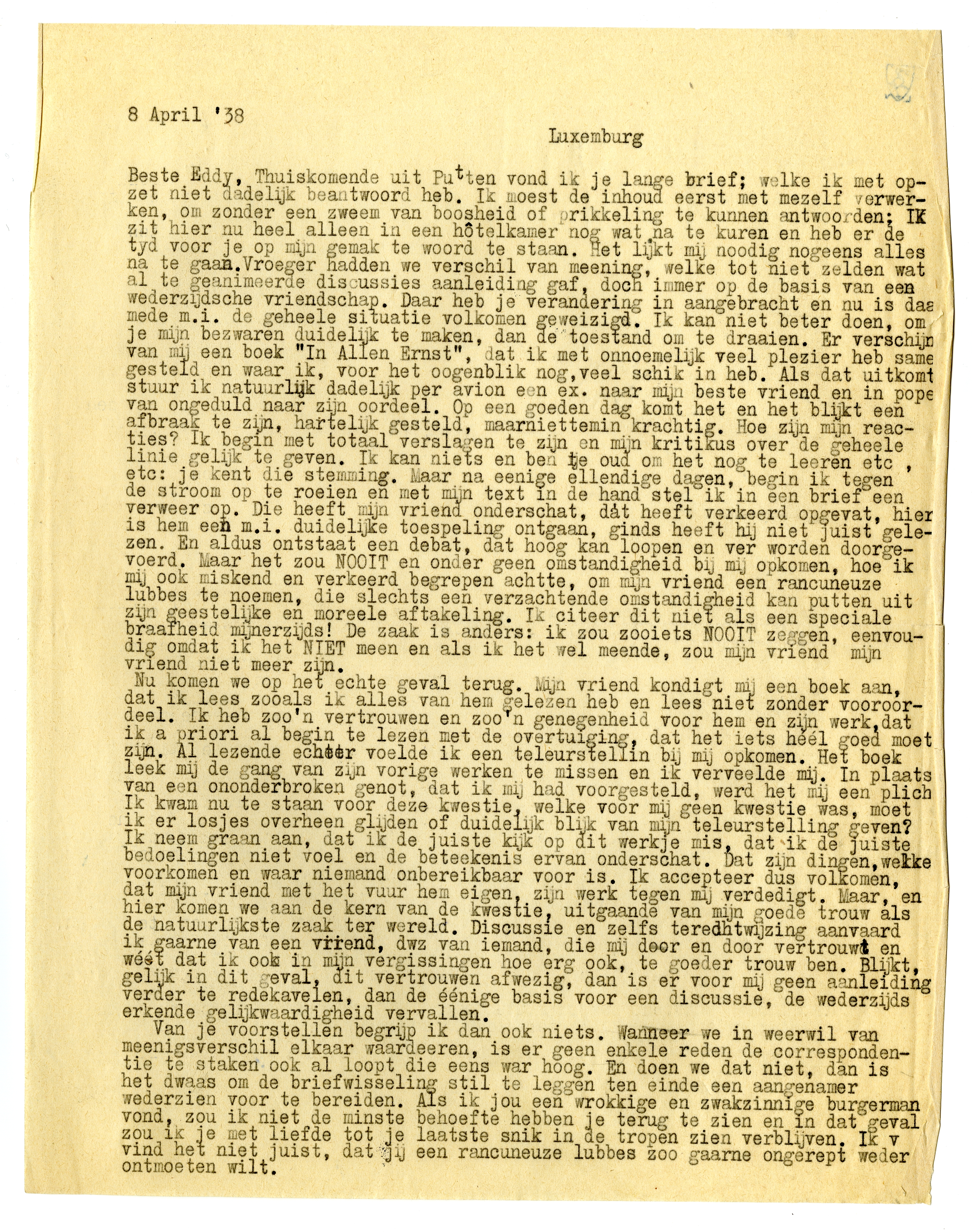 Beste Eddy, Thuiskomende uit Putten vond ik je lange brief; welke ik met opzet niet dadelijk beantwoord heb. Ik moest de inhoud eerst met mezelf verwerken, om zonder een zweem van boosheid of prikkeling te kunnen antwoorden; ik zit hier nu heel alleen in een hôtelkamer nog wat na te kuren en heb er de tyd voor je op mijn gemak te woord te staan. Het lijkt me noodig nogeens alles na te gaan. Vroeger hadden we verschil van meening, welke tot niet zelden wat al te geanimeerde discussies aanleiding gaf, doch immer op de basis van een wederzijdsche vriendschap. Daar heb je verandering in aangebracht en nu is daar mede m.i. de geheele situatie volkomen gewijzigd . Ik kan niet beter doen, om je mijn bezwaren duidelijk te maken, dan de toestand om te draaien. Er verschijnt van mij een boek "In Allen Ernst", dat ik met onnoemelijk veel plezier heb samengesteld en waar ik, voor het oogenblik nog, veel schik in heb. Als dat uitkomt stuur ik natuurlijk dadelijk per avion een ex. naar mijn beste vriend en ik popel van ongeduld naar zijn oordeel. Op een goeden dag komt het en het blijkt een afbraak te zijn, hartelijk gesteld, maar niettemin krachtig. Hoe zijn mijn reacties? Ik begin met totaal verslagen te zijn en mijn kritikus over de geheele linie gelijk te geven. Ik kan niets en ben te oud om het nog te leeren, etc: je kent die stemming. Maar na eenige ellendige dagen, begin ik tegen de stroom op te roeien en met mijn text in de hand stel ik in een brief een verweer op. Die heeft mijn vriend onderschat, dát heeft verkeerd opgevat, hier is hem een m.i. duidelijke toespeling ontgaan, ginds heeft hij niet juist gelezen. En aldus ontstaat een debat , dat hoog kan loopen en ver worden doorgevoerd. Maar het zou NOOIT en onder geen omstandigheid bij mij opkomen, hoe ik mij ook miskend en verkeerd begrepen achtte, om mijn vriend een rancuneuze lubbes te noemen, die slechts een verzachtende omstandigheid kan putten uit zijn geestelijke en moreele aftakeling. Ik citeer dit niet als een speciale braafheid mijner zijds! De zaak is anders: ik zou zooiets NOOIT zeggen, eenvoudig omdat ik het NIET meen en als ik het wel meende, zou mijn vriend mijn vriend niet meer zijn.