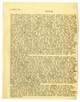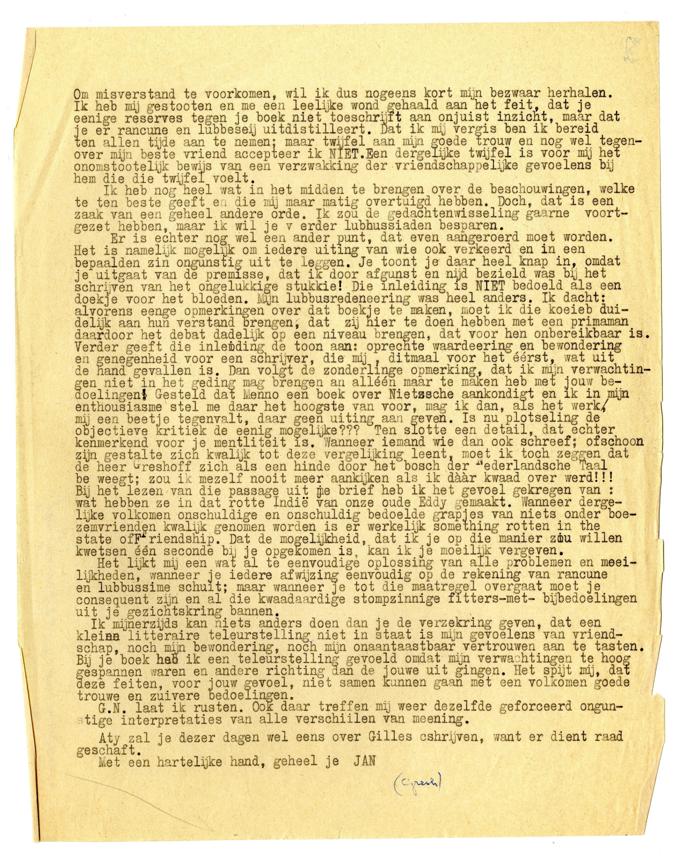Om misverstand te voorkomen, wil ik dus nogeens kort mijn bezwaar herhalen. Ik heb mij gestooten en me een leelijke wond gehaald aan het feit, dat je eenige reserves tegen je boek niet toeschrijft aan onjuist inzicht, maar dat je er rancune en lubbeserij uitdistilleert. Dat ik mij vergis ben ik bereid ten allen tijde aan te nemen; maar twijfel aan mijn goede trouw en nog wel tegenover mijn beste vriend accepteer ik NIET. Een dergelijke twijfel is voor mij het onomstootelijk bewijs van een verzwakking der vriendschappelijke gevoelens bij hem die die twijfel voelt.