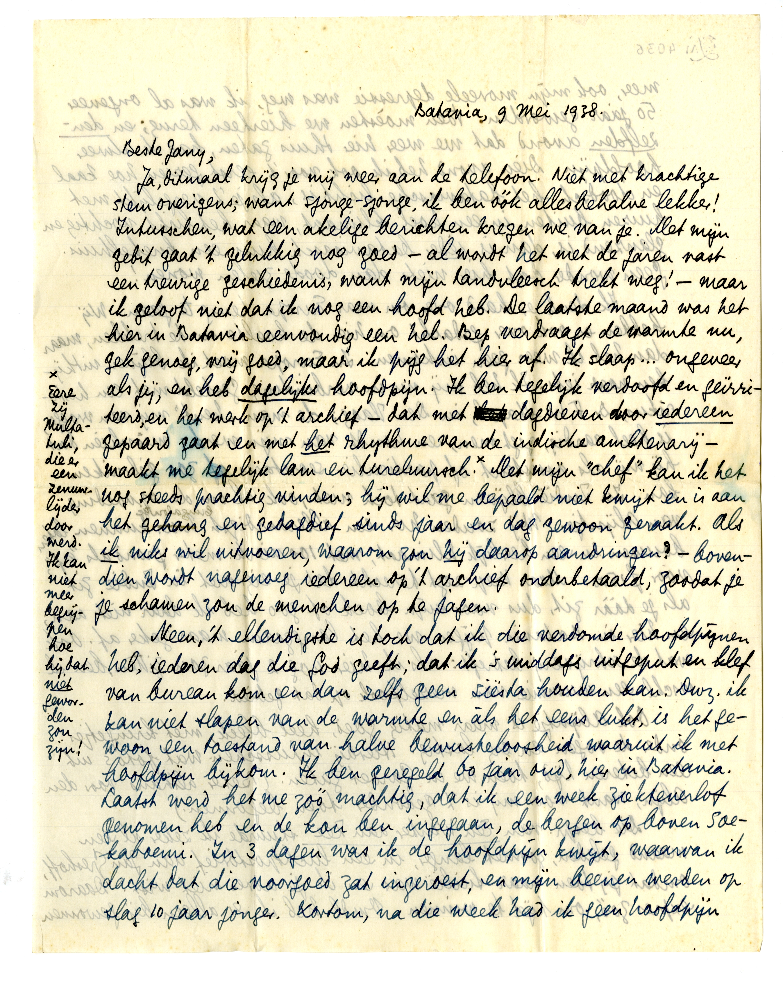 Ja, ditmaal krijg je mij weer aan de telefoon. Niet met krachtige stem overigens; want sjonge-sjonge, ik ben óók alles behalve lekker! Intusschen, wat een akelige berichten kregen we van je. Met mijn gebit gaat 't gelukkig nog goed - al wordt het met de jaren vast een treurige geschiedenis, want mijn tandvleesch trekt weg! - maar ik geloof niet dat ik nog een hoofd heb. De laatste maand was het hier in Batavia eenvoudig een hel. Bep verdraagt de warmte nu, gek genoeg, vrij goed, maar ik pijg het hier af. Ik slaap... ongeveer als jij, en heb dagelijks hoofdpijn. Ik ben tegelijk verdoofd en geïrriteerd, en het werk op 't archief - dat met dagdieven door iedereen gepaard gaat en met het rhythme van de indische ambtenarij - maakt me tegelijk lam en tureluursch.* Met mijn ‘chef’ kan ik het nog steeds prachtig vinden; hij wil me bepaald niet kwijt en is aan het gehang en gedagdief sinds jaar en dag gewoon geraakt. Als ik niks wil uitvoeren, waarom zou hij daarop aandringen? - bovendien wordt nagenoeg iedereen op 't archief onderbetaald, zoodat je je schamen zou de menschen op te jagen.