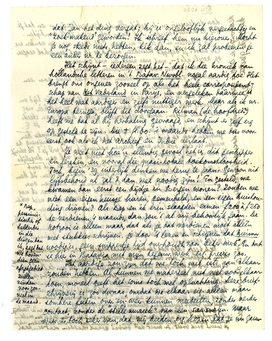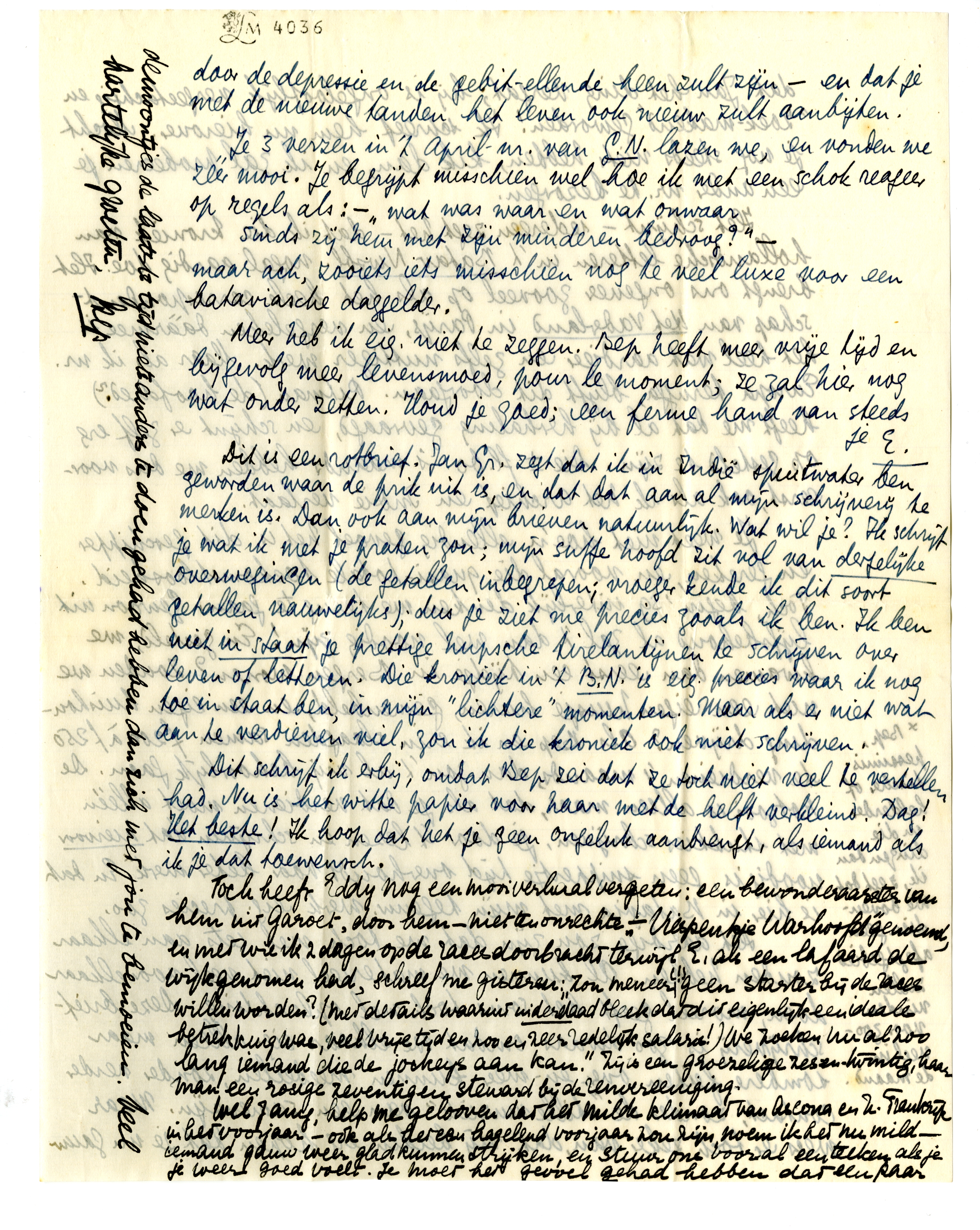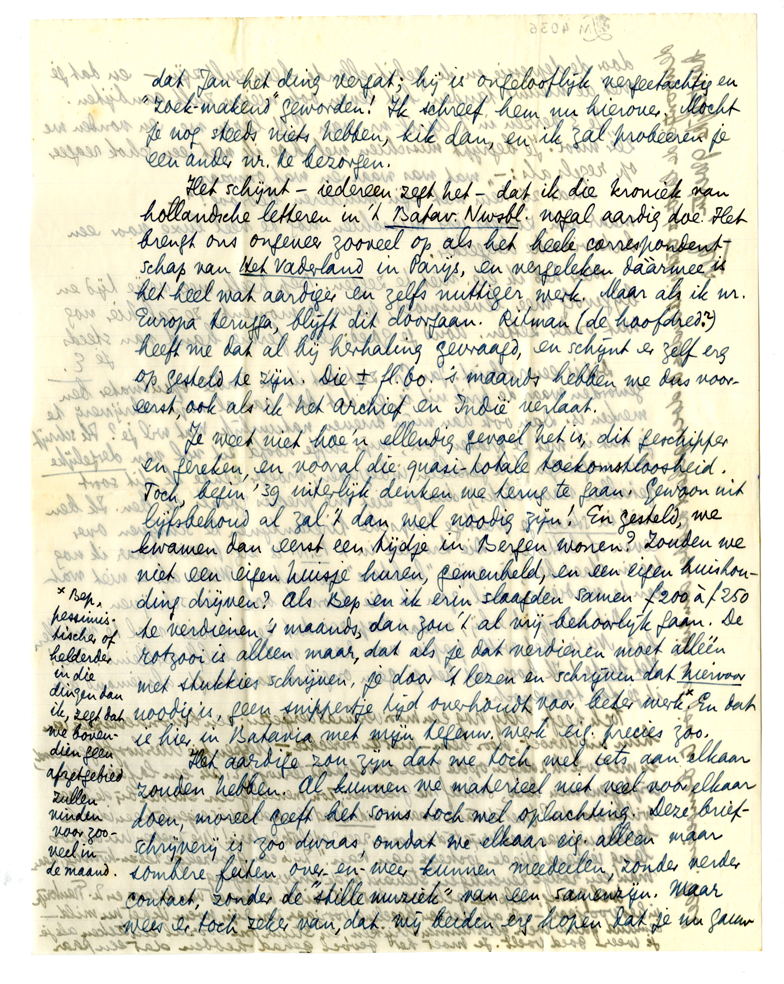 Het schijnt - iedereen zegt het - dat ik die kroniek van hollandsche letteren in 't Batav. Nwsbl. nogal aardig doe. Het brengt ons ongeveer zooveel op als het heele correspondentschap van Het Vaderland in Parijs, en vergeleken dààrmee is het heel wat aardiger en zelfs nuttiger werk. Maar als ik nr. Europa terugga, blijft dit doorgaan. Ritman (de hoofdred.r) heeft me dat al bij herhaling gevraagd, en schijnt er zelf erg op gesteld te zijn. Die ± fl. 60. 's maands hebben we dus vooreerst, ook als ik het Archief en Indië verlaat.