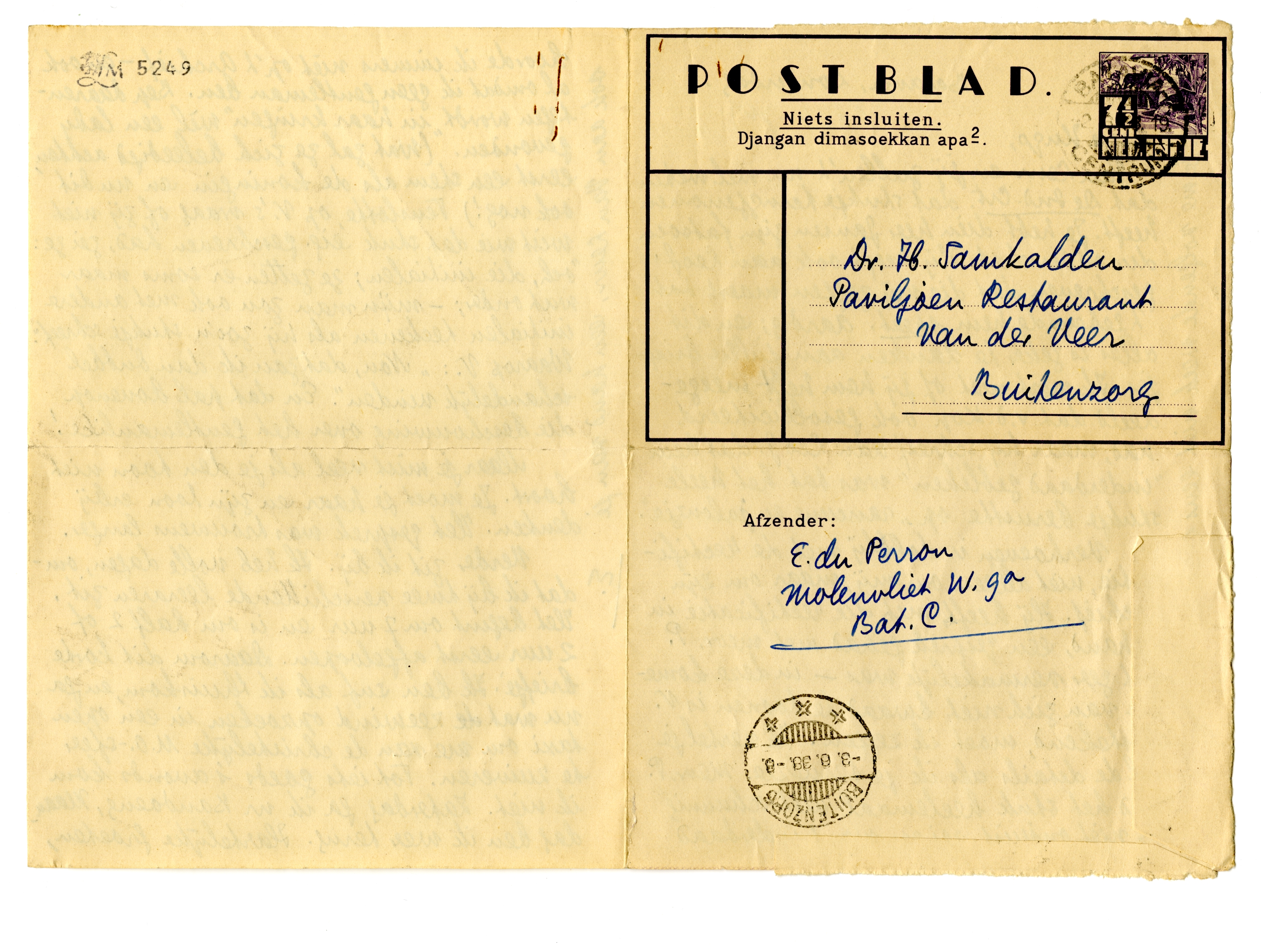 Verder zit ik bij. Ik heb volle dagen, omdat ik bij twee verschil-lende leeraren zit. Het begint om 7 uur en is om half 2 of 2 uur eerst afgeloopen. Daarom dit korte briefje. Ik ben suf als ik thuis kom, en ga nu wat de zeewind opzoeken in een open taxi om me van de christelijke M.O.-sfeer te zuiveren. Tot iets goeds 's avonds kom ik niet. Zaterdag ga ik nr. Bandoeng, Maandag ben ik weer terug. Hartelijke groeten, ook aan Van Leur, een hand van je