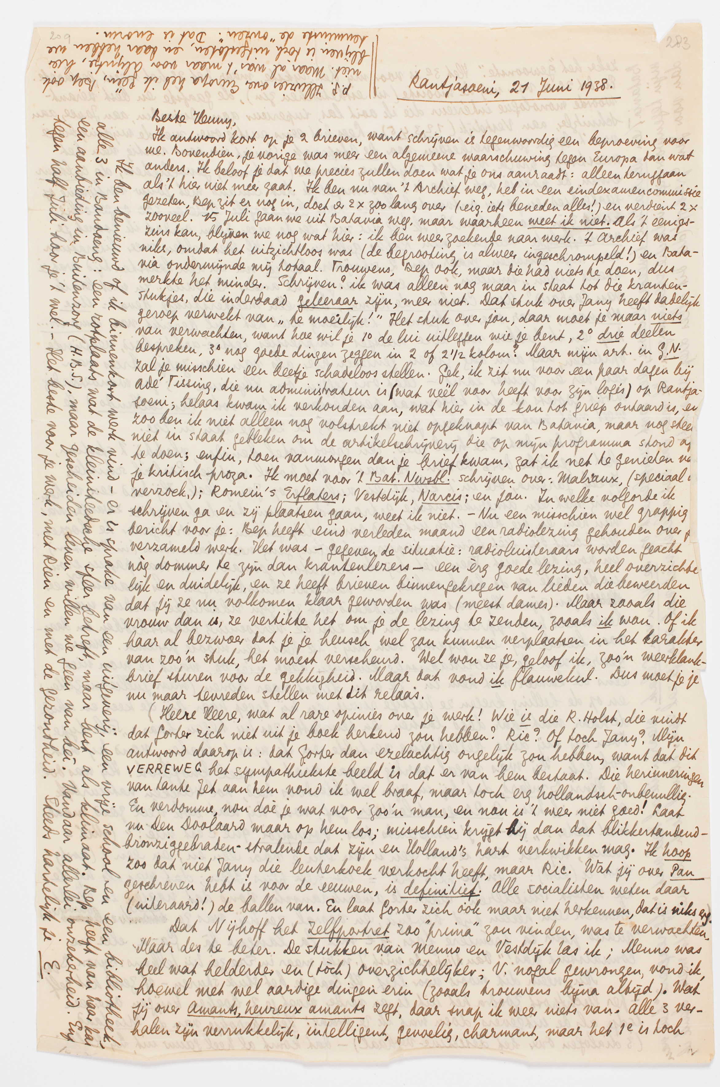 Ik antwoord kort op je 2 brieven, want schrijven is tegenwoordig een beproeving voor me. Bovendien, je vorige was meer een algemeene waarschuwing tegen Europa dan wat anders. Ik beloof je dat we precies zullen doen wat je ons aanraadt: alleen teruggaan als 't hier niet meer gaat. Ik ben nu van 't Archief weg, heb in een eindexamencommissie gezeten, Bep zit er nog in, doet er 2 × zoo lang over (eig. iets beneden alles!) en verdient 2 × zooveel. 15 Juli gaan we uit Batavia weg, maar waarheen weet ik niet. Als 't eenigszins kan, blijven we nog wat hier: ik ben weer zoekende naar werk. 't Archief was niks, omdat het uitzichtloos was (de begrooting is alweer ingeschrompeld!) en Batavia ondermijnde mij totaal. Trouwens, Bep ook, maar die had niets te doen, dus merkte het minder. Schrijven? ik was alleen nog maar in staat tot die krantenstukjes, die inderdaad geleeraar zijn, meer niet. Dat stuk over Jany heeft dadelijk geroep verwekt van ‘te moeilijk!’5426 Het stuk over jou, daar moet je maar niets van verwachten, want hoe wil je 1o de lui uitleggen wie je bent, 2o drie deelen bespreken, 3o nog goede dingen zeggen in 2 of 2½ kolom? Maar mijn art. in G.N.5427 zal je misschien een beetje schadeloos stellen. Gek, ik zit nu voor een paar dagen bij Adé Tissing, die nu administrateur is (wat véél voor heeft voor zijn logés) op Rantjasoeni; helaas kwam ik verkouden aan, wat hier in de kou tot griep ontaard is, en zoo ben ik niet alleen nog volstrekt niet opgeknapt van Batavia, maar nog steeds niet in staat gebleken om de artikelschrijverij die op mijn programma stond af te doen; enfin, toen vanmorgen dan je brief kwam, zat ik net te genieten van je kritisch proza. Ik moet voor 't Bat. Nwsbl. schrijven over: Malraux, (speciaal op verzoek,); Romein's Erflaters; Vestdijk, Narcis; en jou. In welke volgorde ik schrijven ga en zij plaatsen gaan, weet ik niet. - Nu een misschien wel grappig bericht voor je: Bep heeft eind verleden maand een radiolezing gehouden over je verzameld werk.5428 Het was - gegeven de situatie: radioluisteraars worden geacht nòg dommer te zijn dan krantenlezers - een èrg goede lezing, heel overzichtelijk en duidelijk, en ze heeft brieven binnengekregen van lieden die beweerden dat jij ze nu volkomen klaar geworden was (meest dames). Maar zooals die vrouw dan is, ze vertikte het om je de lezing te zenden, zooals ik wou. Of ik haar al bezwoer dat je je heusch wel zou kunnen verplaatsen in het karakter van zoo'n stuk, het moest verscheurd. Wel wou ze je, geloof ik, zoo'n weerklankbrief sturen voor de gekkigheid. Maar dat vond ik flauwekul. Dus moet je je nu maar tevreden stellen met dit relaas.