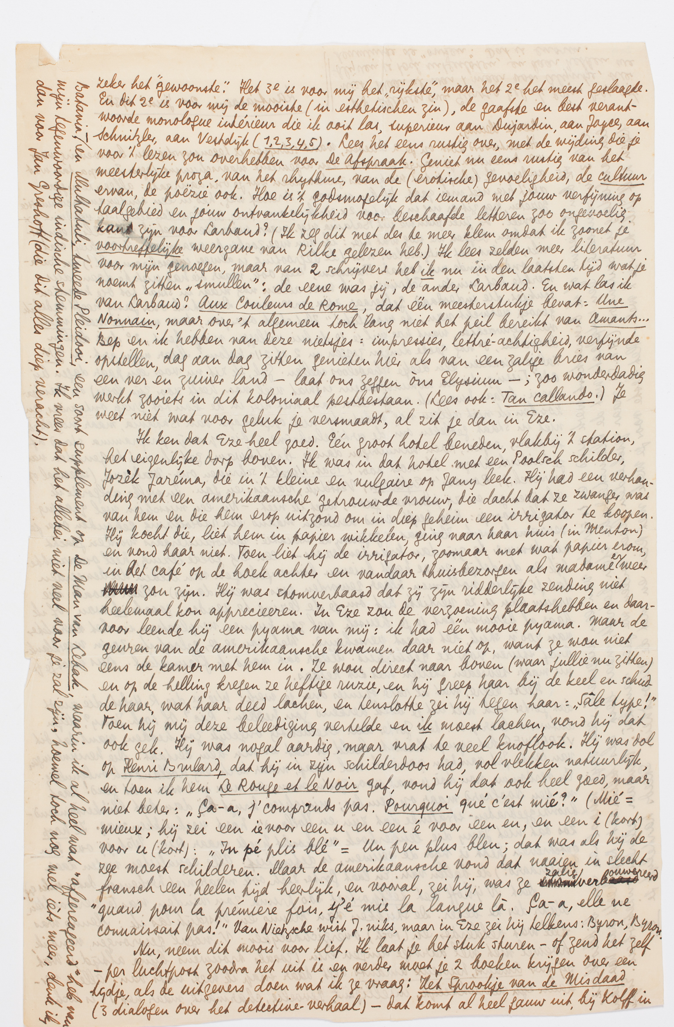 Ik ken dat Eze heel goed. Eén groot hotel beneden, vlakbij 't station, het eigenlijke dorp boven. Ik was in dat hotel met een Poolsch schilder, Jozèk Jaréma, die in 't kleine en vulgaire op Jany leek. Hij had een verhouding met een amerikaansche getrouwde vrouw, die dacht dat ze zwanger was van hem en die hem erop uitzond om in diep geheim een irrigator te koopen. Hij kocht die, liet hem in papier wikkelen, ging naar haar huis (in Menton) en vond haar niet. Toen liet hij de irrigator, zoomaar met wat papier erom, in het café op de hoek achter en vandaar thuisbezorgen als madame er weer zou zijn. Hij was stomverbaasd dat zij zijn ridderlijke zending niet heelemaal kon apprecieeren. In Eze zou de verzoening plaatshebben en daarvoor leende hij een pyama van mij: ik had één mooie pyama. Maar de geuren van de amerikaansche kwamen daar niet op, want ze wou niet eens de kamer met hem in. Ze wou direct naar boven (waar jullie nu zitten) en op de helling kregen ze heftige ruzie, en hij greep haar bij de keel en schudde haar, wat haar deed lachen, en tenslotte zei hij tegen haar: ‘Sâle type!’ Toen hij mij deze beleediging vertelde en ik moest lachen, vond hij dat ook gek. Hij was nogal aardig, maar vrat te veel knoflook. Hij was dol op Henri Brulard, dat hij in zijn schilderdoos had, vol vlekken natuurlijk, en toen ik hem Le Rouge et le Noir gaf, vond hij dat ook heel goed, maar niet beter: ‘Ça-a, j'comprends pas. Pourquoi qué c'est mié? (Mié = mieux; hij zei een ie voor een u en een é voor een eu, en een i(kort) voor u(kort): ‘In pé plis blé’ = Un peu plus bleu; dat was als hij de zee moest schilderen. Maar de amerikaansche vond dat naaien in slecht fransch een heelen tijd heerlijk, en vooral, zei hij, was ze zalig verbouwereerd ‘quand pour la prémiere fois, y'é mis la langue là. Ça-a, elle ne connaissait pas!’ Van Nietzsche wist J. niks, maar in Eze zei hij telkens: Byron, Byron.