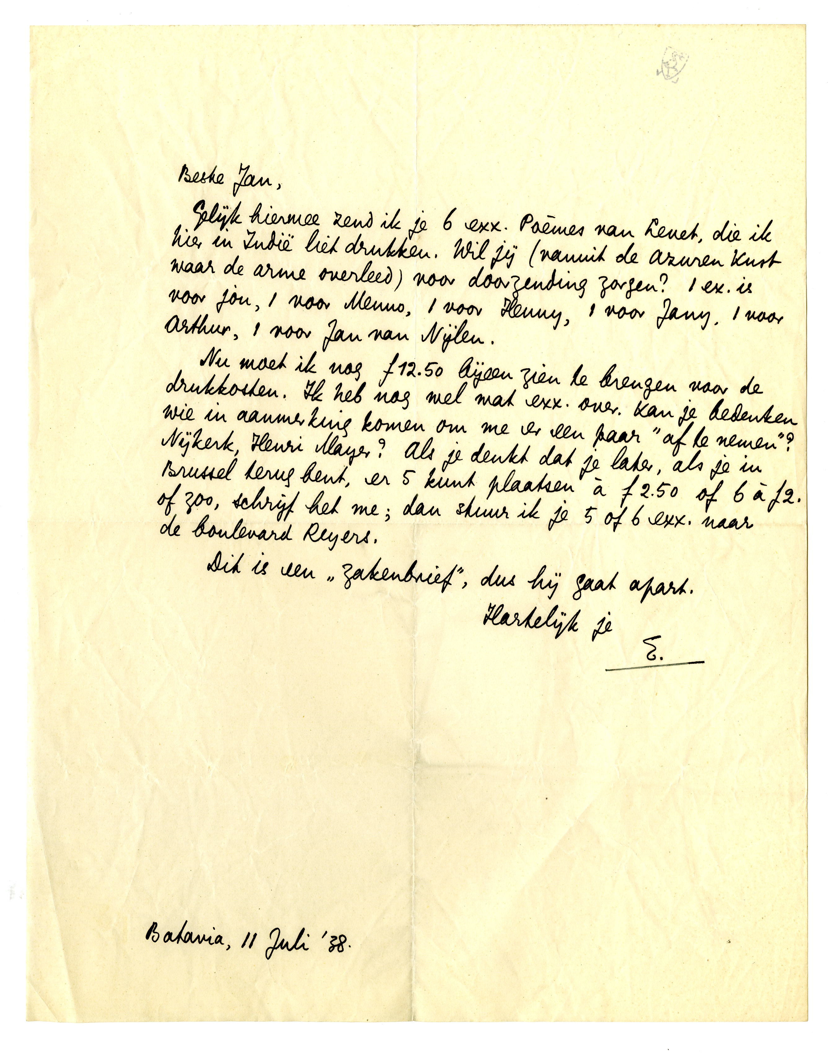 Gelijk hiermee zend ik je 6 exx. Poèmes van Levet, die ik hier in Indië liet drukken.5453 Wil jij (vanuit de Azuren Kust waar de arme overleed) voor doorzending zorgen? 1 ex. is voor jou, 1 voor Menno, 1 voor Henny, 1 voor Jany, 1 voor Arthur, 1 voor Jan van Nijlen.