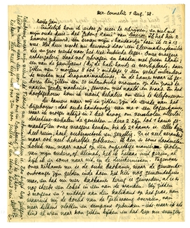 Nu onze verdere avonturen. Misschien heeft Jan je daar iets van verteld. Zoowel Bep als ik zijn eig. in Batavia doorloopend ellendig geweest; ik nog erger dan Bep, maar dat komt wschl. omdat zij niets hoefde te doen, terwijl ik van half 8 tot half 2 op 't Landsarchief zat en dan nog 's middags en 's avonds voor mezelf probeerde te werken. Behalve een litteraire kroniek voor 't Bataviaasch Nieuwsblad, heb ik daar geschreven: Multatuli, tweede pleidooi, dat nu binnenkort uitkomt en je natuurlijk zal worden gezonden. Het bestaat uit 2 dln.: het 1e een polemiek + voortzetting (gedeeltelijk) van De Man v. Lebak, op het thema: Multatuli en Jan Lubbes = de Hollander. Het 2e is niets dan bronnenpublikatie: dokumenten betreffende Multatuli's dienst op Menado en Ambon, die ik op 't Archief heb opgescharreld. Ik heb daarbij erg veel geluk gehad, want deze archivalia, die anders heelemaal in de Molukken en op Celebes hadden moeten worden opgespoord, zijn nog maar zeer kort op het Landsarchief: die van Ambon sinds 1927, maar die van Menado (die veel belangrijker zijn, omdat er allerlei dokumenten in M.'s eigen hand bij waren) nu pas, vanaf 1935 tot nu, om zoo te zeggen een maand geleden, naar Batavia opgezonden. De archivaris, die zich heelemaal tot mijn vrienden rekent, heeft me hierin laten grasduinen, terwijl die dossiers nog heelemaal braak liggen en voor het publiek ontoegankelijk zijn. Alles bijeen dus toch nogal grappig, geloof ik, al is 't niet erg belangrijk.