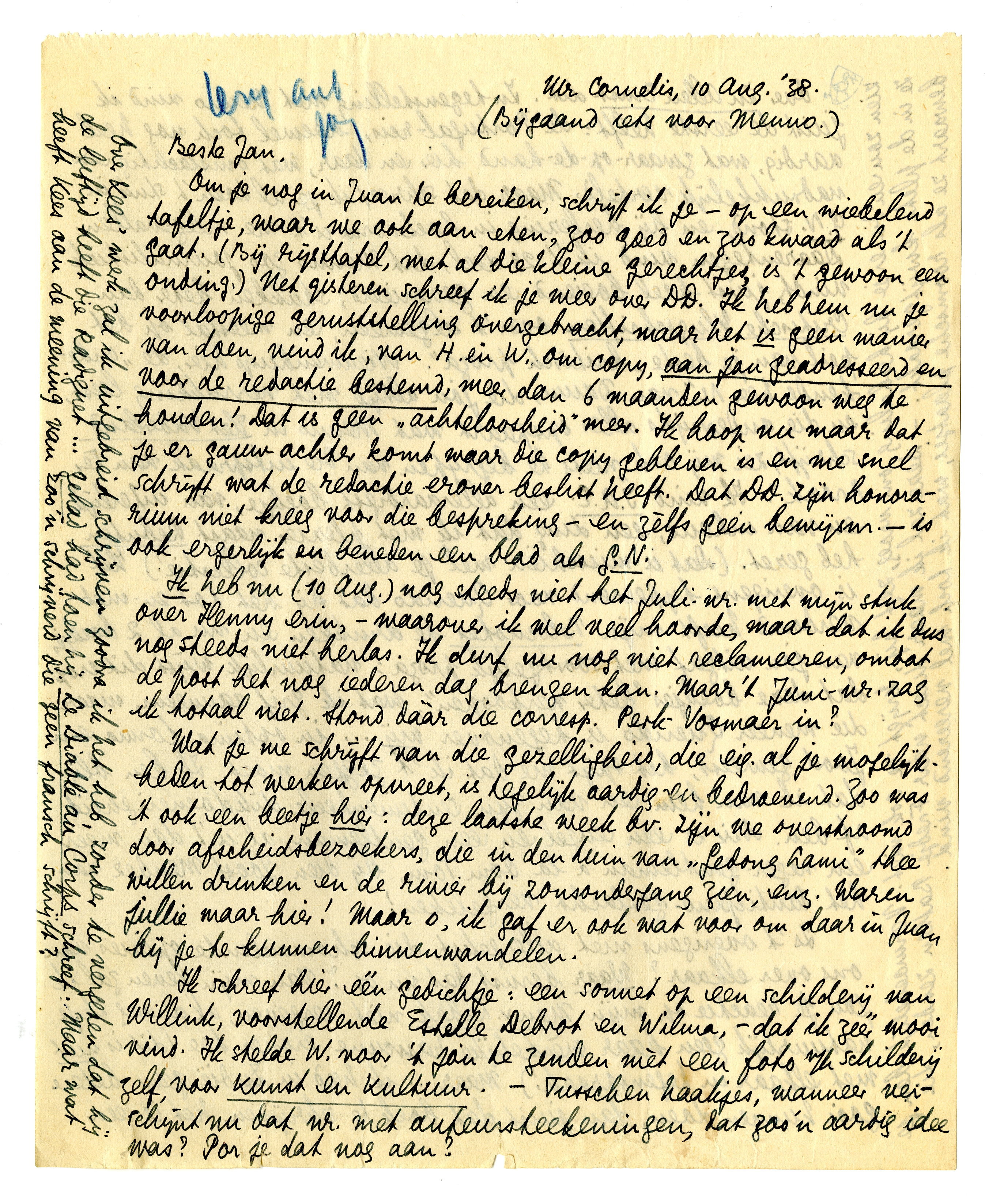 Ik heb nu (10 Aug.) nog steeds niet het Juli-nr. met mijn stuk over Henny erin, - waarover ik wel veel hoorde, maar dat ik dus nog steeds niet herlas. Ik durf nu nog niet reclameeren, omdat de post het nog iederen dag brengen kan. Maar 't Juni-nr. zag ik totaal niet. Stond dààr die corresp. Perk-Vosmaer in?5497