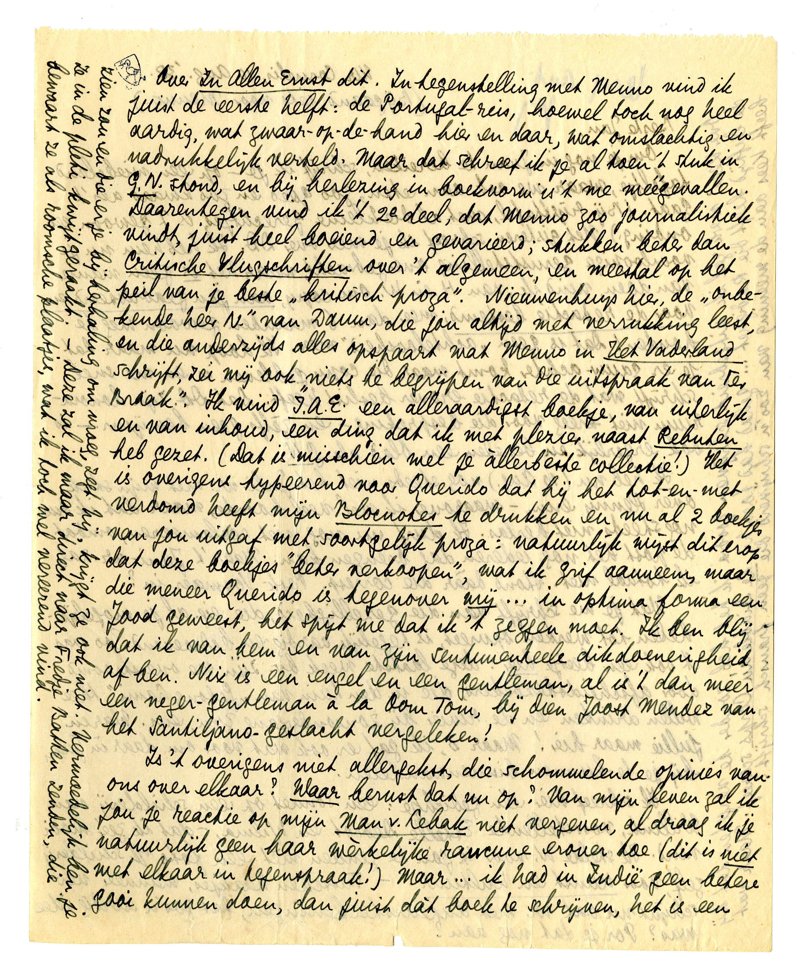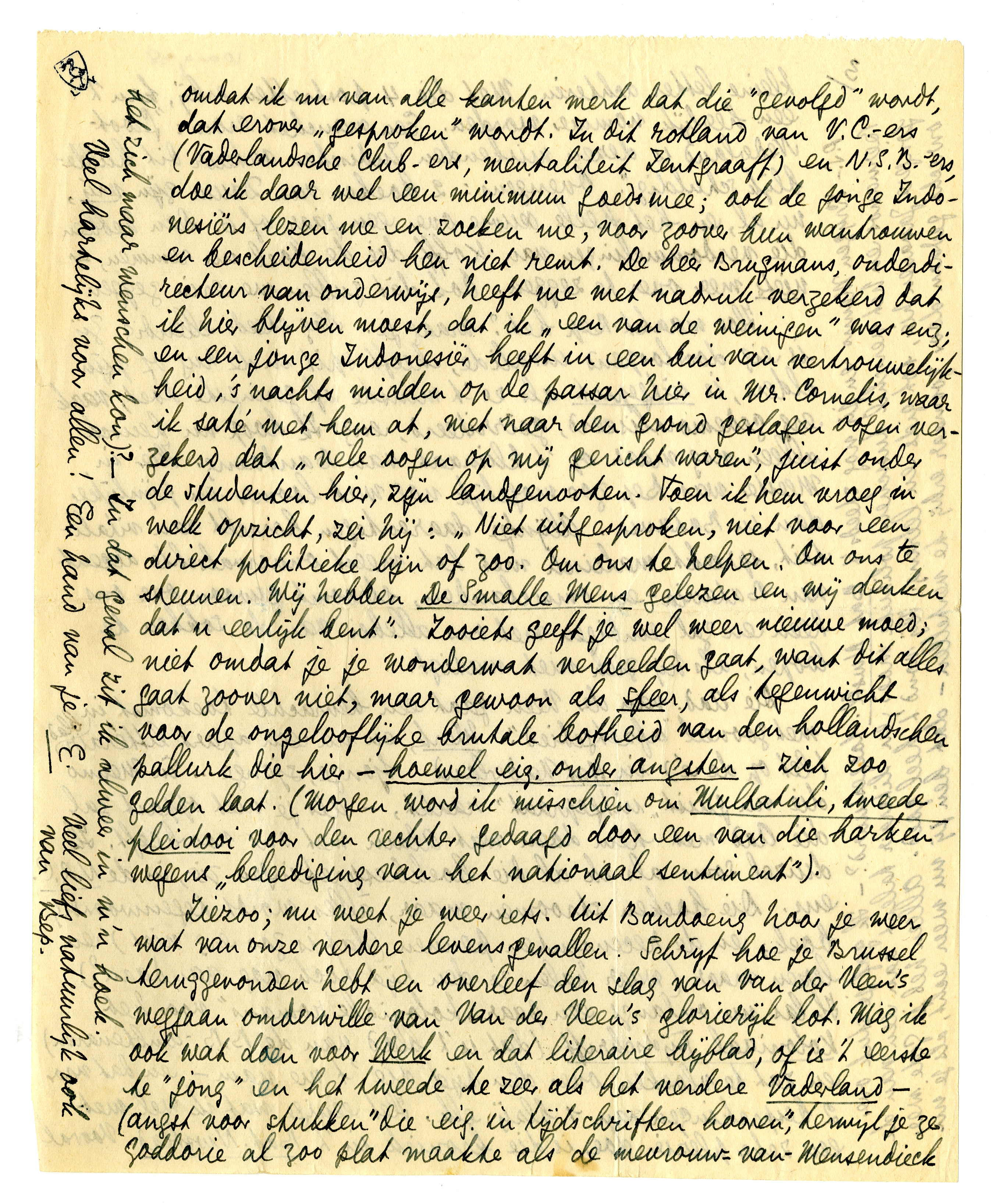 Ziezoo; nu weet je weer iets. Uit Bandoeng hoor je weer wat van onze verdere levensgevallen. Schrijf hoe je Brussel teruggevonden hebt en overleef den slag van Van der Veen's weggaan omderwille van Van der Veen's glorierijk lot. Mag ik ook wat doen voor Werk en dat literaire bijblad, of is 't eerste te ‘jong’ en het tweede te zeer als het verdere Vaderland - (angst voor stukken ‘die eig. in tijdschriften hooren’, terwijl je ze goddorie al zoo plat maakte als de mevrouw-van-Mensendieck het zich maar wenschen kon)? - In dat geval zit ik alweer in m'n hoek.