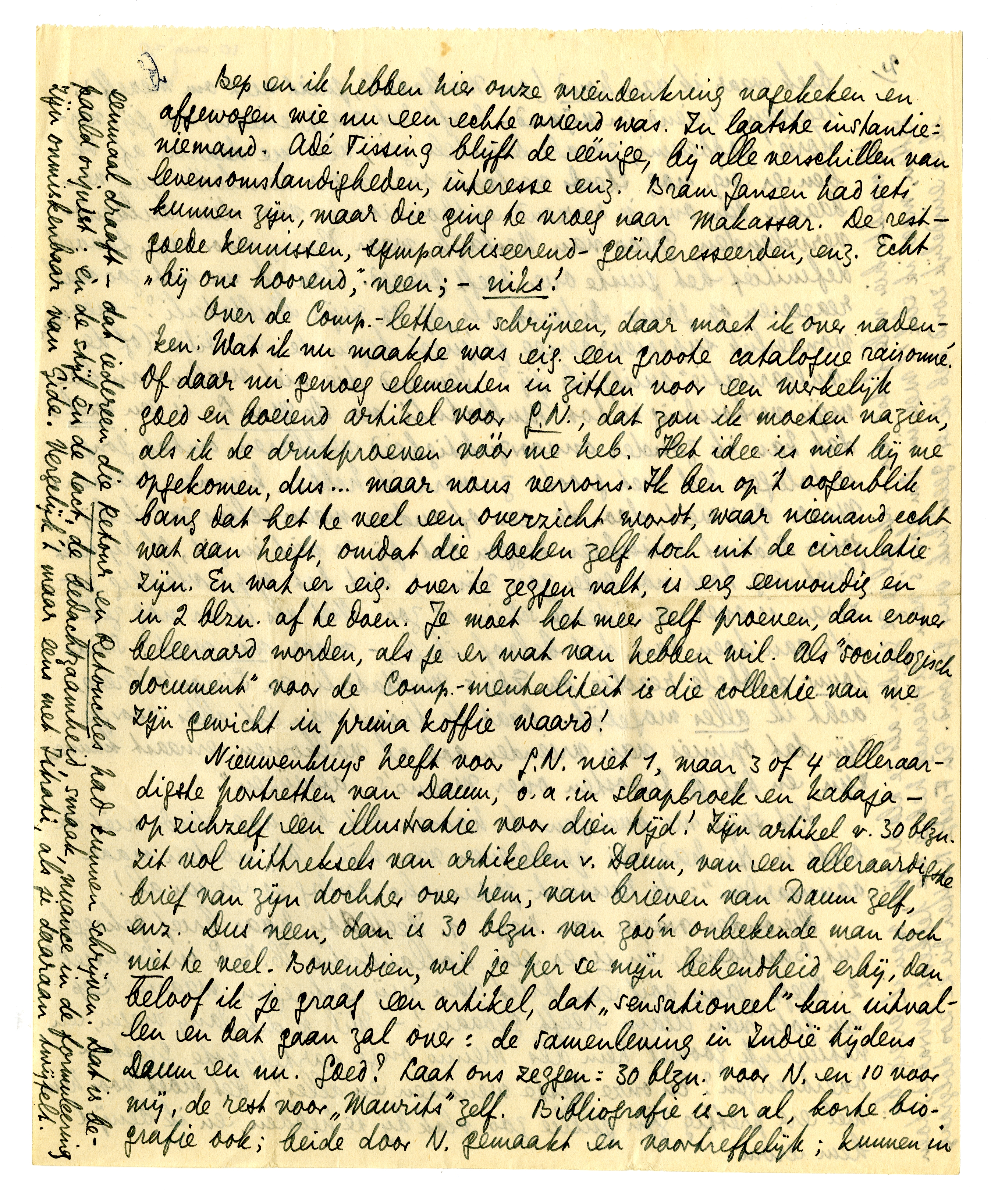 Nieuwenhuys heeft voor G.N. niet 1, maar 3 of 4 alleraardigste portretten van Daum, o.a. in slaapbroek en kabaja - op zichzelf een illustratie voor dien tijd! Zijn artikel v. 30 blzn. zit vol uittreksels van artikelen v. Daum, van een alleraardigste brief van zijn dochter over hem, van brieven van Daum zelf, enz. Dus neen, dan is 30 blzn. van zoo'n onbekende man toch niet te veel. Bovendien, wil je per se mijn bekendheid erbij, dan beloof ik je graag een artikel, dat ‘sensationeel’ kan uitvallen en dat gaan zal over: de samenleving in Indië tijdens Daum en nu. Goed? Laat ons zeggen: 30 blzn. voor N. en 10 voor mij, de rest voor ‘Maurits’ zelf. Bibliografie is er al, korte biografie ook; beide door N. gemaakt en voortreffelijk; kunnen in kleine letter achterin. Met die 4 portretten erbij, kan 't een heerlijk nommer worden. Een manchet erom: ‘Groot-Nederland is dezen miskenden Indischen auteur dit huldeblijk schuldig’. Overigens: 2 boeken van Daum zijn vrij, nu al, en het heele oeuvre over een jaar of 6. Dan hebben die verdommelingen van Kolff, die de boel nu remmen, er niets meer over te zeggen. Ook dat zullen we erin zeggen.