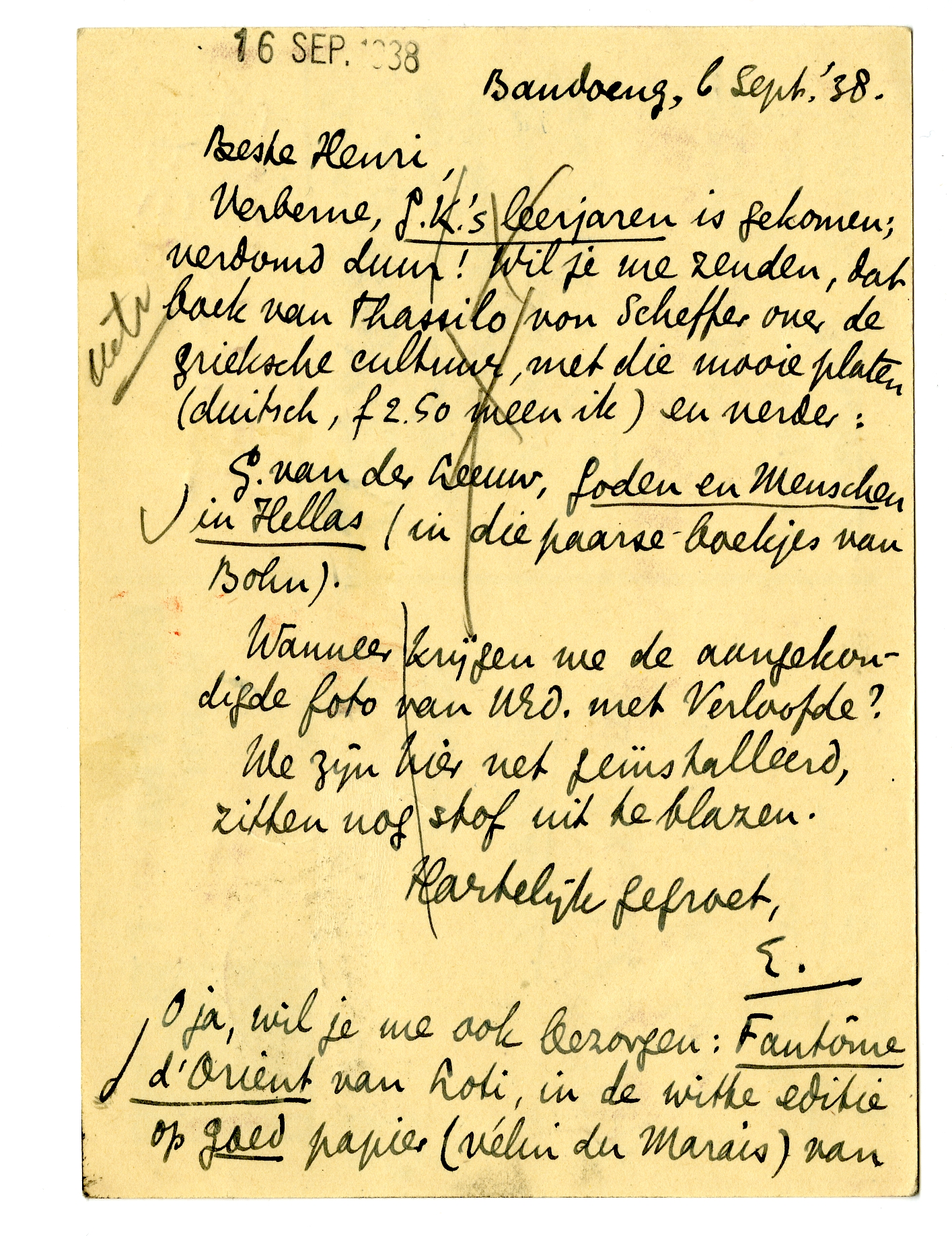 Verberne, G.K.'s leerjaren is gekomen; verdomd duur! Wil je me zenden, dat boek van Thassilo von Scheffer over de grieksche cultuur, met die mooie platen (duitsch, f 2.50 meen ik) en verder: