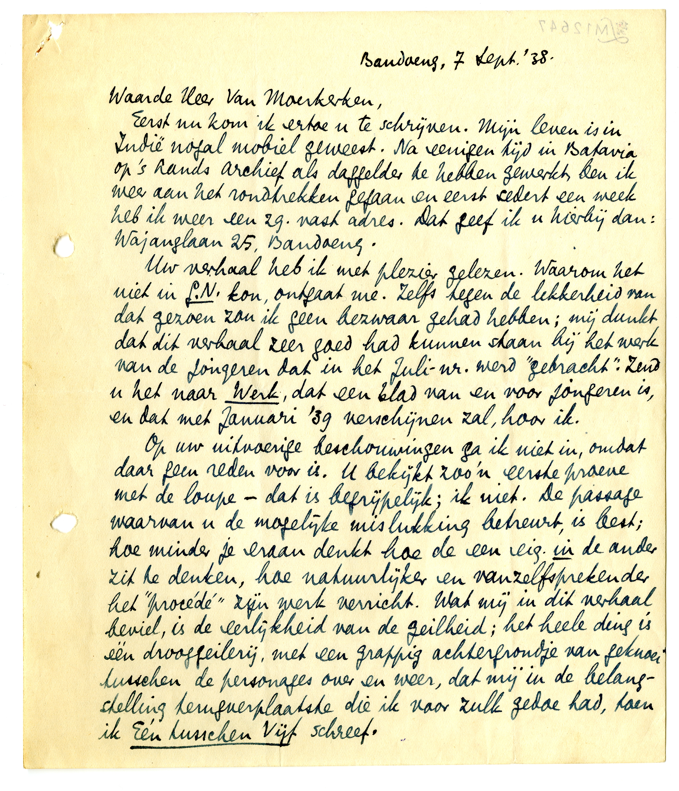 Eerst nu kom ik ertoe u te schrijven. Mijn leven is in Indië nogal mobiel geweest. Na eenigen tijd in Batavia op 's Lands Archief als daggelder te hebben gewerkt, ben ik weer aan het rondtrekken gegaan en eerst sedert een week heb ik weer een zg. vast adres. Dat geef ik u hierbij dan: Wajanglaan 25, Bandoeng.