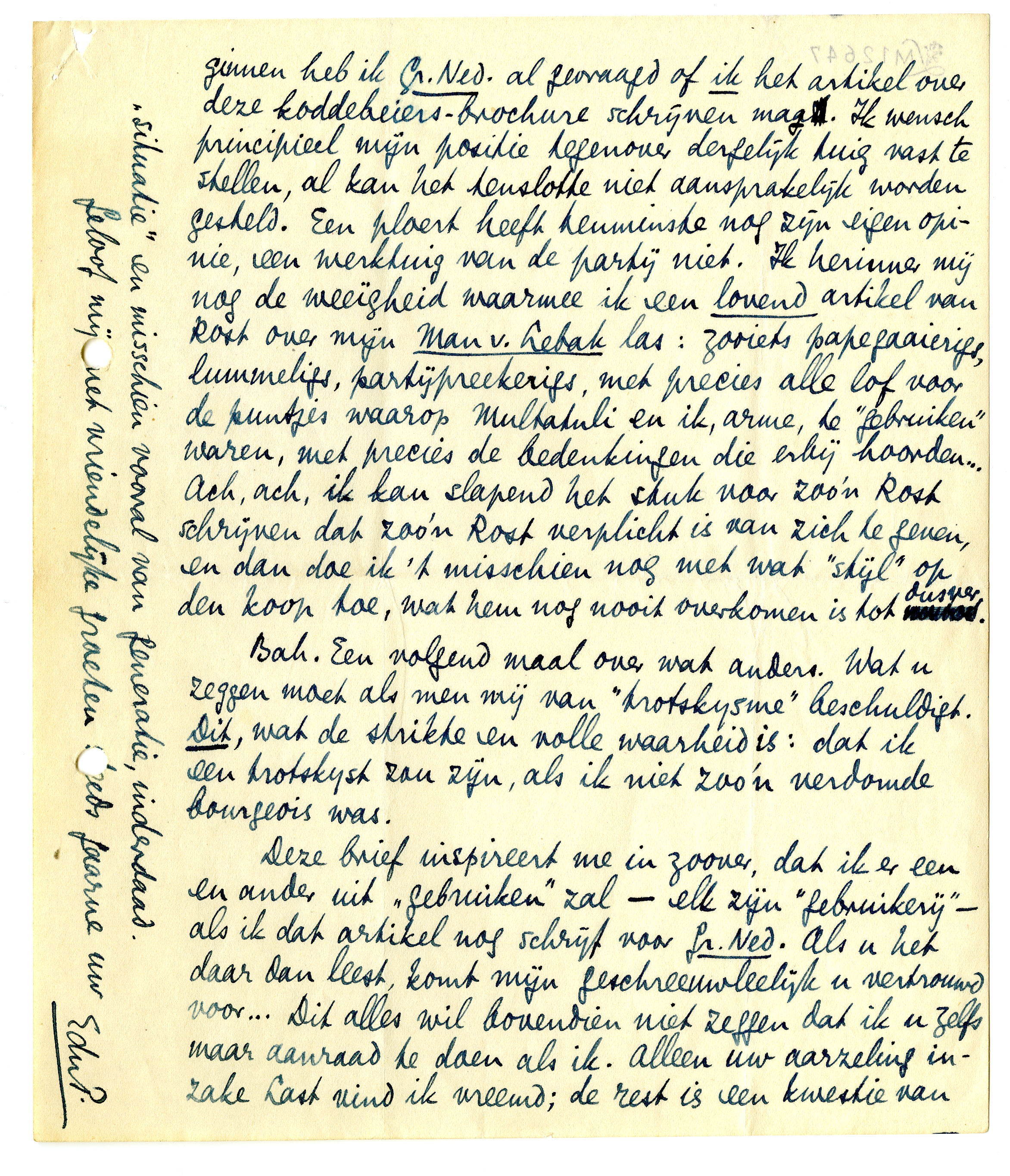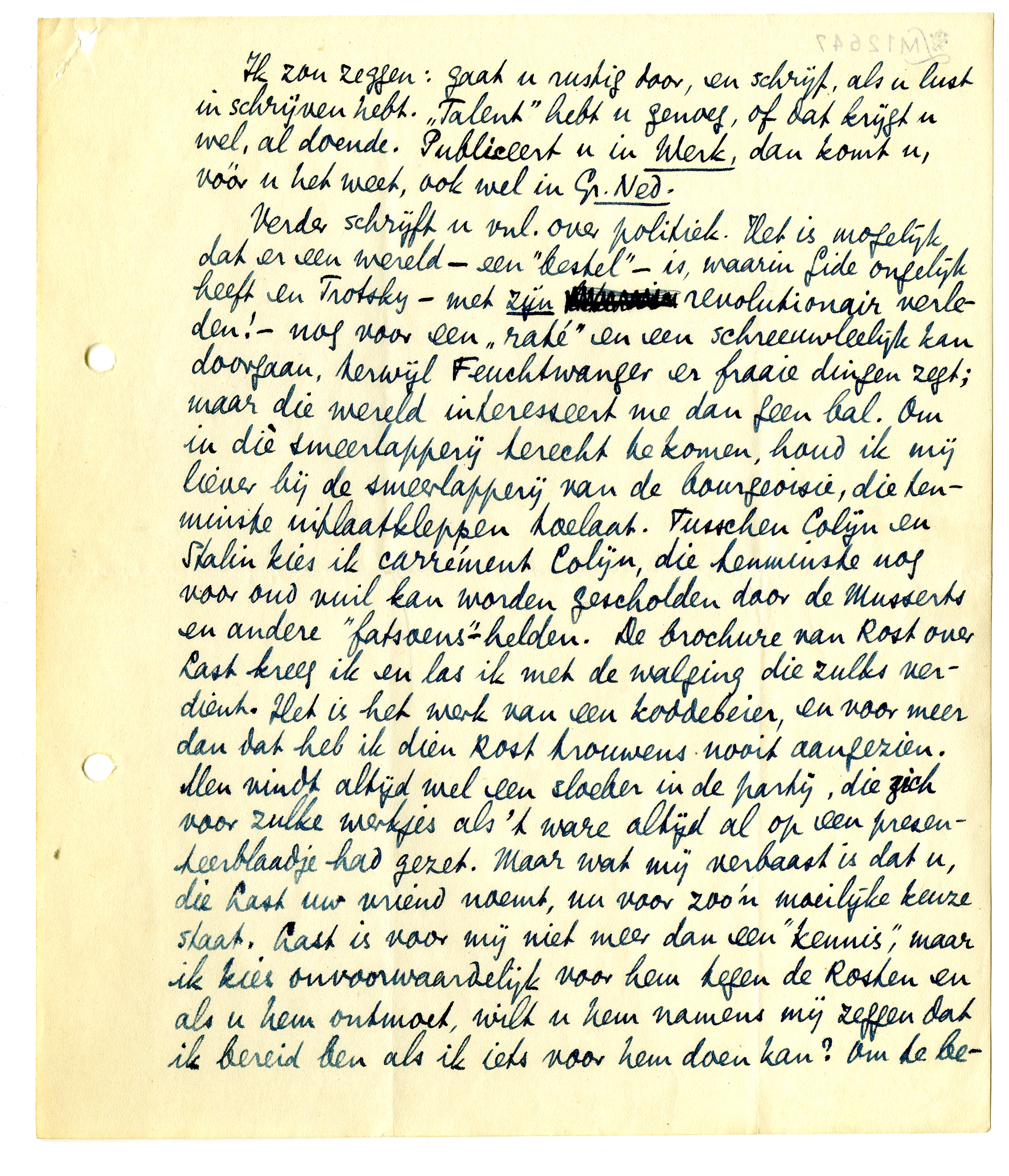 Verder schrijft u vnl. over politiek. Het is mogelijk dat er een wereld - een ‘bestel’ - is, waarin Gide ongelijk heeft en Trotsky - met zijn revolutionair verleden! - nog voor een ‘raté’ en een schreeuwleelijk kan doorgaan, terwijl Feuchtwanger er fraaie dingen zegt; maar die wereld interesseert me dan geen bal. Om in diè smeerlapperij terecht te komen, houd ik mij liever bij de smeerlapperij van de bourgeoisie, die tenminste uitlaatkleppen toelaat. Tusschen Colijn en Stalin kies ik carrément Colijn, die tenminste nog voor oud vuil kan worden gescholden door de Musserts en andere ‘fatsoens’-helden. De brochure van Rost over Last kreeg ik en las ik met de walging die zulks verdient. Het is het werk van een koddebeier, en voor meer dan dat heb ik dien Rost trouwens nooit aangezien. Men vindt altijd wel een sloeber in de partij, die zich voor zulke werkjes als 't ware altijd al op een presenteerblaadje had gezet. Maar wat mij verbaast is dat u, die Last uw vriend noemt, nu voor zoo'n moeilijke keuze staat. Last is voor mij niet meer dan een ‘kennis’, maar ik kies onvoorwaardelijk voor hem tegen de Rosten en als u hem ontmoet, wilt u hem namens mij zeggen dat ik bereid ben als ik iets voor hem doen kan? Om te beginnen heb ik Gr. Ned. al gevraagd of ik het artikel over deze koddebeiers-brochure schrijven mag. Ik wensch principieel mijn positie tegenover dergelijk tuig vast te stellen, al kan het tenslotte niet aansprakelijk worden gesteld. Een ploert heeft tenminste nog zijn eigen opinie, een werktuig van de partij niet. Ik herinner mij nog de weeïgheid waarmee ik een lovend artikel van Rost over mijn Man v. Lebak las: zooiets papegaaierigs, lummeligs, partijpreekerigs, met precies alle lof voor de puntjes waarop Multatuli en ik, arme, te ‘gebruiken’ waren, met precies de bedenkingen die erbij hoorden... Ach, ach, ik kan slapend het stuk voor zoo'n Rost schrijven dat zoo'n Rost verplicht is van zich te geven, en dan doe ik 't misschien nog met wat ‘stijl’ op den koop toe, wat hem nog nooit overkomen is tot dusver.