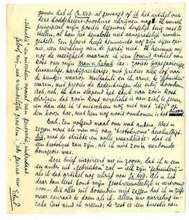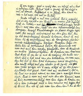 Op uw uitvoerige beschouwingen ga ik niet in, omdat daar geen reden voor is. U bekijkt zoo'n eerste proeve met de loupe - dat is begrijpelijk; ik niet. De passage waarvan u de mogelijke mislukking betreurt, is best; hoe minder je eraan denkt hoe de een eig. in de ander zit te denken, hoe natuurlijker en vanzelfsprekender het ‘procédé’ zijn werk verricht. Wat mij in dit verhaal beviel, is de eerlijkheid van de geilheid; het heele ding is één drooggeilerij, met een grappig achtergrondje van geknoei tusschen de personages over en weer, dat mij in de belangstelling terugverplaatste die ik voor zulk gedoe had, toen ik Eén tusschen Vijf schreef