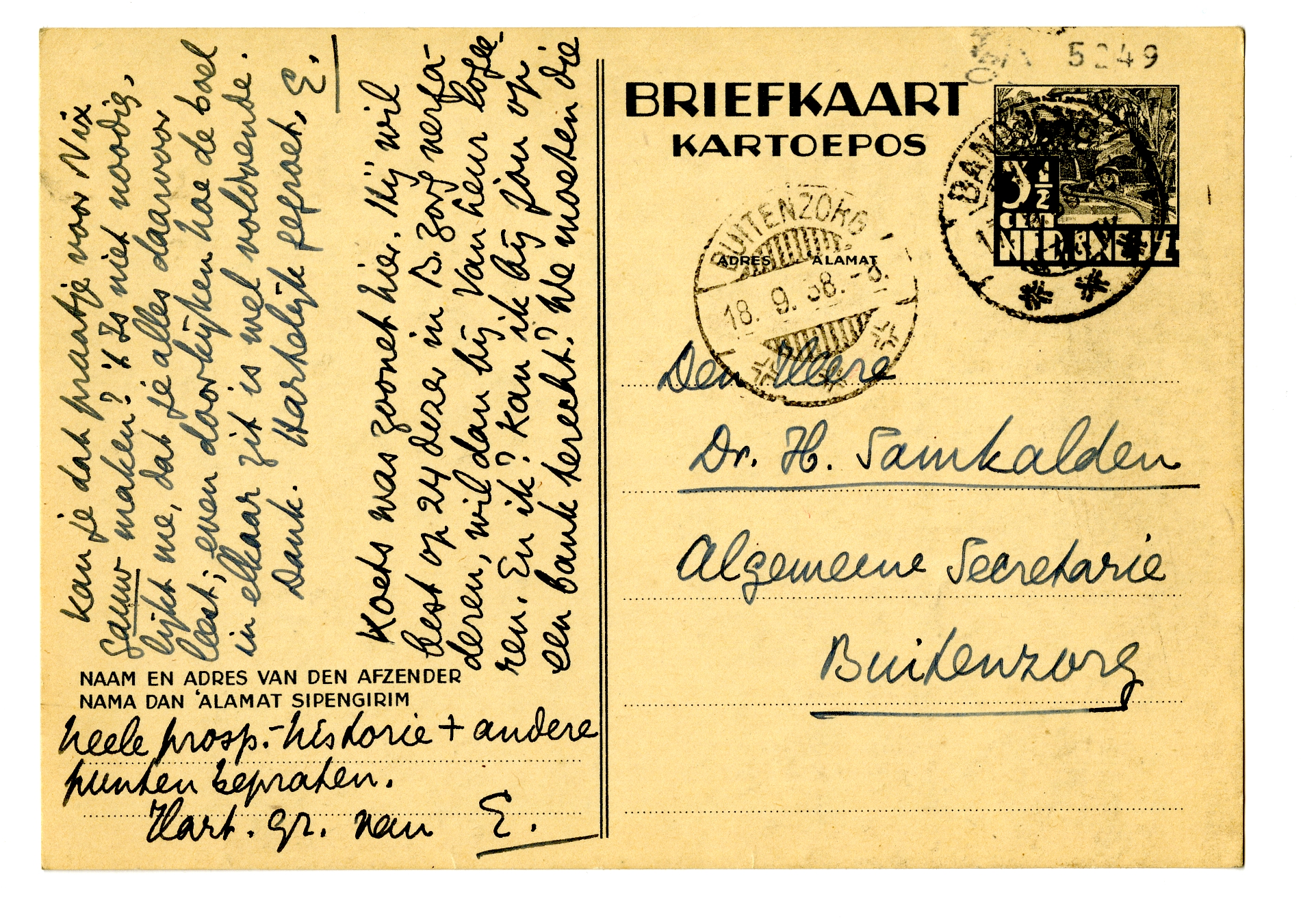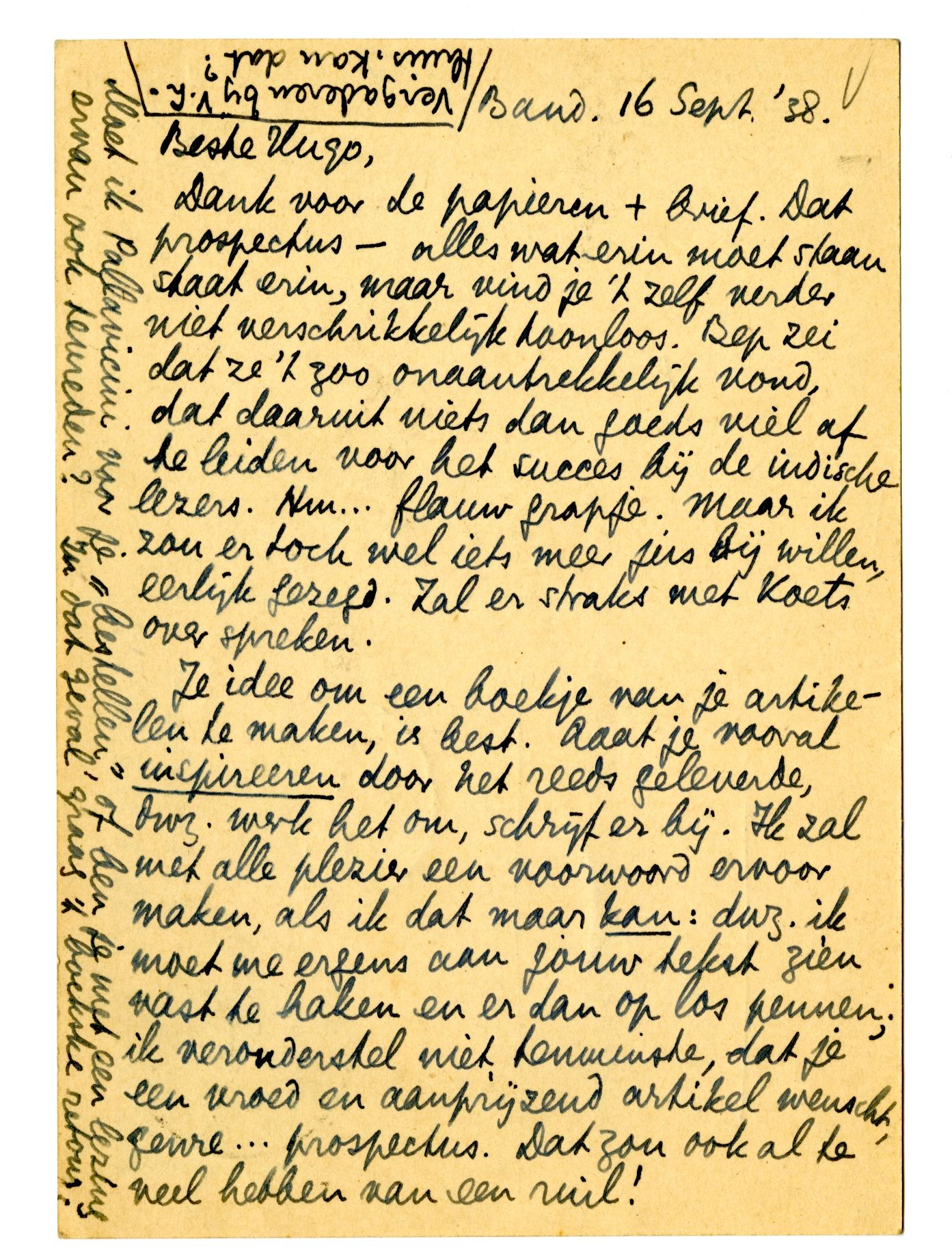 Dank voor de papieren + brief. Dat prospectus - alles wat erin moet staan staat erin, maar vind je 't zelf verder niet verschikkelijk toonloos? Bep zei dat ze 't zoo onaantrekkelijk vond, dat daaruit niets dan goeds viel af te leiden voor het succes bij de indische lezers. Hm... flauw grapje. Maar ik zou er toch wel iets meer jus bij willen, eerlijk gezegd. Zal er straks met Koets over spreken.