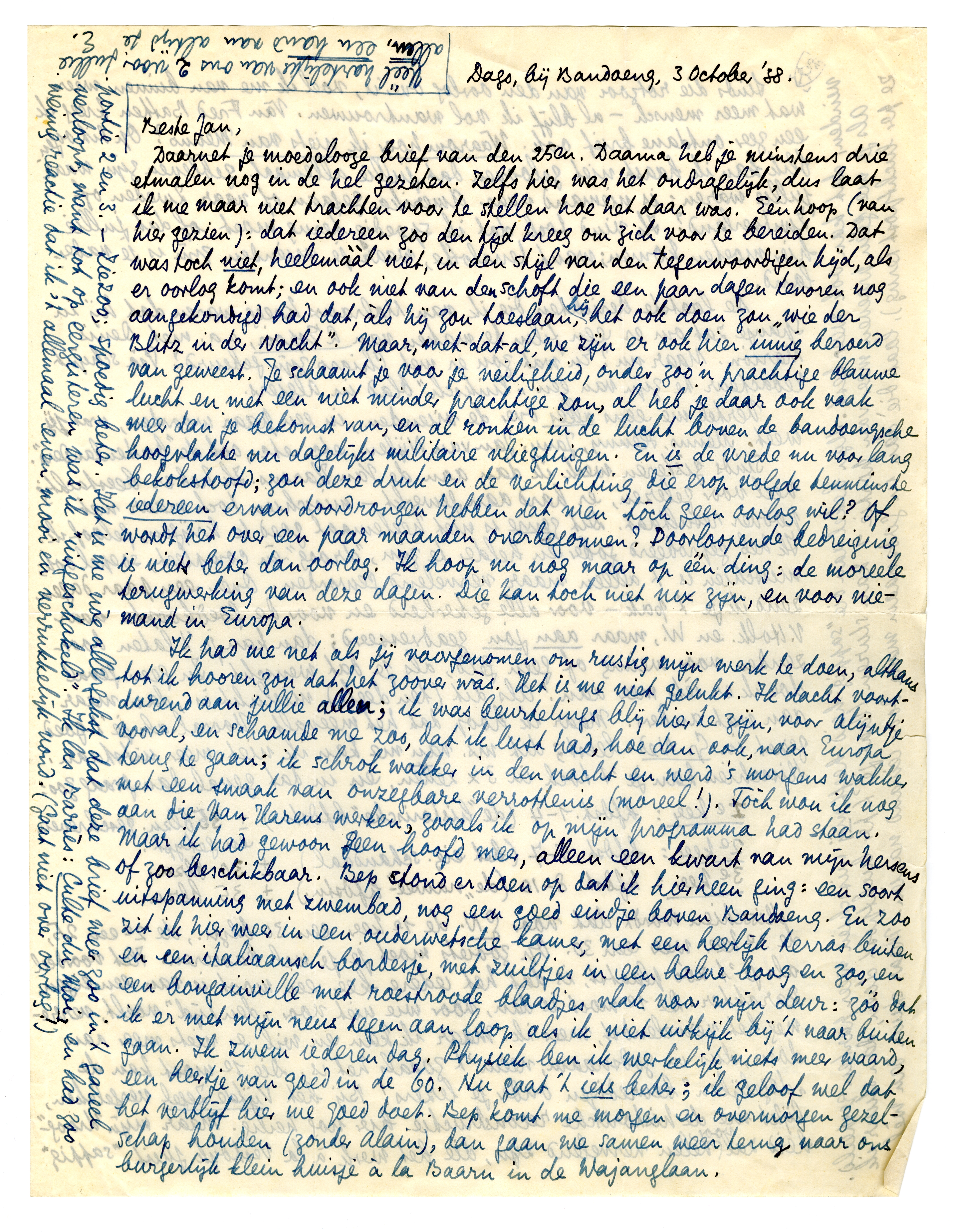 Daarnet je moedelooze brief van de 25en. Daarna heb je minstens drie etmalen nog in de hel gezeten. Zelfs hier was het ondragelijk, dus laat ik me maar niet trachten voor te stellen hoe het daar was. Eén hoop (van hier gezien): dat iedereen zoo den tijd kreeg om zich voor te bereiden. Dat was toch niet, heelemààl niet, in den stijl van den tegenwoordigen tijd, als er oorlog komt; en ook niet van den schoft die een paar dagen tevoren nog aangekondigd had dat, àls hij zou toeslaan, hij het ook doen zou ‘wie der Blitz in der Nacht’. Maar, met-dat-al, we zijn er ook hier innig beroerd van geweest. Je schaamt je voor je veiligheid, onder zoo'n prachtige blauwe lucht en met een niet minder prachtige zon, al heb je daar ook vaak meer dan je bekomst van, en al ronken in de lucht boven de bandoengsche hoogvlakte nu dagelijks militaire vliegtuigen. En is de vrede nu voor lang bekokstoofd; zou deze druk en de verlichting die erop volgde tenminste iedereen ervan doordrongen hebben dat men tòch geen oorlog wil? Of wordt het over een paar maanden overbegonnen? Doorloopende bedreiging is niets beter dan oorlog. Ik hoop nu nog maar op één ding: de moreele terugwerking van deze dagen. Die kan toch niet nix zijn, en voor niemand in Europa.