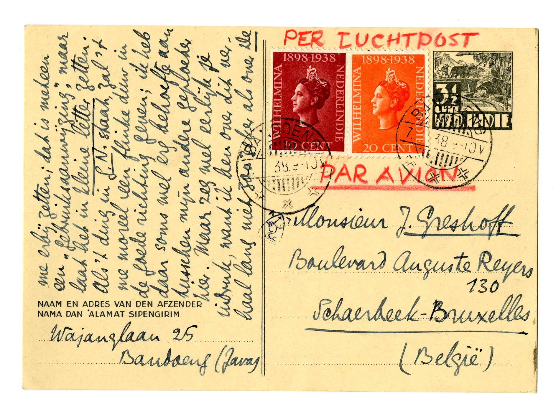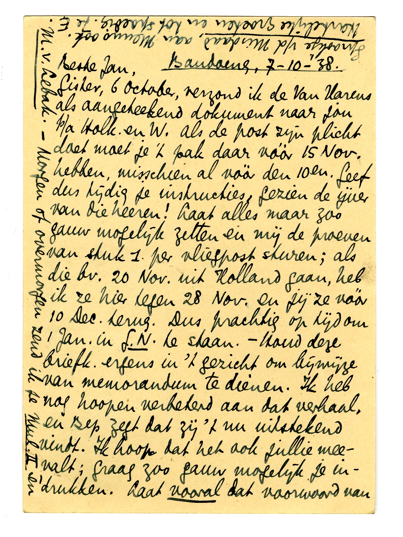 Gister, 6 October, verzond ik de Van Harens als aangeteekend dokument naar jou p/a Holk. en W. Als de post zijn plicht doet moet je 't pak daar vóór 15 Nov. hebben, misschien al vóór den 10en. Geef dus tijdig je instructies, gezien de ijver van die heeren! Laat alles maar zoo gauw mogelijk zetten en mij de proeven van stuk 1. per vliegpost sturen; als die bv. 20 Nov. uit Holland gaan, heb ik ze hier tegen 28 Nov. en jij ze vóór 10 Dec. terug. Dus prachtig op tijd om 1 Jan. in G.N. te staan. - Houd deze briefk. ergens in 't gezicht om bijwijze van memorandum te dienen. Ik heb nog hoopen verbeterd aan dat verhaal, en Bep zegt dat zij 't nu uitstekend vindt. Ik hoop dat het ook jullie meevalt; graag zoo gauw mogelijk je indrukken. Laat vooral dat voorwoord van me erbij zetten; dat is meteen een ‘gebruiksaanwijzing’, maar laat het in kleine letter zetten.5605 Als 't ding in G.N. staat, zal 't me moreel een flinke duw in de goede richting geven; ik heb daar soms wel erg behoefte aan tusschen mijn andere geploeter hier. Maar zeg wel eerlijk je indruk, want ik ben over dit verhaal lang niet zoo zeker als over De M. v. Lebak. - Morgen of overmorgen zend ik je Mul. II en Sprookje v/d Misdaad, aan Menno ook.
