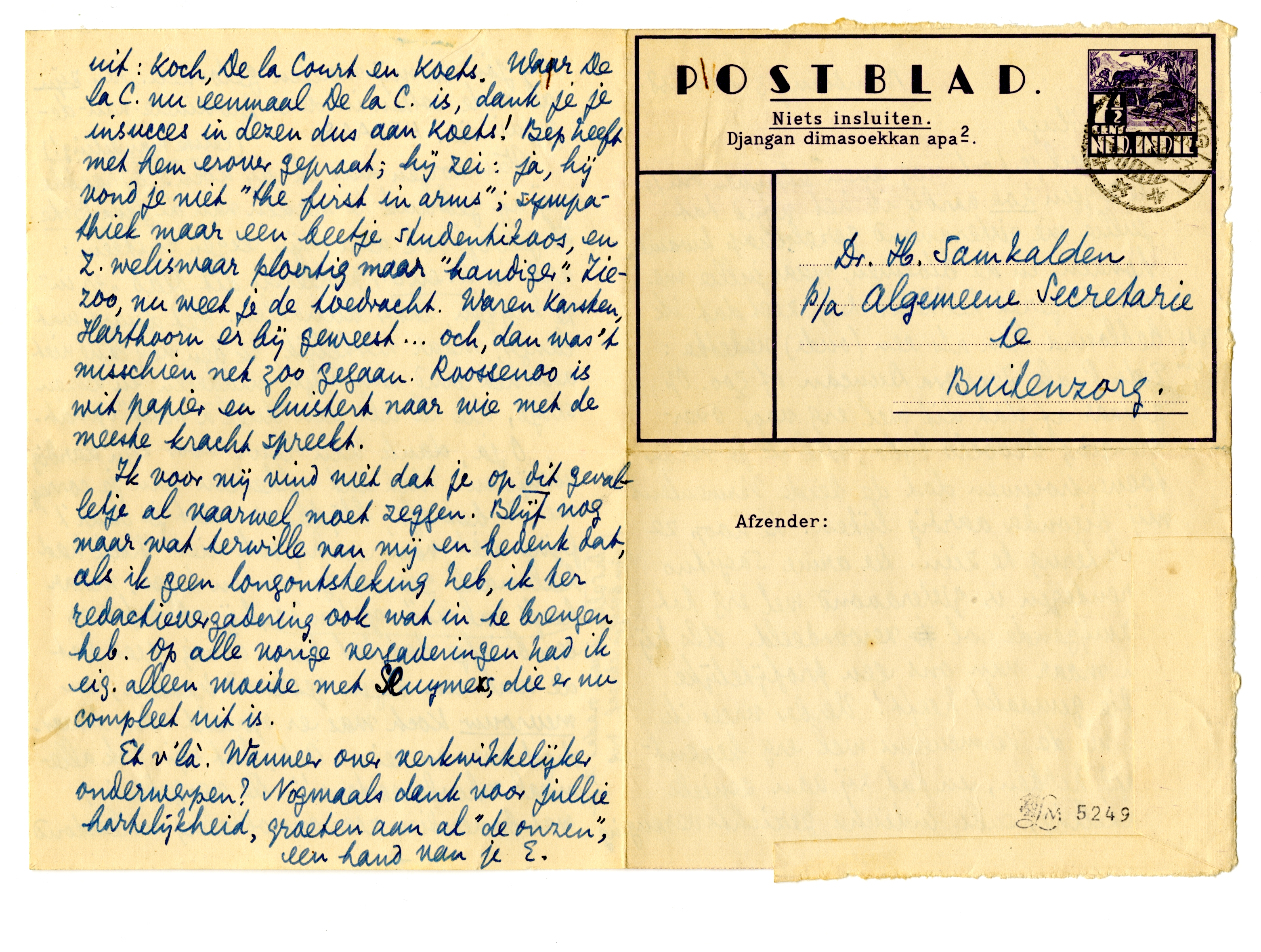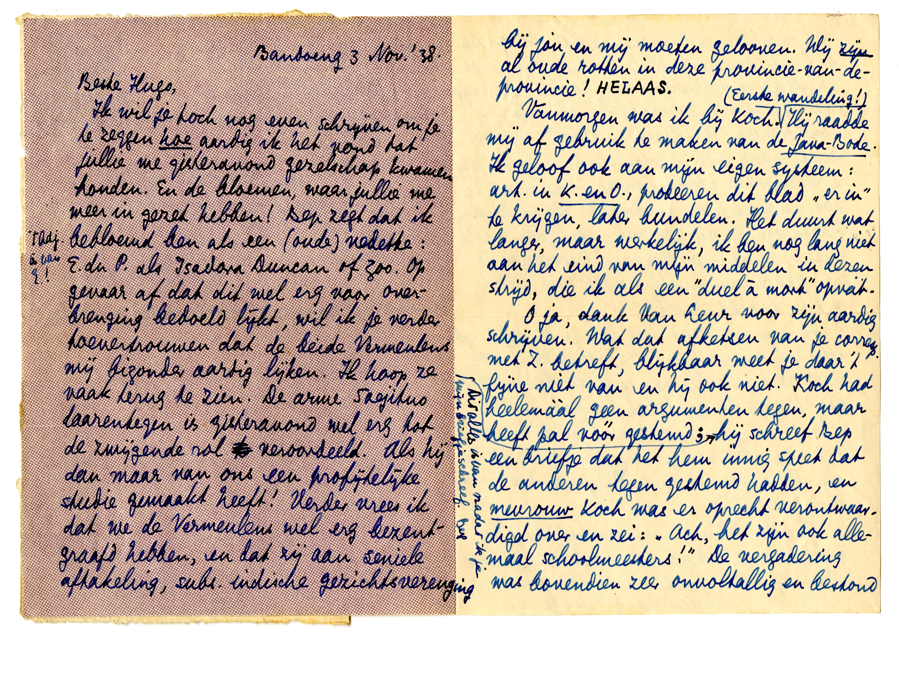 Ik wil je toch nog even schrijven om je te zeggen hoe aardig ik het vond dat jullie me gisteravond gezelschap kwamen houden. En de bloemen, waar jullie me weer in gezet hebben! Bep zegt dat ik bebloemd ben als een (oude) vedette: E. du P. als Isadora Duncan of zoo. Op gevaar af dat dit wel erg voor overbrenging bedoeld lijkt, wil ik je verder toevertrouwen dat de beide Vermeulens mij bizonder aardig lijken. Ik hoop ze vaak terug te zien. De arme Soejitno daarentegen is gisteravond wel erg tot de zwijgende rol veroordeeld. Als hij dan maar van ons een profijtelijke studie gemaakt heeft! Verder vrees ik dat we de Vermeulens wel erg bezentgraafd hebben, en dat zij aan seniele aftakeling, subs. indische gezichtsverenging bij jou en mij moeten gelooven. We zijn al oude rotten in deze provincie-van-de-provincie! HELAAS.