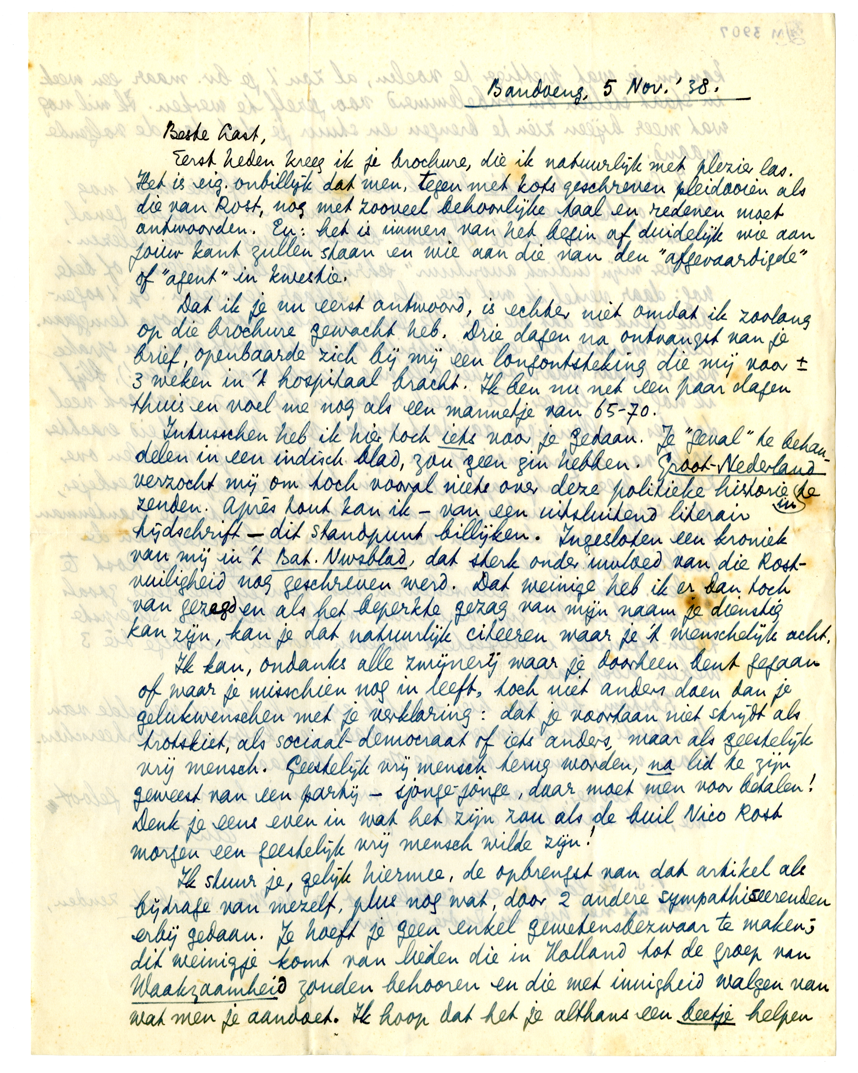 Over mijn ‘indisch avontuur’ schrijf ik je later weleens, of beter nog: daar vertel ik wel over als we elkaar terugzien. Op 't oogenblik denk ik dat we over ½ jaar uiterlijk naar Europa teruggaan. Alleen wanneer hier een tijdschrift opgericht wordt waar nu sprake van is (maar waarvoor het geld nog gezocht moet worden!), blijf ik nog wat langer. Er is veel moois in dit land, maar ook veel dat des te ellendiger aandoet omdat je de heele botheid erachter voelt van de provincie op z'n ergst. Ik spaar je verhalen over zekeren heer Zentgraaff, ploert in folio, verkapt ennesbejer, oud-sergeant, revolverjournalist en de machtigste krantenman (met alles wat daaraan vastzit aan ‘leiderschap van de publieke opinie’) en die nu bezig is hier voor mijn Nico Rost te spelen. Niet zonder kleerscheuren voor hemzelf overigens, zooals hij misschien tot zijn verbazing merkt. Maar mijn scherpste tegen-offensief is uitgesteld moeten worden, vanwege die 3 weken hospitaal.