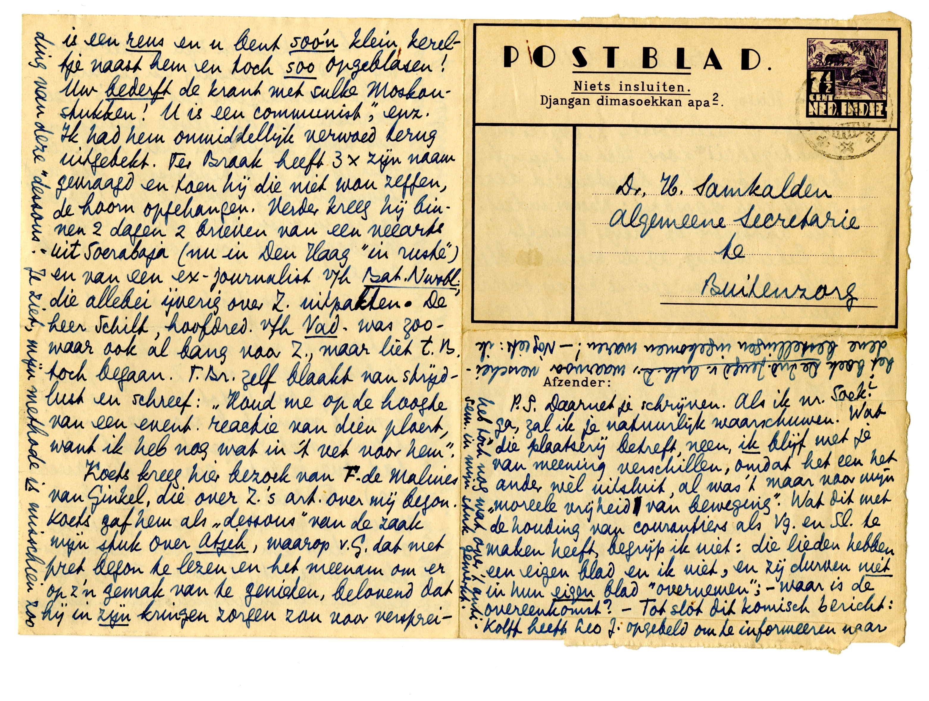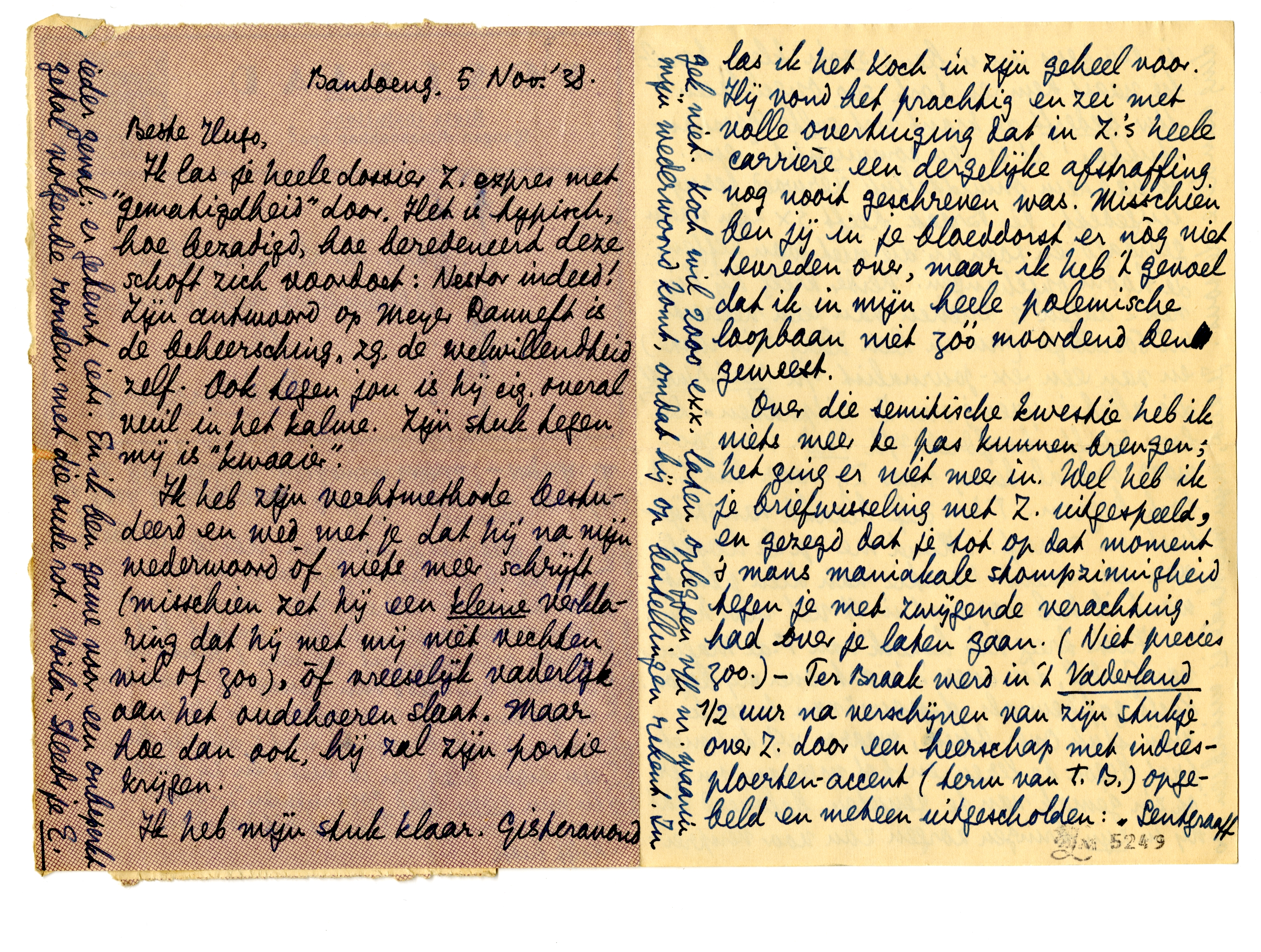 P.S. Daarnet je schrijven. Als ik nr. Soeki. ga, zal ik je natuurlijk waarschuwen. Wat die plaatserij betreft, neen, ik blijf met je van meening verschillen, omdat het een het ander wèl uitsluit, al was 't maar voor mijn ‘moreele vrijheid van beweging’. Wat dit met de houding van courantiers als Vg. en Sl.5642 te maken heeft, begrijp ik niet: die lieden hebben een eigen blad en ik niet, en zij durven niet in hun eigen blad ‘overnemen’; - waar is de overeenkomst? - Tot slot dit komisch bericht: Kolff heeft Leo J. opgebeld om te informeeren naar het boek De Ind. Jeugd v. Arth. D.5643 waarvoor verscheidene bestellingen ingekomen waren! Nòg iets: ik heb tòch nog wat over 't antisem. in mijn stuk gewerkt.