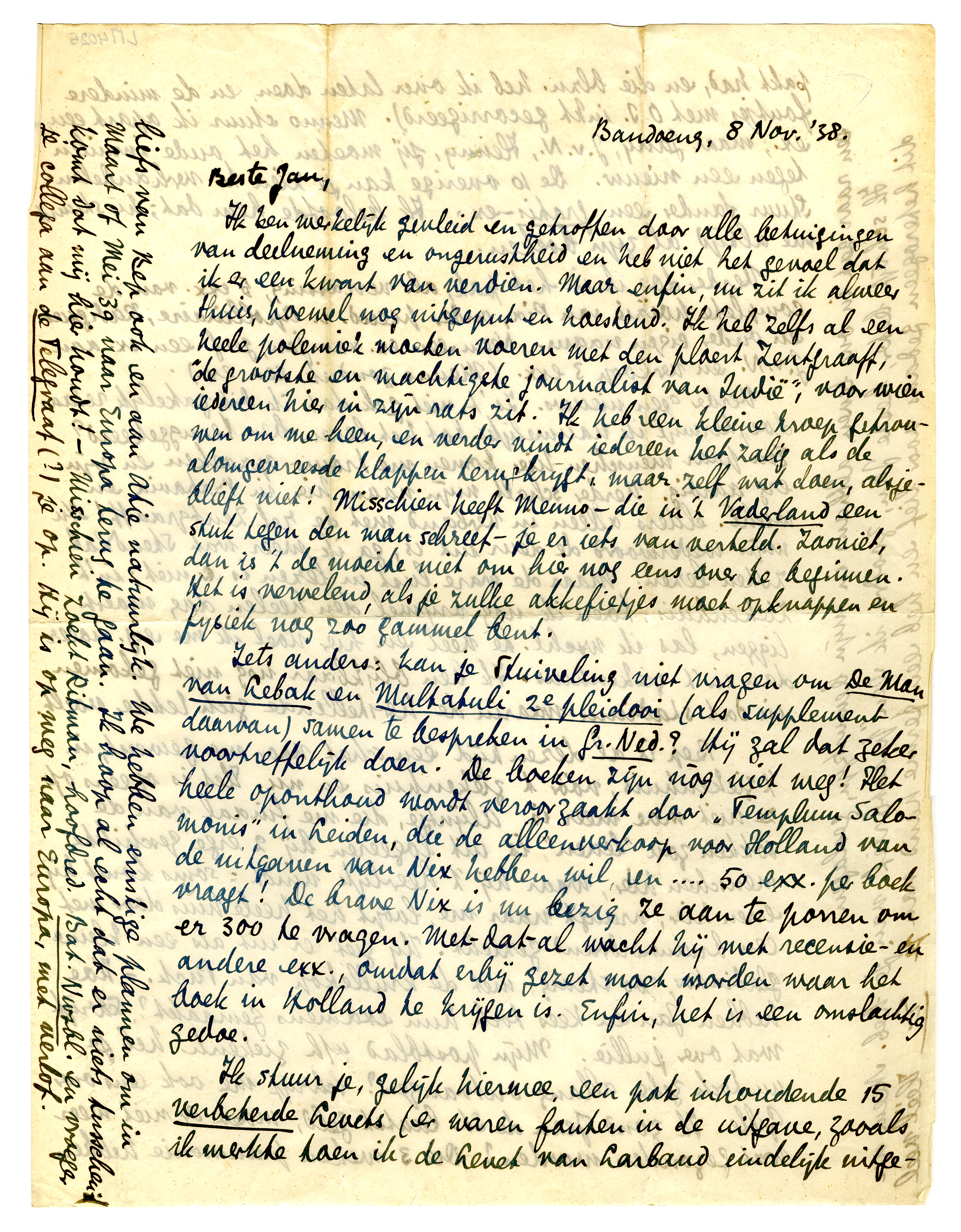 Ik ben werkelijk gevleid en getroffen door alle betuigingen van deelneming en ongerustheid en heb niet het gevoel dat ik er een kwart van verdien. Maar enfin, nu zit ik alweer thuis, hoewel nog uitgeput en hoestend. Ik heb zelfs al een heele polemiek moeten voeren met den ploert Zentgraaff,5647 ‘de grootste en machtigste journalist van Indië’, voor wien iedereen hier in zijn rats zit. Ik heb een kleine troep getrouwen om me heen, en verder vindt iedereen het zalig als de alomgevreesde klappen terugkrijgt, maar zelf wat doen, alsjeblieft niet! Misschien heeft Menno - die in 't Vaderland een stuk tegen den man schreef - je er iets van verteld. Zooniet, dan is 't de moeite niet om hier nog eens over te beginnen. Het is vervelend, als je zulke akkefietjes moet opknappen en fysiek nog zoo gammel bent.
