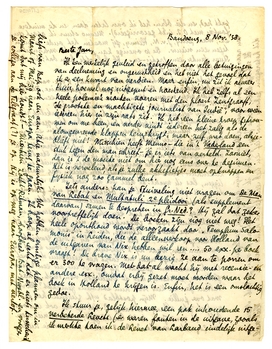 Héél veel liefs van Bep ook en aan Atie natuurlijk. We hebben ernstige plannen om in Maart of Mei '39 naar Europa terug te gaan. Ik hoop al echt dat er niets tusschen komt dat mij hier houdt! - Misschien zoekt Ritman, hoofdred. Bat. Nwsbl. en vroeger je collega aan de Telegraaf (?) je op. Hij is op weg naar Europa, met verlof.
