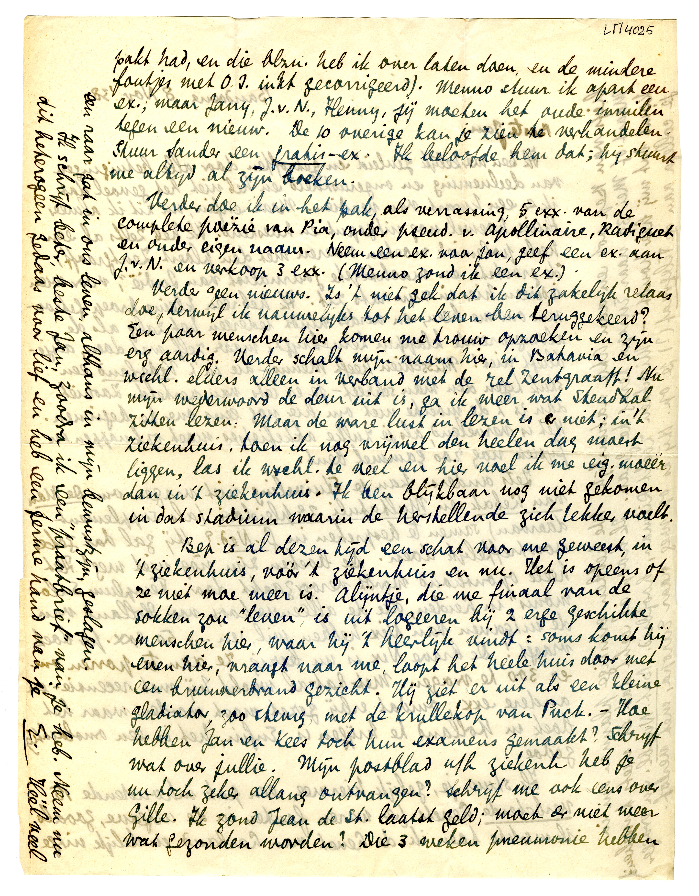 Ik stuur je, gelijk hiermee, een pak inhoudende 15 verbeterde Levets (er waren fouten in de uitgave, zooals ik merkte toen ik de Levet van Larbaud eindelijk uitgepakt had, en die blzn. heb ik over laten doen, en de mindere foutjes met O.I. inkt gecorrigeerd). Menno stuur ik apart een ex., maar Jany, J.V.N., Henny, jij moeten het oude inruilen tegen een nieuw. De 10 overige kan je zien te verhandelen. Stuur Sander een gratis-ex. Ik beloofde hem dat; hij stuurt me altijd al zijn boeken.