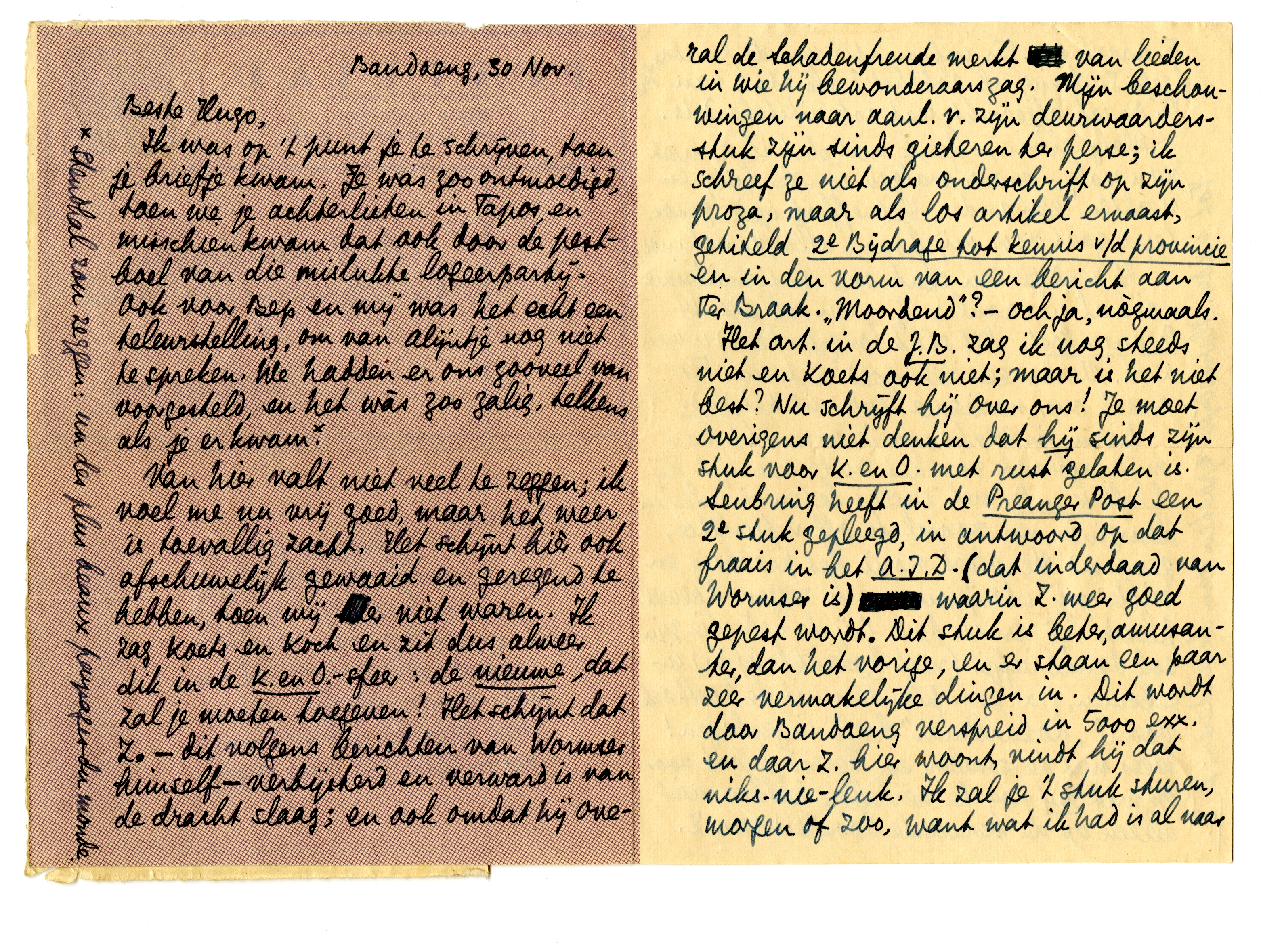 Het art. in de J.B. zag ik nog steeds niet en Koets ook niet; maar is het niet best? Nu schrijft hij over ons! Je moet overigens niet denken dat hij sinds zijn stuk voor K. en O. met rust gelaten is. Seubring heeft in de Preanger Post een 2e stuk gepleegd, in antwoord op dat fraais in het A.I.D. (dat inderdaad van Wormser is) waarin Z. weer goed gepest wordt.5699 Dit stuk is beter, amusanter, dan het vorige, en er staan een paar zeer vermakelijke dingen in. Dit wordt door Bandoeng verspreid in 5000 exx. en daar Z. hier woont, vindt hij dat niksnie-leuk. Ik zal je 't stuk sturen, morgen of zoo, want wat ik had is al naar Ter Braak toe. Ter informatie van de Bandoengers heeft Seubring nl. ook het heele stuk van Ter Braak afgedrukt, wat ook uitstekend is.